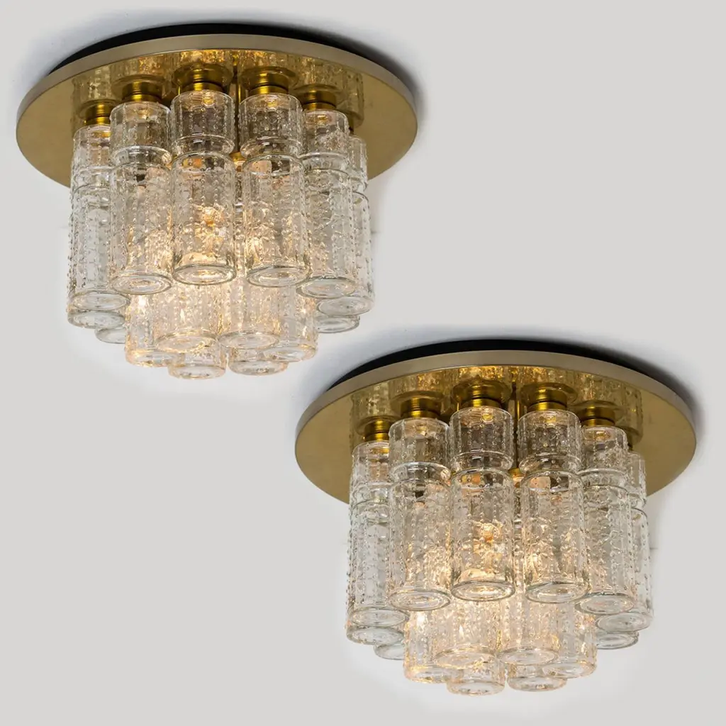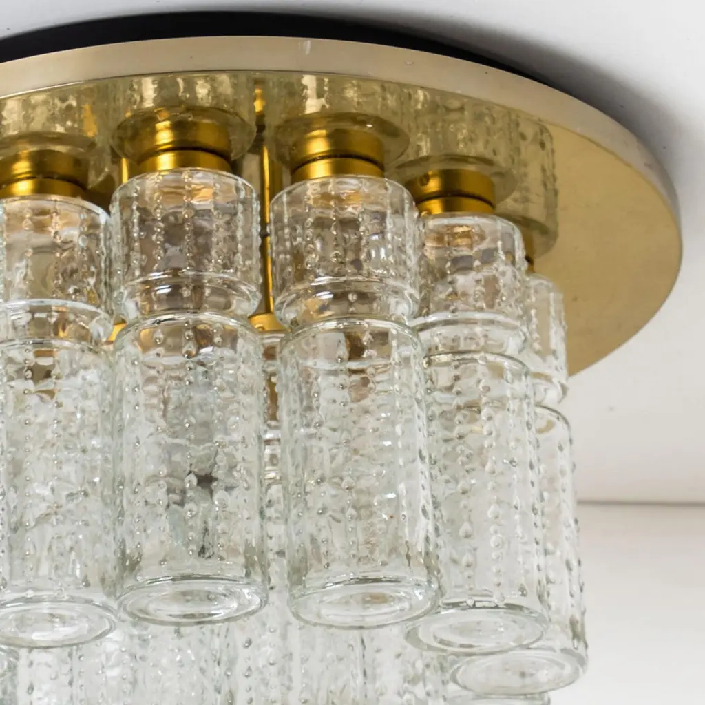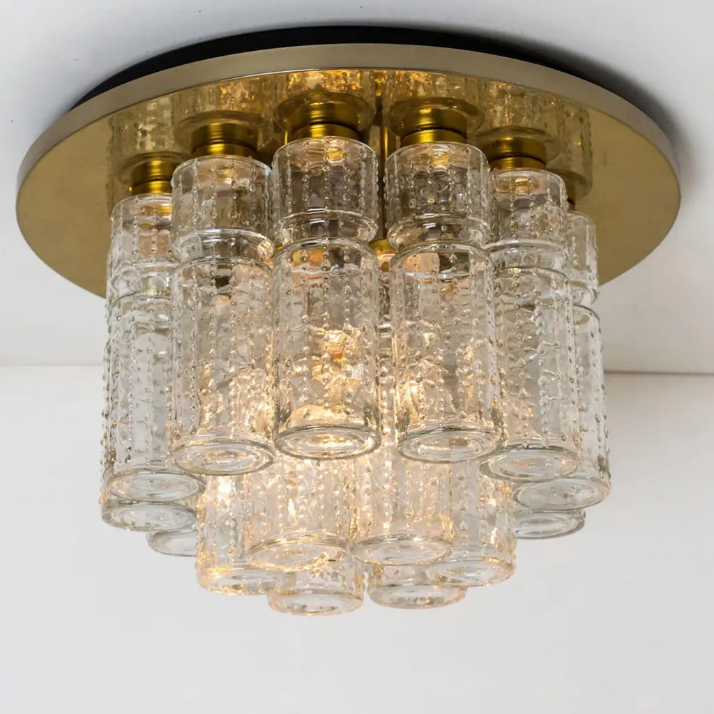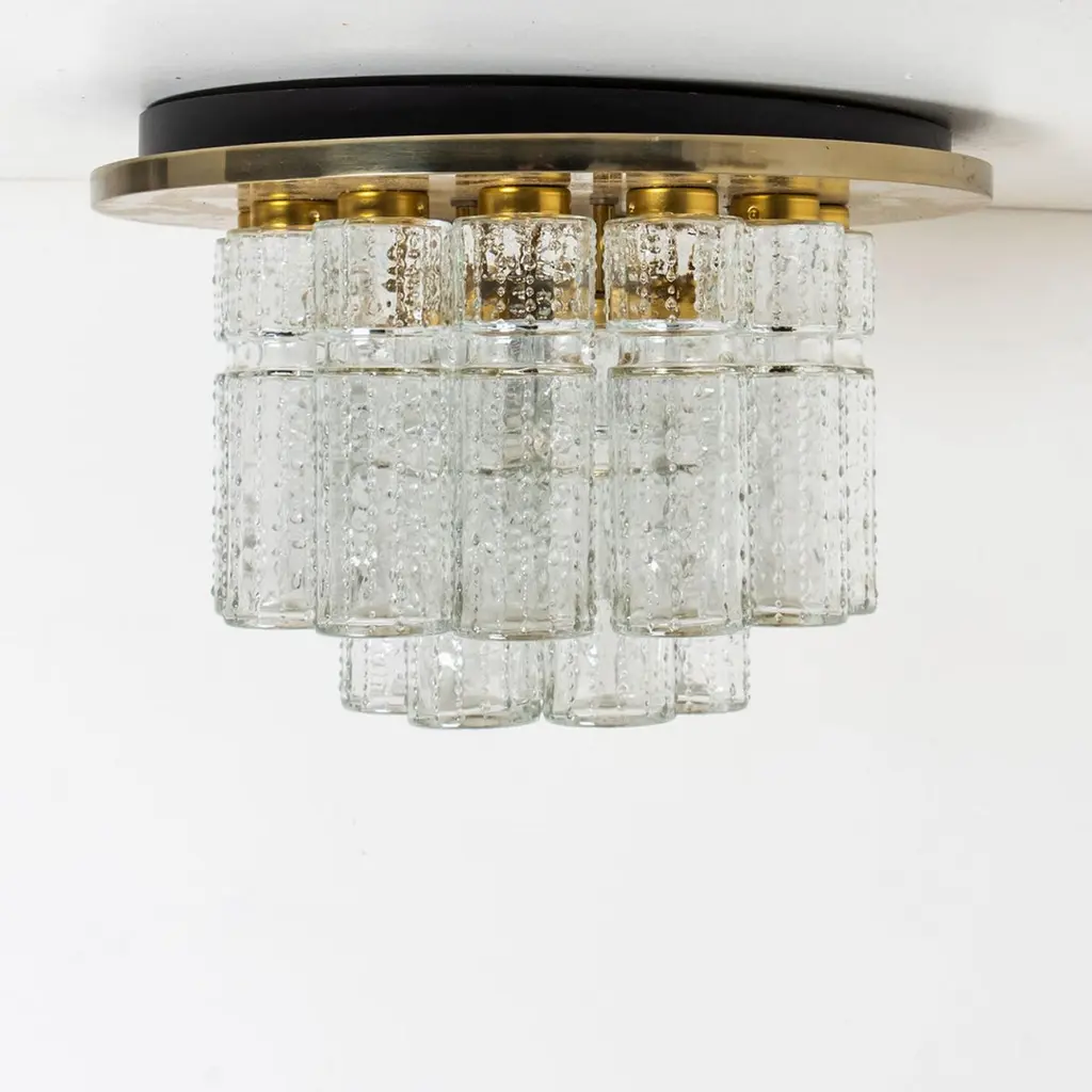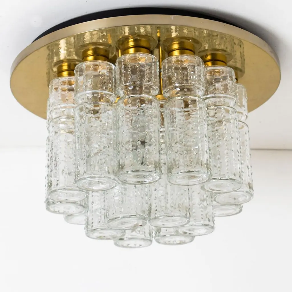 One of the two amazing flush mount chandeliers with 18 hanging hand blow textured hollow glass prisms mounted on a brass frame.Made by Glashütte Limburg in Germany model number 3170 and designed by Boris Tabacoff in the 1970s. Excellent original condition. Fitted with four E27 sockets 60 watts each.