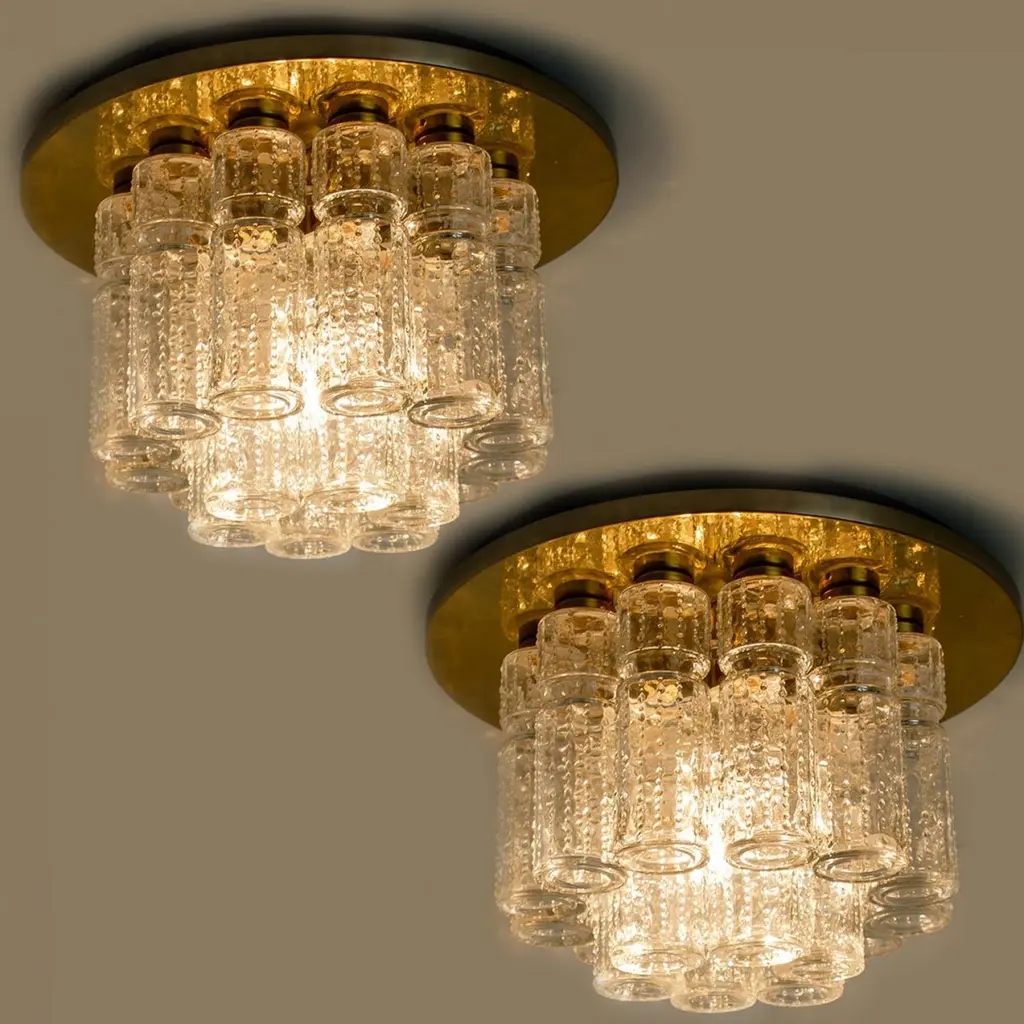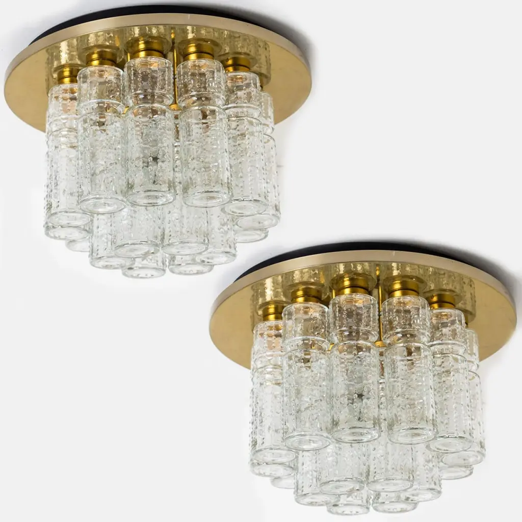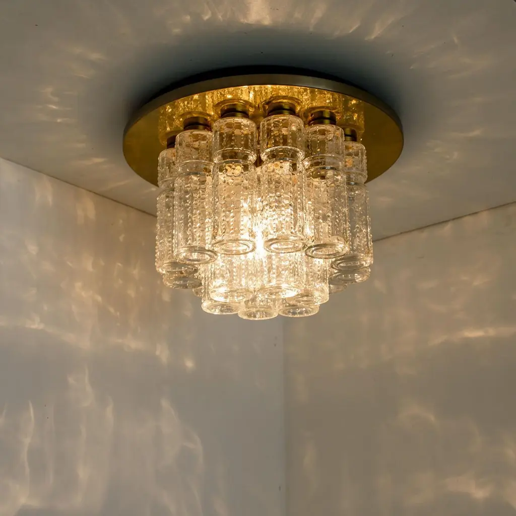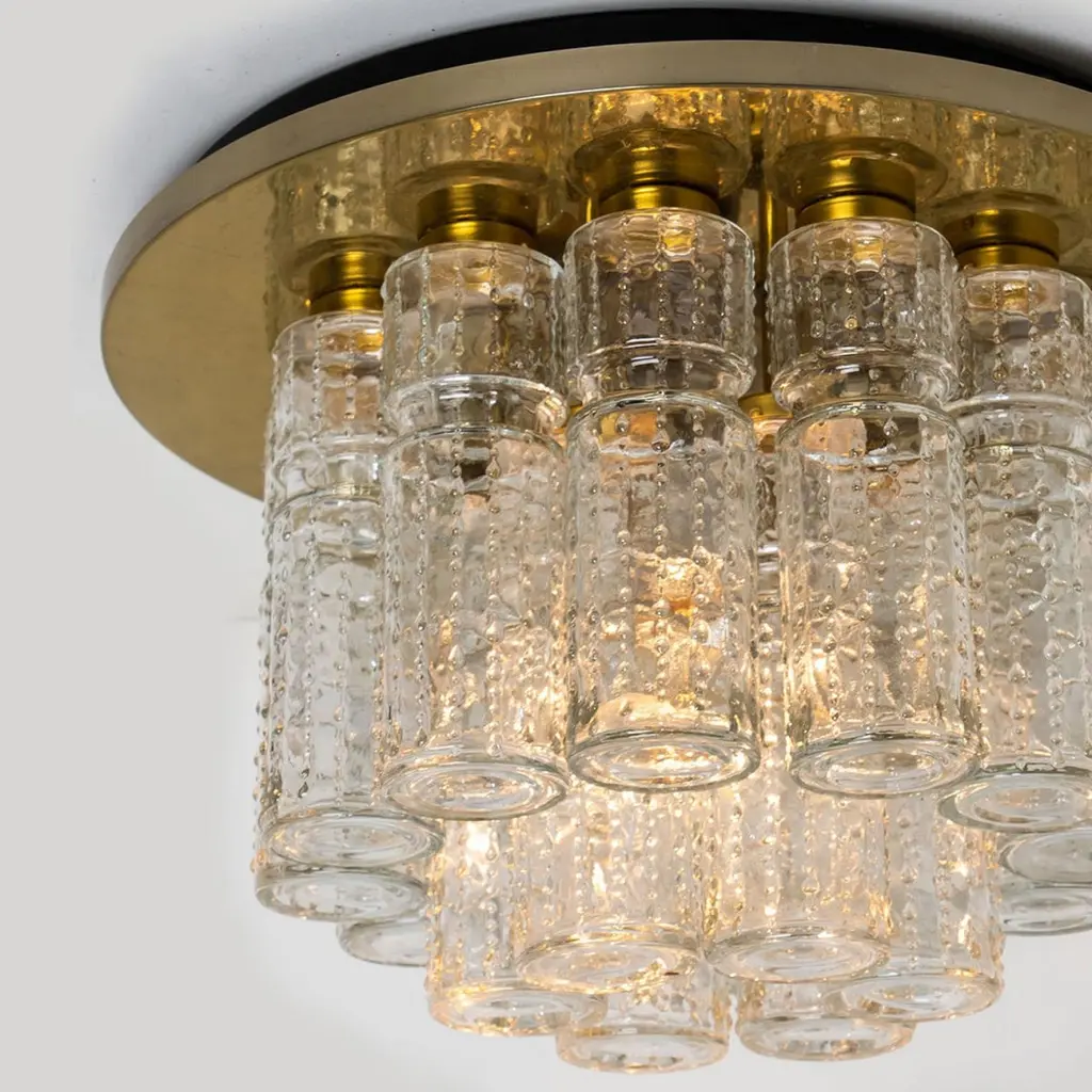 One of the two amazing flush mount chandeliers with 18 hanging hand blow textured hollow glass prisms mounted on a brass frame.Made by Glashütte Limburg in Germany model number 3170 and designed by Boris Tabacoff in the 1970s. Excellent original condition. Fitted with four E27 sockets 60 watts each.