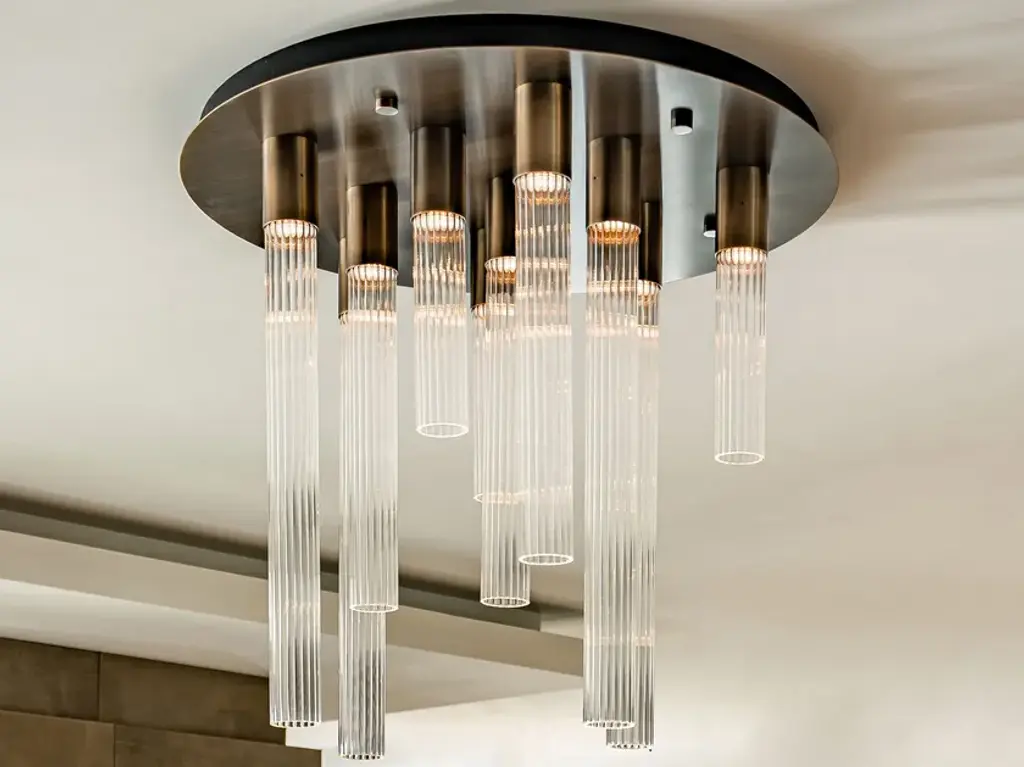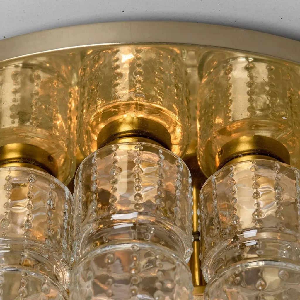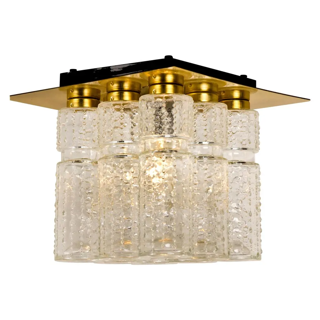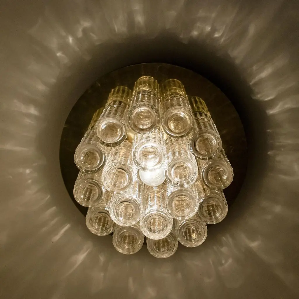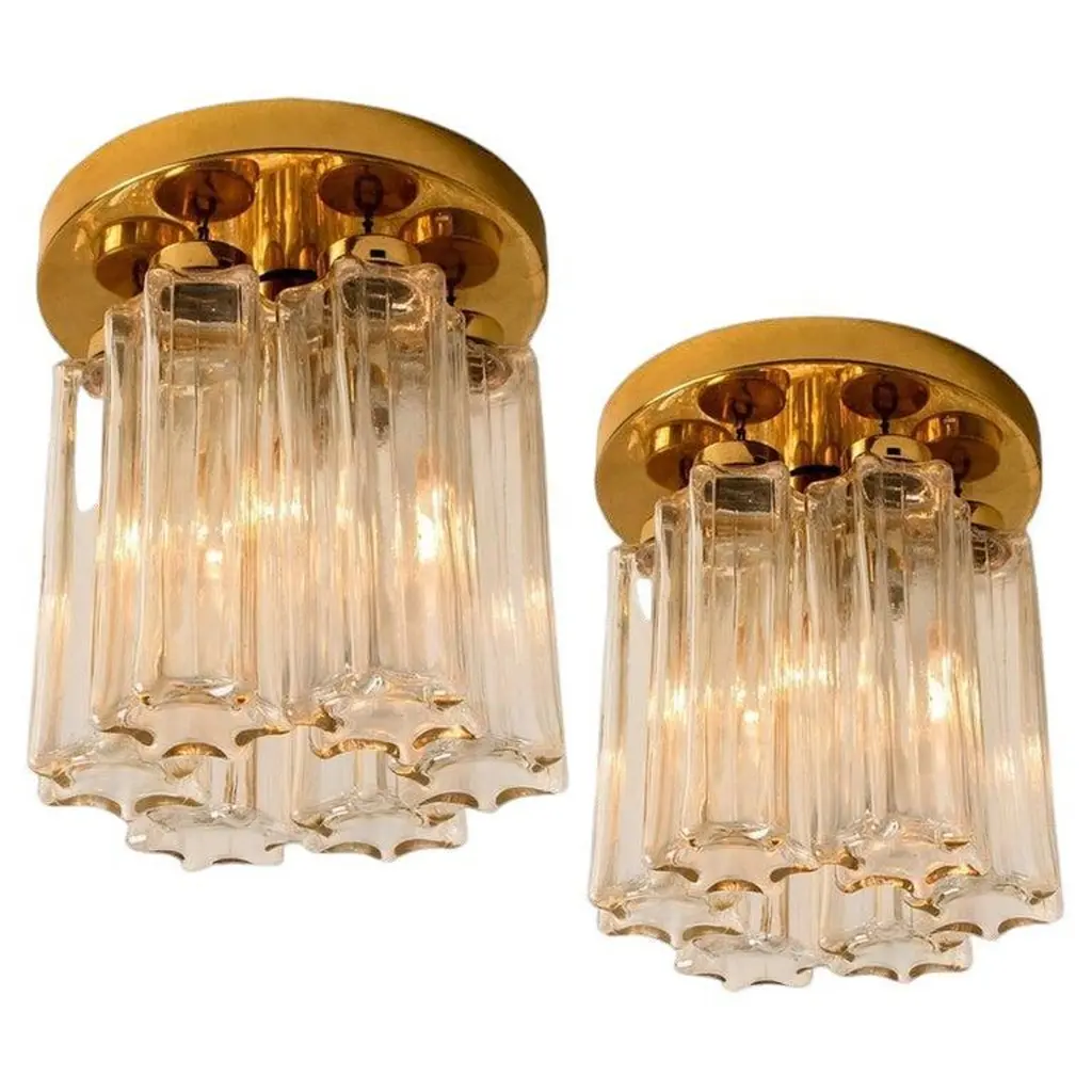 One of the two amazing flush mount chandeliers with 18 hanging hand blow textured hollow glass prisms mounted on a brass frame.Made by Glashütte Limburg in Germany model number 3170 and designed by Boris Tabacoff in the 1970s. Excellent original condition. Fitted with four E27 sockets 60 watts each.