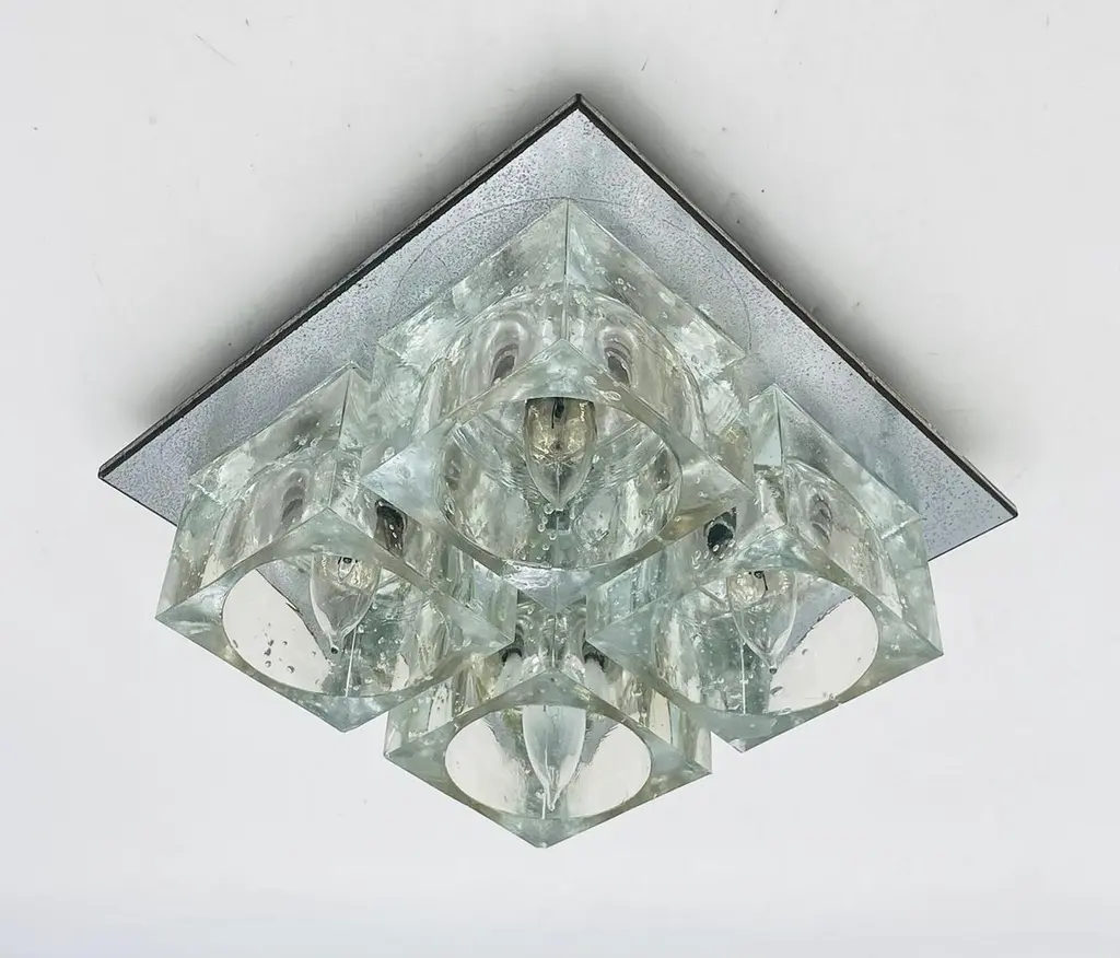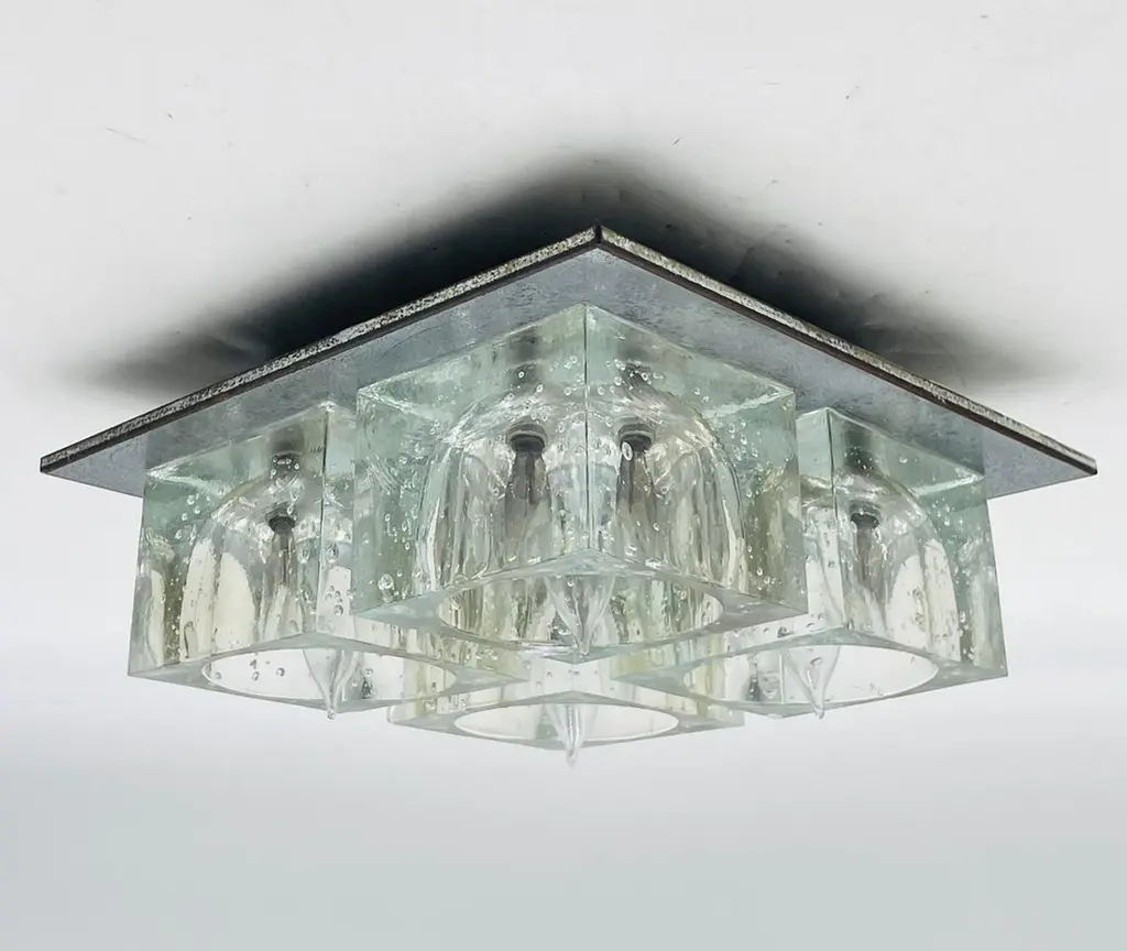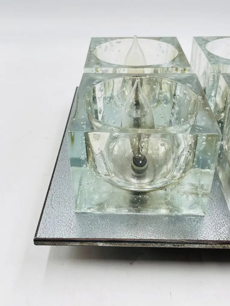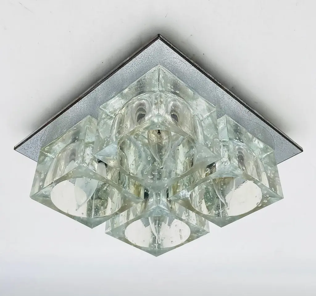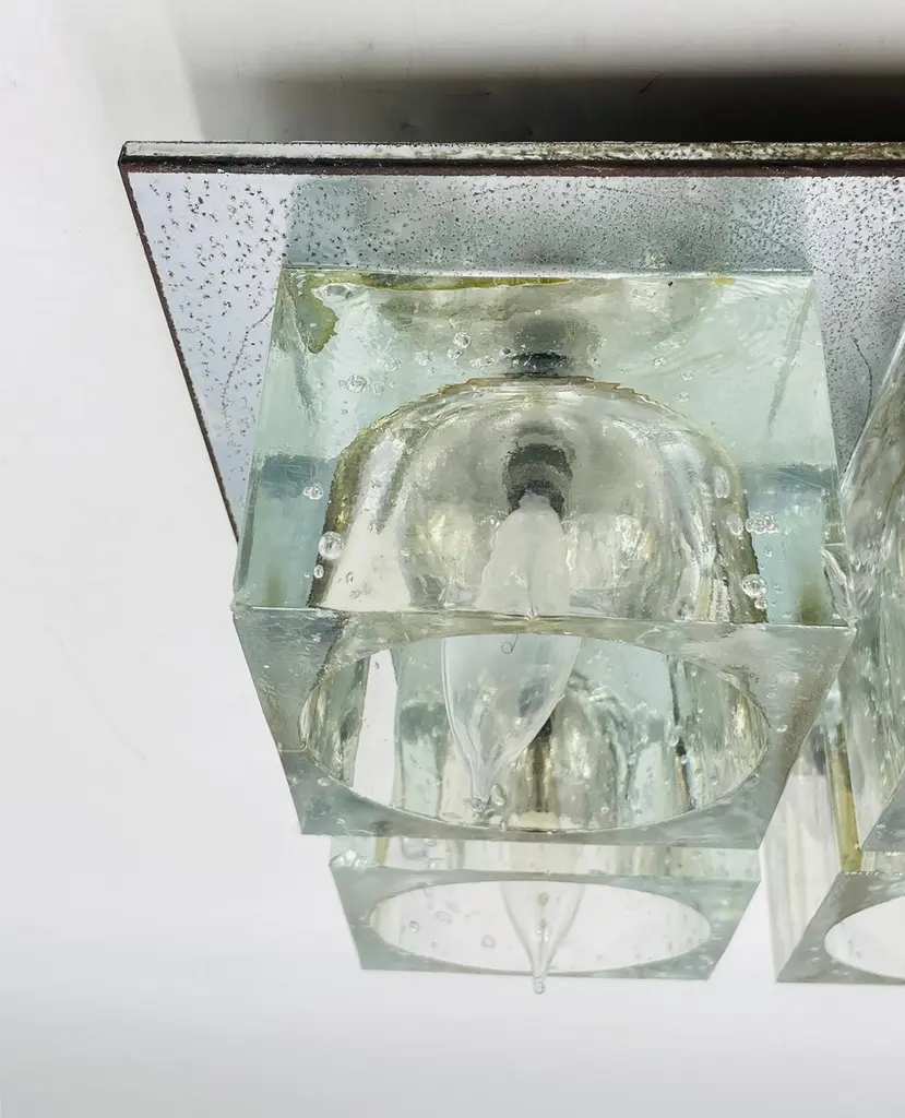 This brilliant Mid-Century Modern flush mount chandelier was realized by the esteemed Italian glass blower Gaetano Sciolari for Lightolier, circa 1970. It features four thick translucent Murano glass cubed shades with inset bulbs attached to a close fitting chrome backplate. This dynamic design consisting of contrasting curvilinear and geometric forms has proven to have a timeless appeal, offering a sensibility that is just as modern and desirable now as when it was created some fifty plus years ago. The piece retains the original Lightolier paper label.Measurements; 11.50 inches high x 11.50 inches deep x 5 inches high/projection from ceiling.
