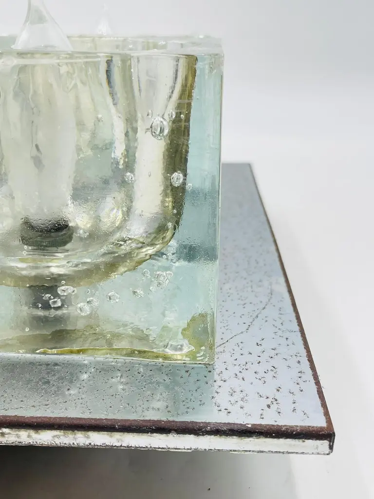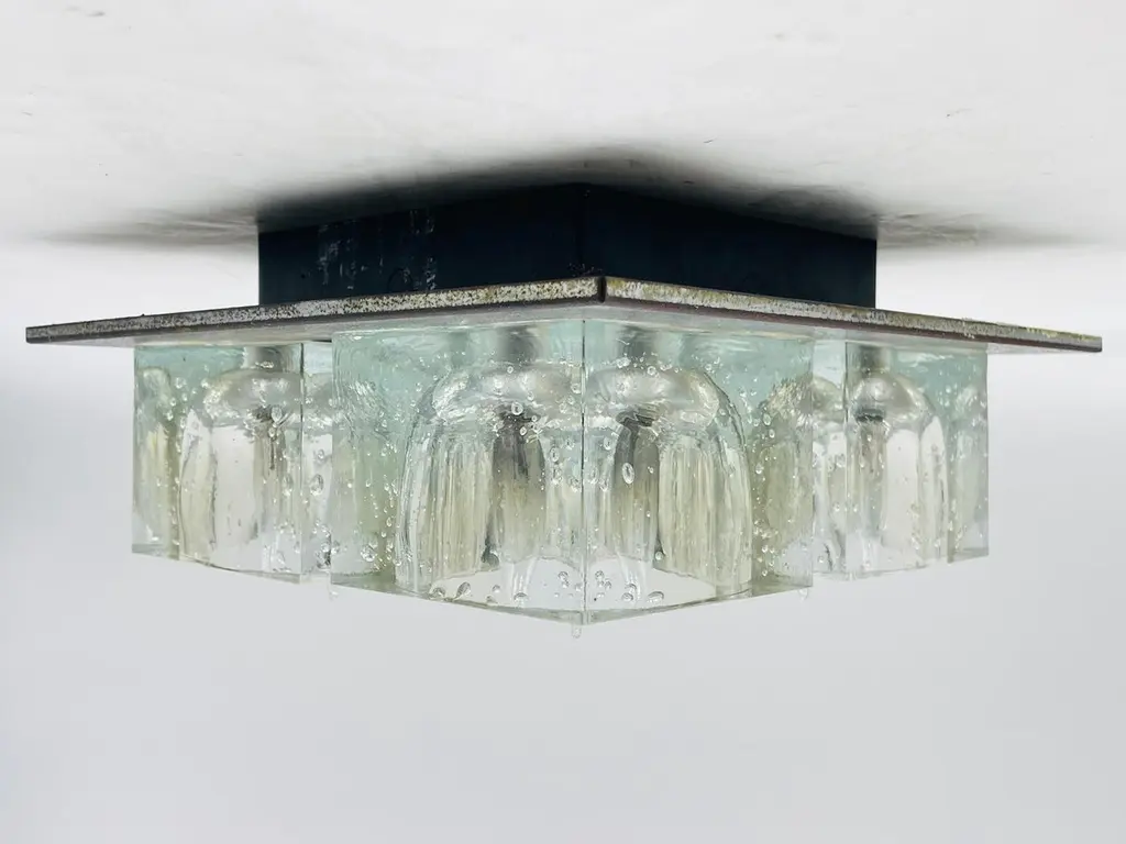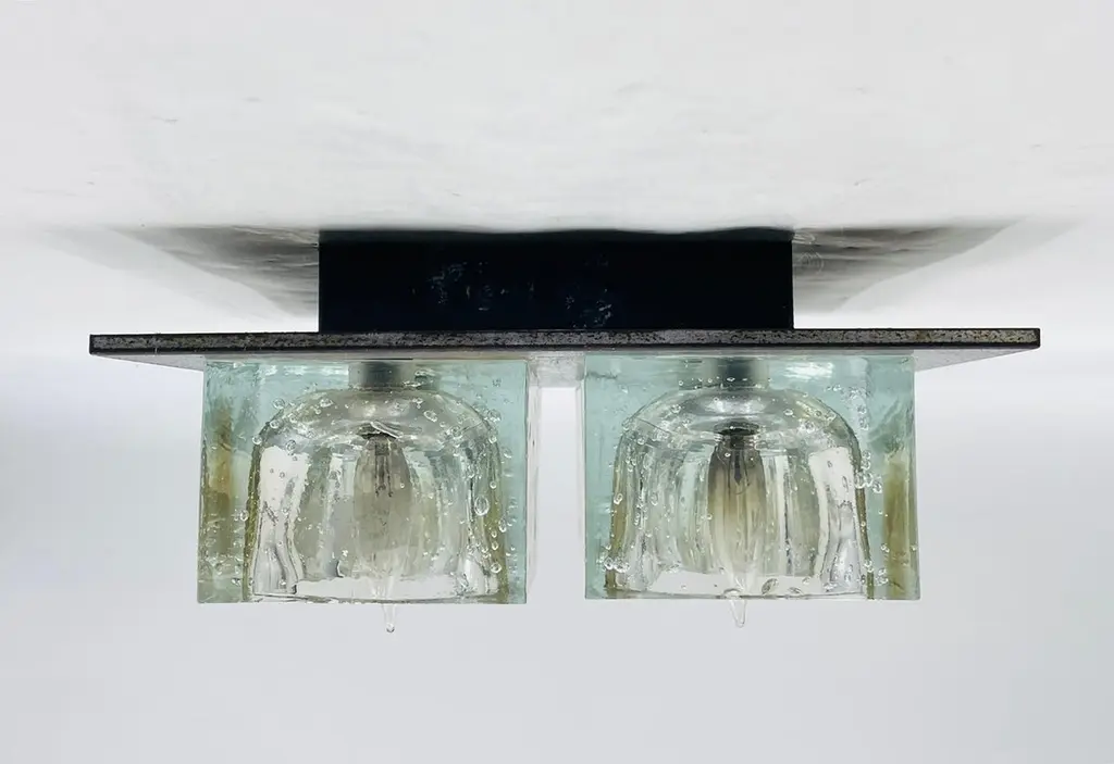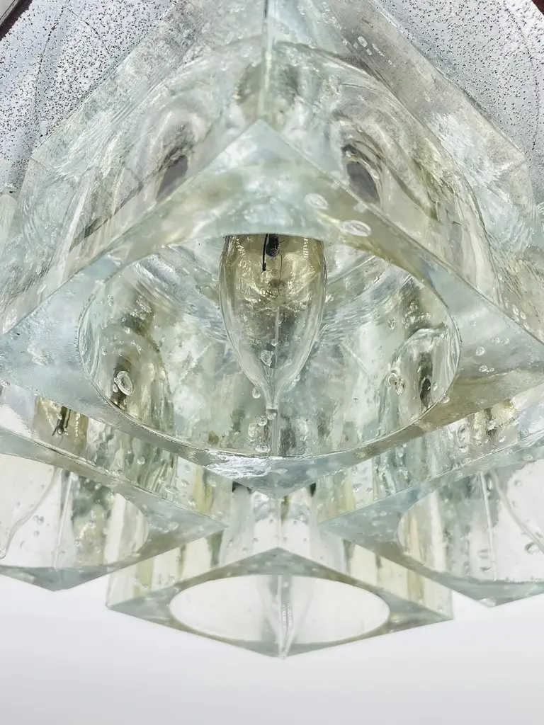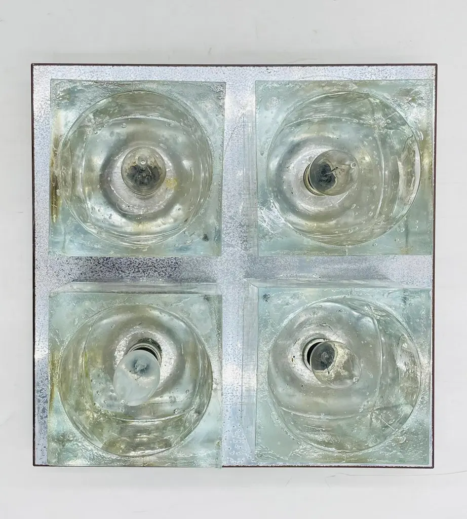 This brilliant Mid-Century Modern flush mount chandelier was realized by the esteemed Italian glass blower Gaetano Sciolari for Lightolier, circa 1970. It features four thick translucent Murano glass cubed shades with inset bulbs attached to a close fitting chrome backplate. This dynamic design consisting of contrasting curvilinear and geometric forms has proven to have a timeless appeal, offering a sensibility that is just as modern and desirable now as when it was created some fifty plus years ago. The piece retains the original Lightolier paper label.Measurements; 11.50 inches high x 11.50 inches deep x 5 inches high/projection from ceiling.