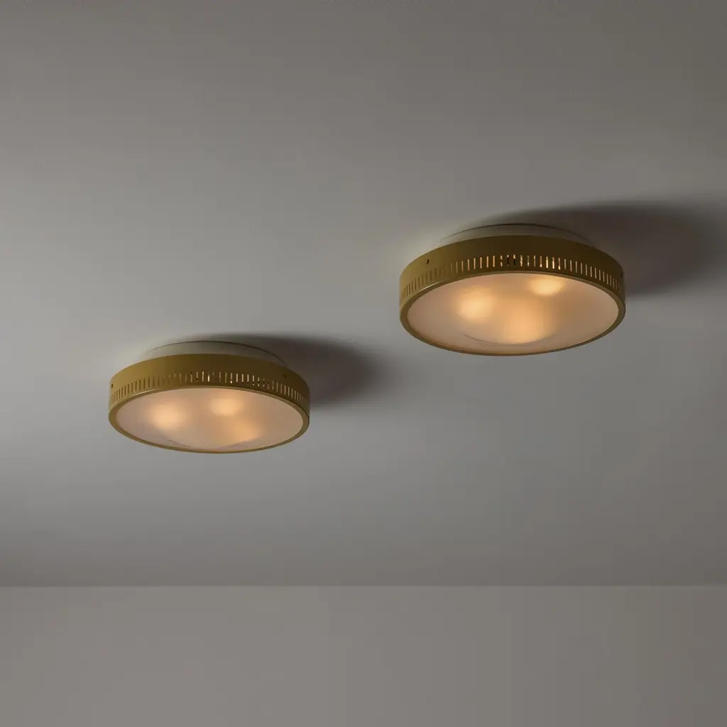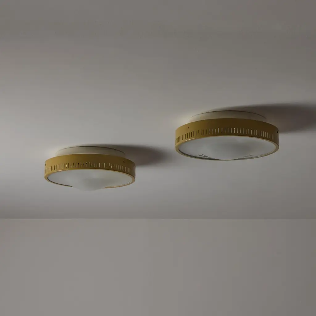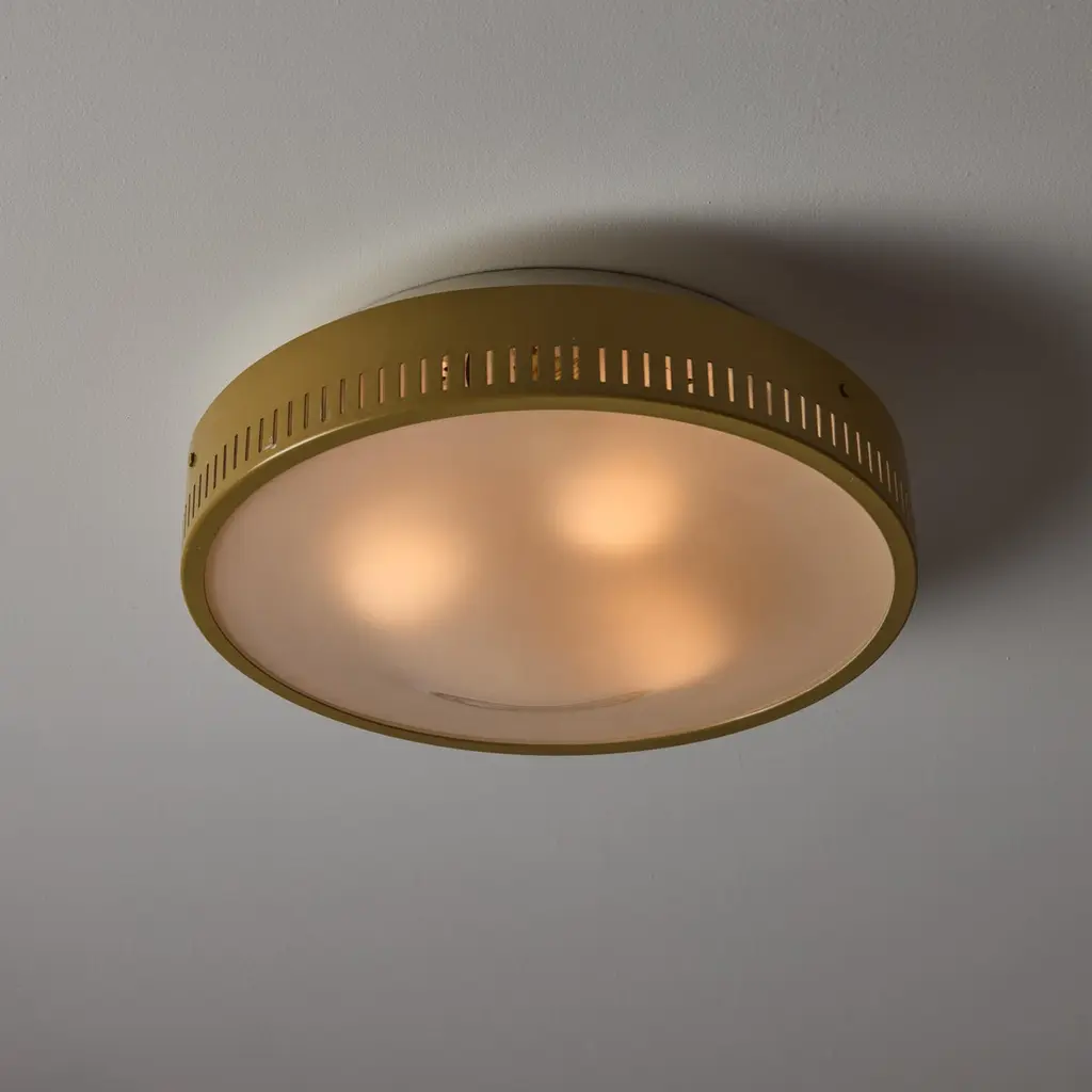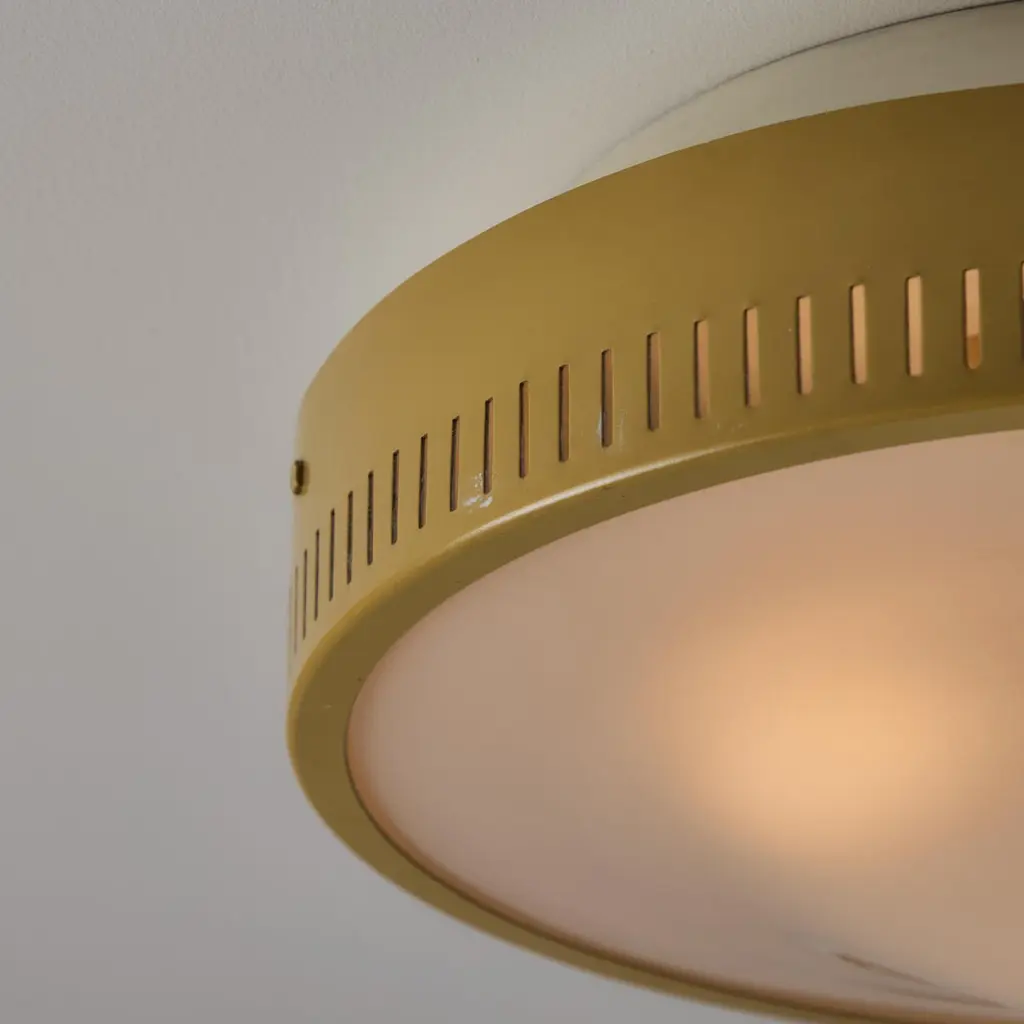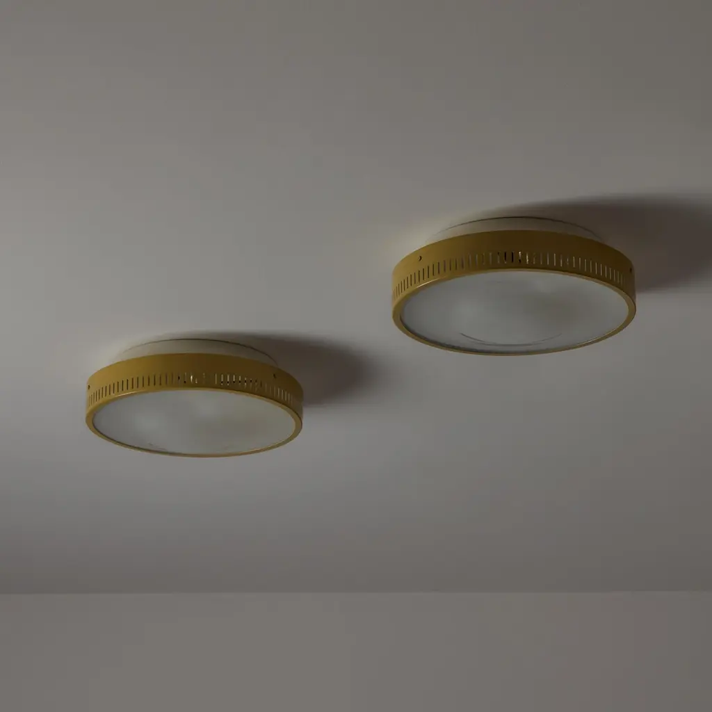 Flushmounts by Stilnovo. Designed and manufactured in Italy, circa the 1950s. Tan-colored outer housing rings meet with an etched glass diffuser. The outer housing is detailed with 360 degree slits which double as ventilation as well as a decorative touch; very common with Stilnovo lighting. Rewired for the US. Each light receives a tri-socket, adapted for the US. We recommend a 25-40w max bulb per socket. Sold individually.