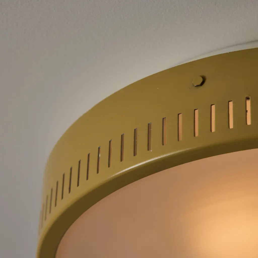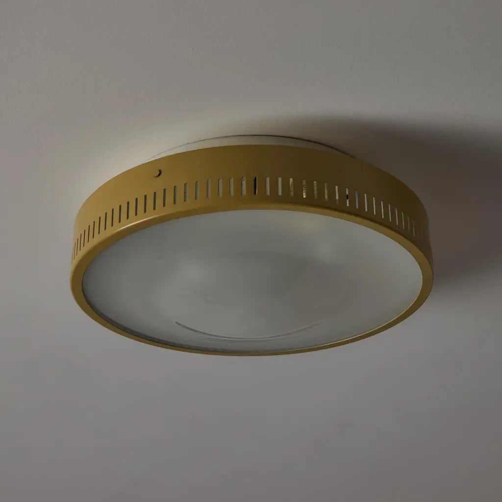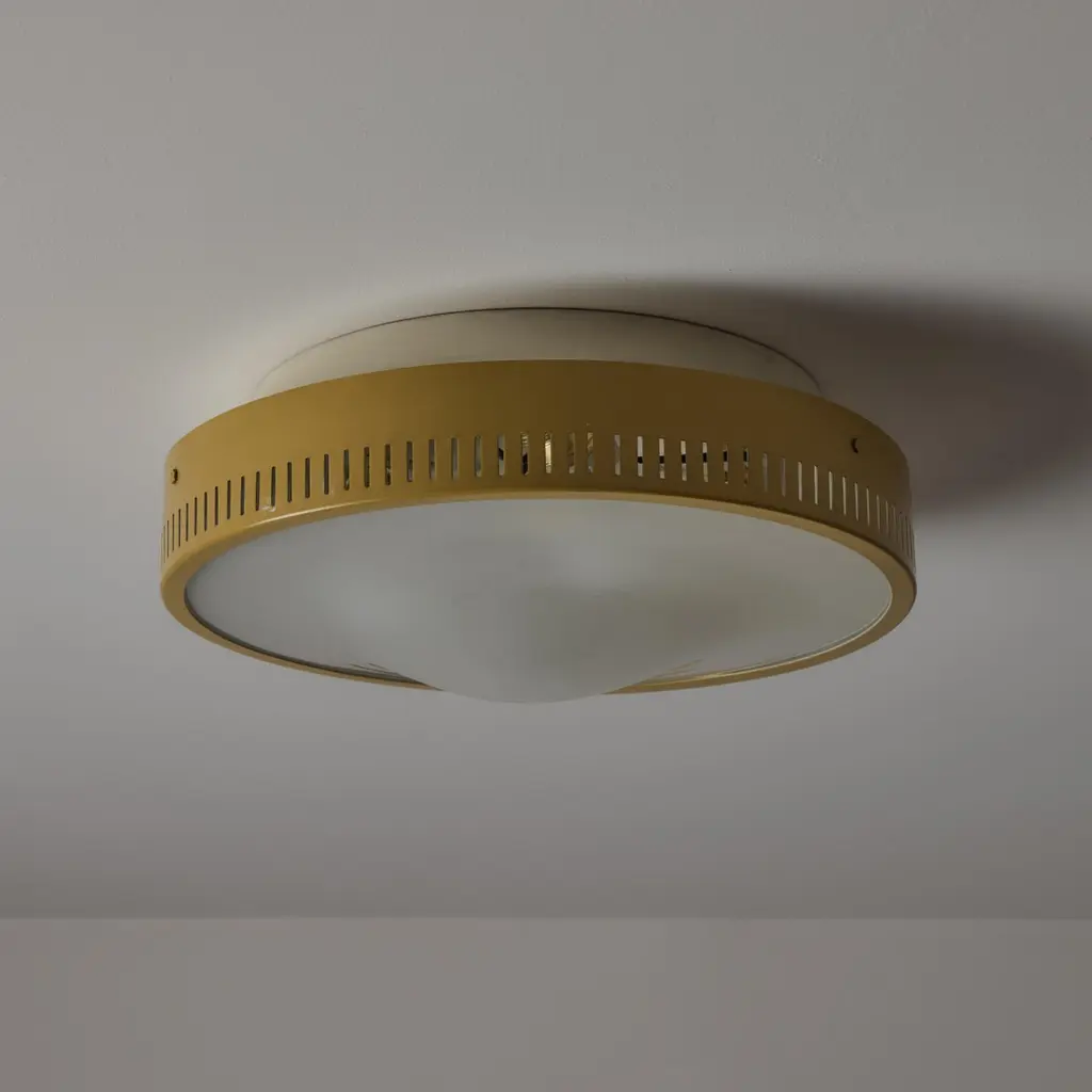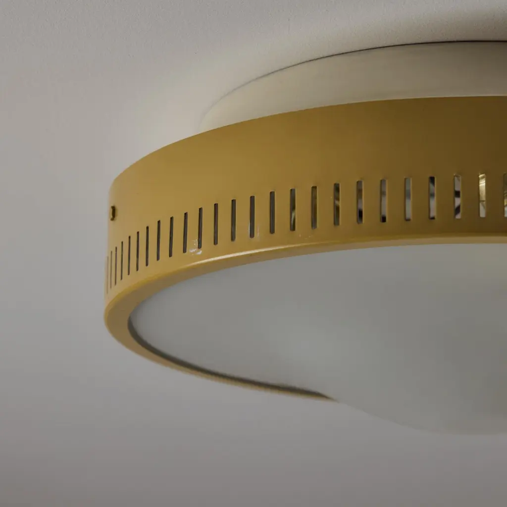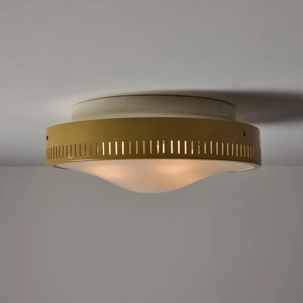 Flushmounts by Stilnovo. Designed and manufactured in Italy, circa the 1950s. Tan-colored outer housing rings meet with an etched glass diffuser. The outer housing is detailed with 360 degree slits which double as ventilation as well as a decorative touch; very common with Stilnovo lighting. Rewired for the US. Each light receives a tri-socket, adapted for the US. We recommend a 25-40w max bulb per socket. Sold individually.