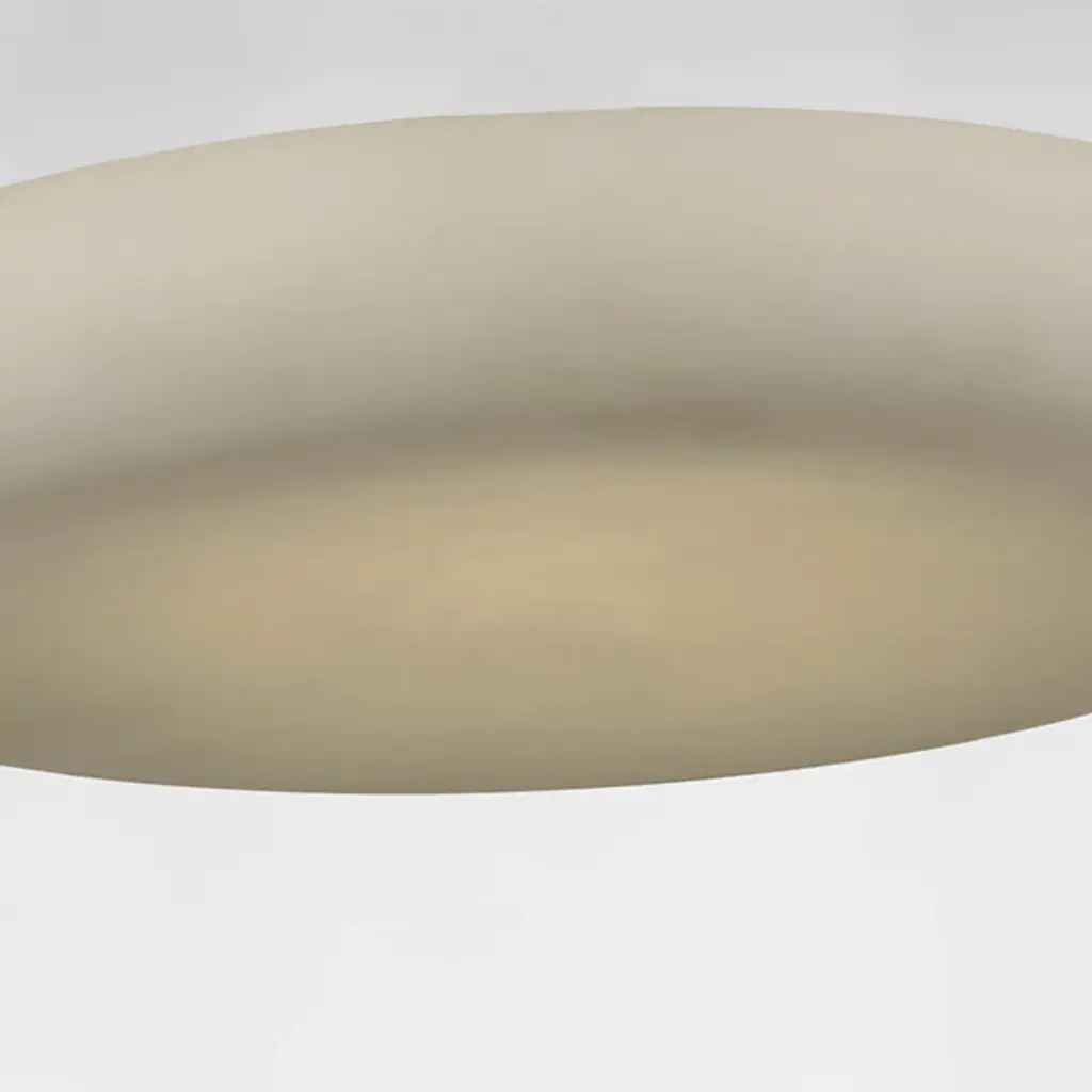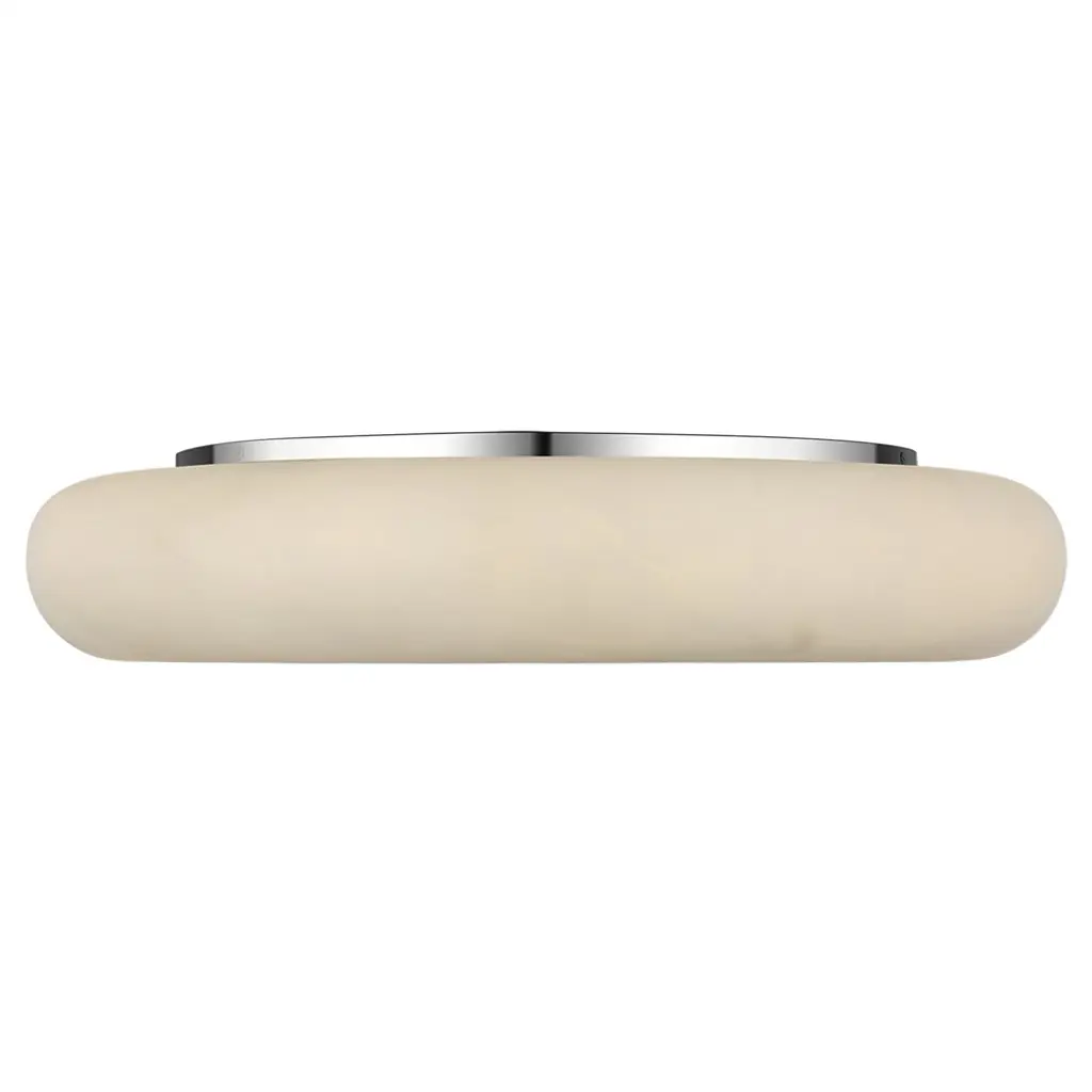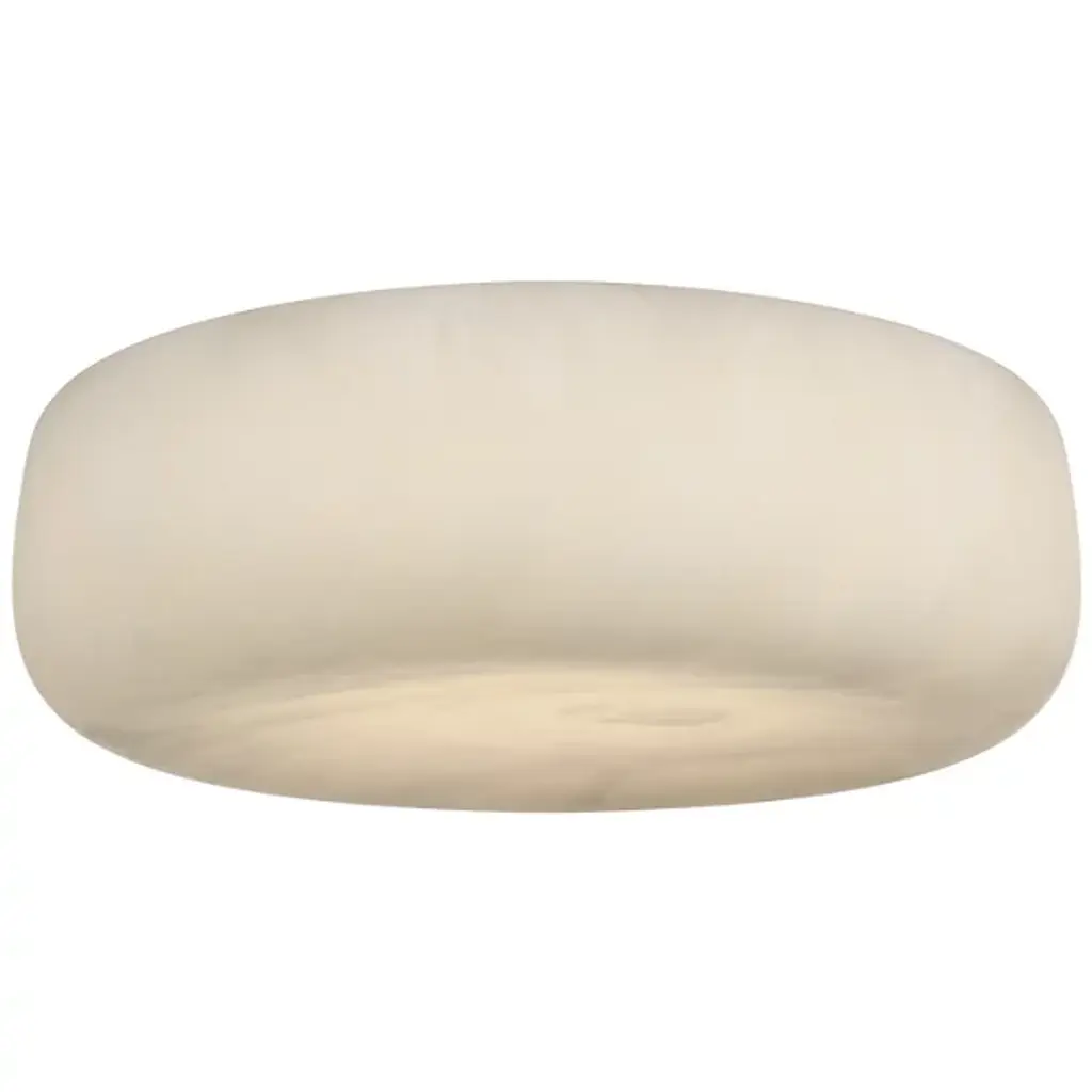 The Formosa LED Flushmount from Visual Comfort Signature sits close to the ceiling while projecting a soft pool of light through the natural alabaster stone. Kelly Wearstler designed this fixture to function in spaces where hanging pendants aren't practical but where quality illumination remains essential. The rounded alabaster form diffuses light evenly across its surface, eliminating shadows and creating consistent room brightness. The brass trim defines the fixture's edge with a thin metallic outline that catches light differently than the stone. This ceiling-hugging design works particularly well in rooms with lower ceiling heights.