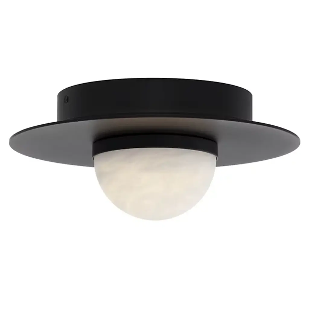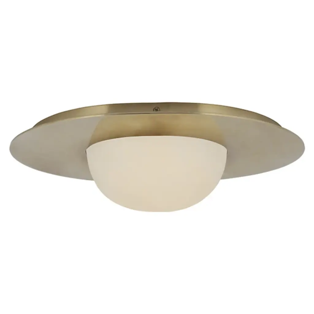 The Fosse LED Flushmount from Visual Comfort Signature nestles an alabaster dome within a brass disc, creating a grounded yet floating ceiling fixture. The natural stone diffuses light with subtle variations unique to each installation, ensuring no two fixtures appear identical. The oval canopy breaks from the typical round ceiling mount, introducing an unexpected geometric element. Kelly Wearstler's unique approach to blending materials is apparent in this fixture's thoughtful combination of metal and stone. This artisanal modern flushmount offers substantial illumination without protruding into the room, making it ideal for spaces with lower ceilings or areas requiring unobstructed overhead clearance.