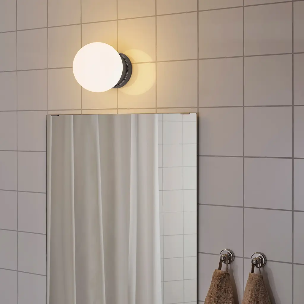 FRIHULT Ceiling/wall lamp - black. Perfect to create atmosphere in the bathroom if you use a smart lighting bulb. Tested and approved for bathroom use. A traditional style lamp made of rust-free materials. The glass shade provides balanced general lighting throughout the room.