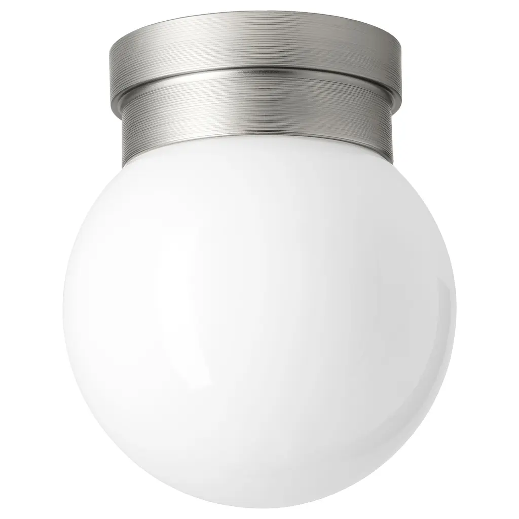 FRIHULT Ceiling/wall lamp - stainless steel color. Perfect to create atmosphere in the bathroom if you use a smart lighting bulb. Tested and approved for bathroom use. A traditional style lamp made of rust-free materials. The glass shade provides balanced general lighting throughout the room.