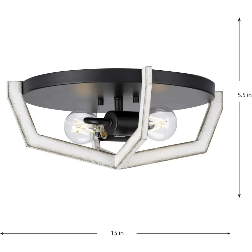 Clean, modern lines combine with rustic elements in the Galloway Collection Flush Mount Light. A lightly distressed white finish highlights an open, angular frame suspended from an impressive circular canopy finished in crisp matte black. Matte black columns hold lights that glow brightly within the stately form to illuminate spaces in a casually elegant style. The close-to-ceiling design provides clear, bright illumination to bedrooms, hallways and foyers. Use vintage-style decorative bulbs (sold separately) to enhance the rustic effect.