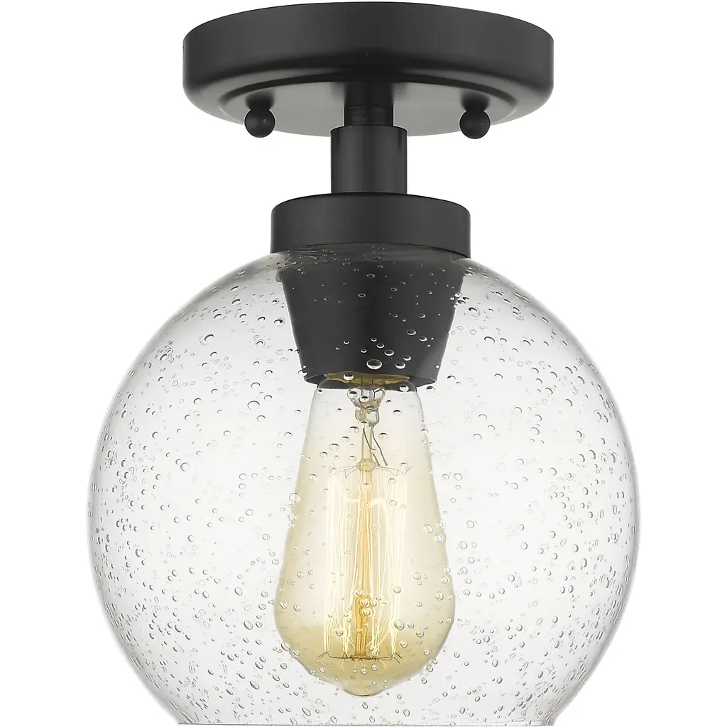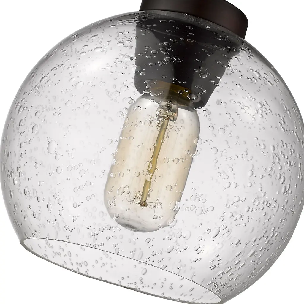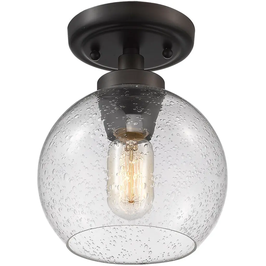 Bring modern elegance into your home with the Golden Lighting Galveston 1-light Flush Mount. Featuring a glass shade and a rubbed bronze frame, it creates a welcoming atmosphere.The seeded glass shade adds a touch of vintage character and artisanal charm, while the small infused air bubbles catch the light beautifully, providing a warm, inviting glow.A timeless and versatile choice, the rubbed bronze finish brings a classic warmth to any design, complementing styles from traditional farmhouse to industrial.This flush mount is ideal for low ceilings in hallways, closets, bathrooms, and moresuitable for damp locations like covered porches and laundry rooms. Requires 1 E26 medium base bulb (not included), max 60 wattage, with overall dimensions of 7.25"W x 9"H x 7.25"D. Perfect for blending seamlessly into any space, this stylish fixture ensures quality lighting that enhances your home.