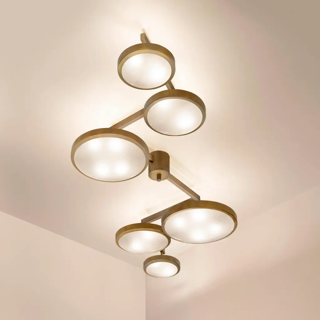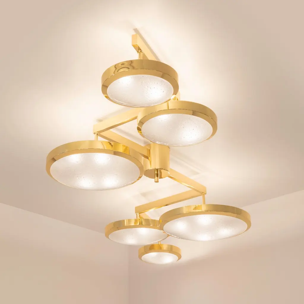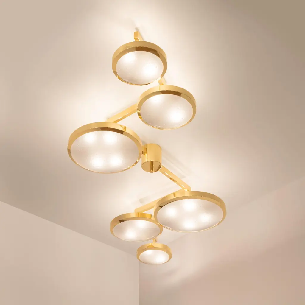 Translated in English to “suspended geometry”, the Geometria Sospesa ceiling light plays with the notion of lines and shapes. The concept is brought to life by its distinctive winding frame with six variable size shades at staggered heights. The first images show the fixture in our Bronzo Nuvolato (bronze) finish-subsequent pictures show it in a selection of alternative finishes. Starting at $ 15,900 for standard finishes.Starting at $ 17,500 for premium finishes.Customization Options:Each fixture is hand crafted in Italy and can be customized in size, layout and number of shades. Available in any of our 10 finishes and 8 enamel colors. Compatible with our Murano bubble glass and Murano frosted glass. Can be installed as a flush mount or on a stem.Lead Time: 10-12 weeks plus shipping. May be available for quick ship in 6 weeks or under.Width: 86”Depth: 34”Height: 11”. Overall height can be adjusted as needed. 9” minimum heightElectrical: Sixteen E12 40W incandescent or 75W LED equivalentModel#: LTZ286