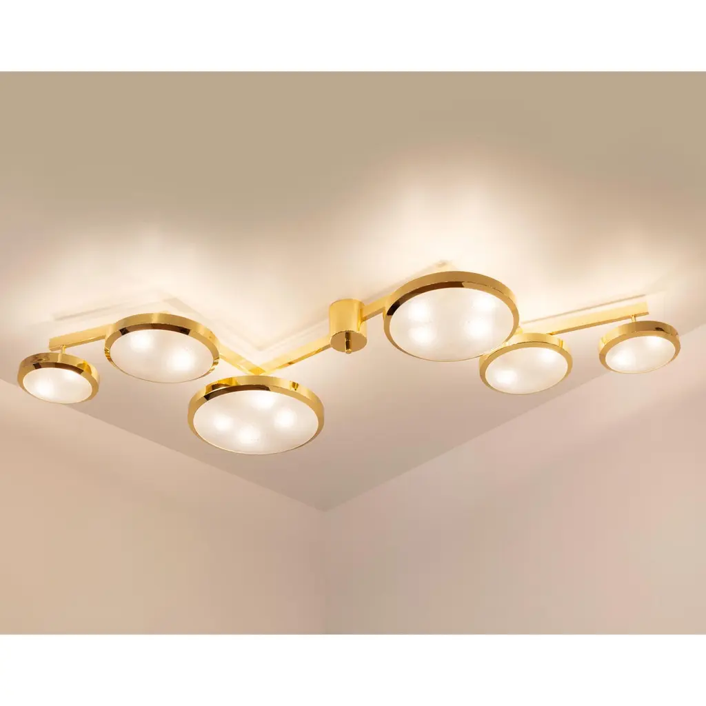 Translated in English to “suspended geometry”, the Geometria Sospesa ceiling light plays with the notion of lines and shapes. The concept is brought to life by its distinctive winding frame with six variable size shades at staggered heights. The first images show the fixture in our Bronzo Nuvolato (bronze) finish-subsequent pictures show it in a selection of alternative finishes. Starting at $ 15,900 for standard finishes.Starting at $ 17,500 for premium finishes.Customization Options: Each fixture is hand crafted in Italy and can be customized in size, layout and number of shades. Available in any of our 10 finishes and 8 enamel colors. Compatible with our Murano bubble glass and Murano frosted glass. Can be installed as a flush mount or on a stem.Lead Time: 10-12 weeks plus shipping. May be available for quick ship in 6 weeks or under.Width: 86”Depth: 34”Height: 11”. Overall height can be adjusted as needed. 9” minimum heightElectrical: Sixteen E12 40W incandescent or 75W LED equivalentModel#: LTZ286