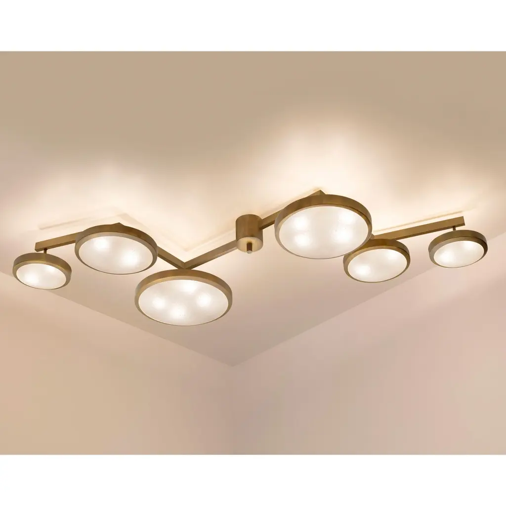 Translated in English to “suspended geometry”, the Geometria Sospesa ceiling light plays with the notion of lines and shapes. The concept is brought to life by its distinctive winding frame with six variable size shades at staggered heights. The first images show the fixture in our Brunito Nero (black bronze) finish-subsequent pictures show it in a selection of alternative finishes. Starting at $ 15,900 for standard finishes.Starting at $ 17,500 for premium finishes.Customization Options:Each fixture is hand crafted in Italy and can be customized in size, layout and number of shades. Available in any of our 10 finishes and 8 enamel colors. Compatible with our Murano bubble glass and Murano frosted glass. Can be installed as a flush mount or on a stem.Lead Time: 10-12 weeks plus shipping. May be available for quick ship in 6 weeks or under.Width: 86”Depth: 34”Height: 11”. Overall height can be adjusted as needed. 9” minimum heightElectrical: Sixteen E12 40W incandescent or 75W LED equivalentModel#: LTZ286