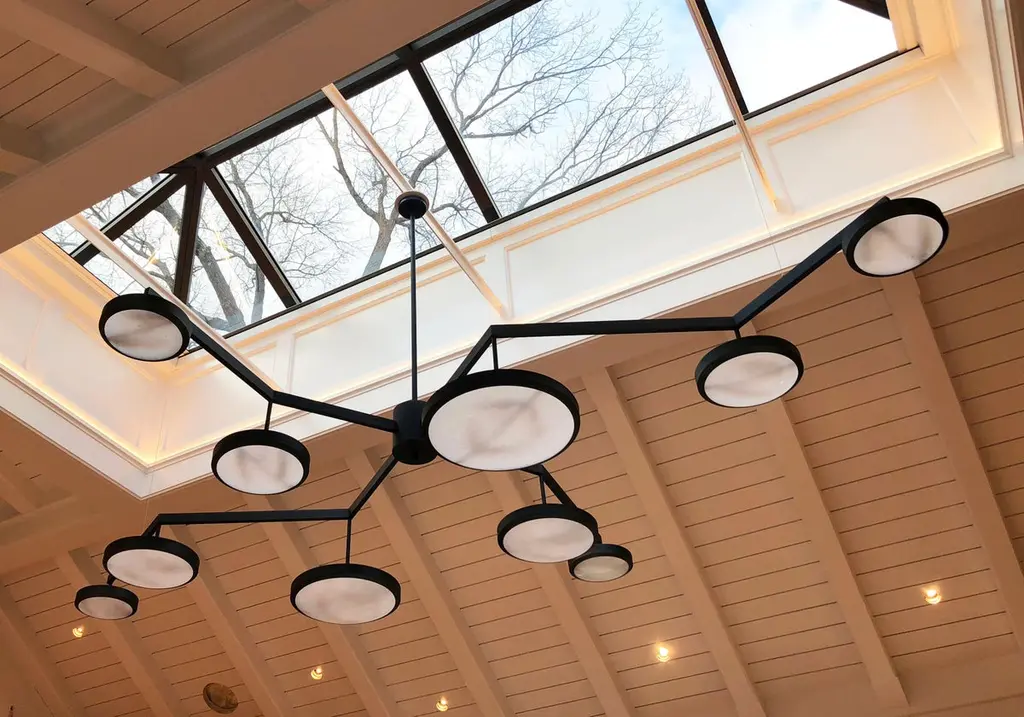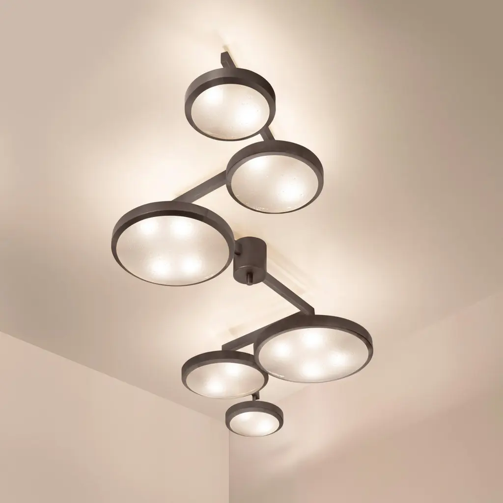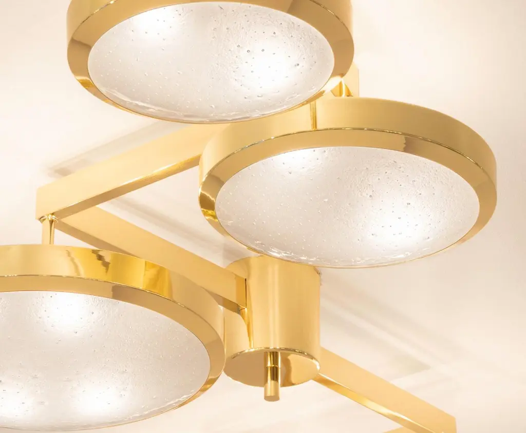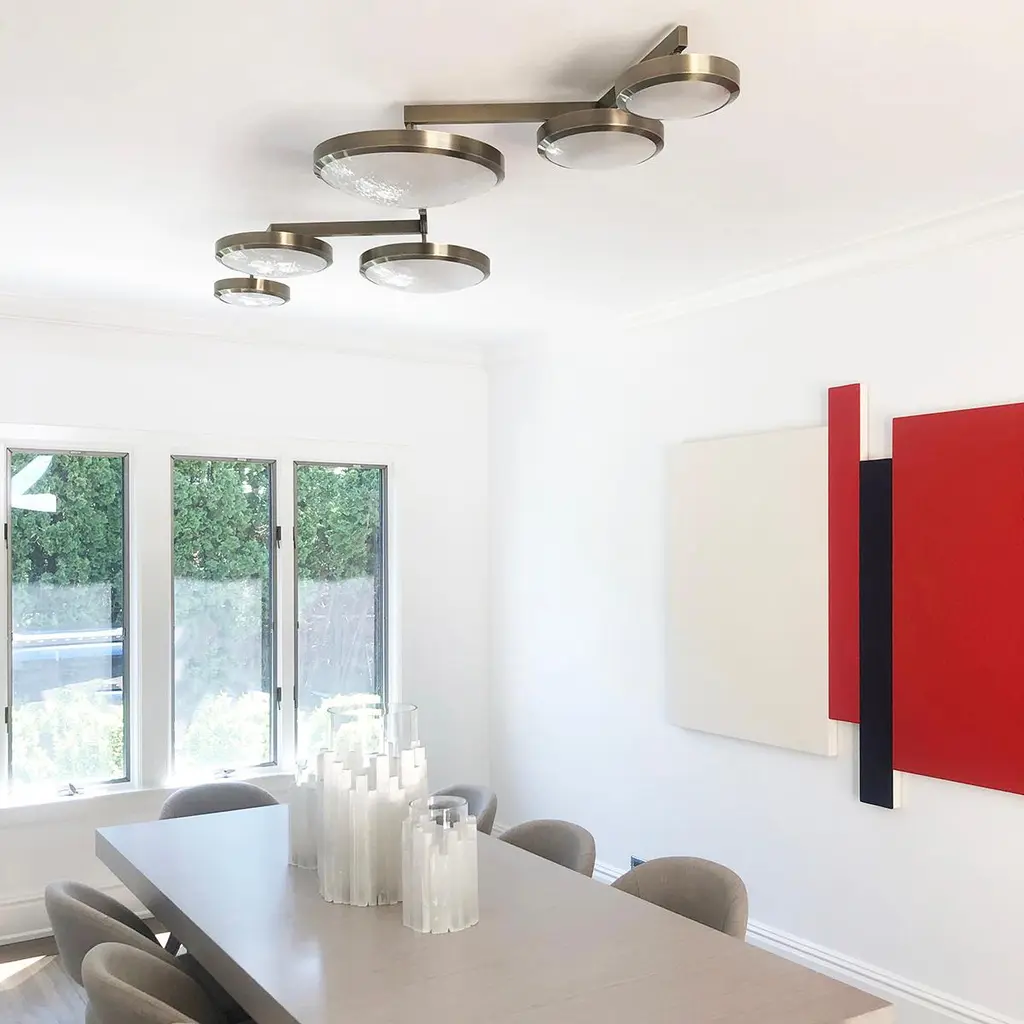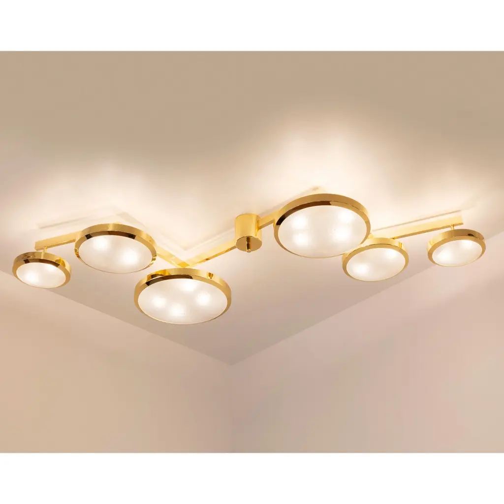 Translated in English to “suspended geometry”, the Geometria Sospesa ceiling light plays with the notion of lines and shapes. The concept is brought to life by its distinctive winding frame with six variable size shades at staggered heights. The first images show the fixture in our polished brass finish-subsequent pictures show it in a selection of alternative finishes. Starting at $ 15,900 for standard finishes.Starting at $ 17,500 for premium finishes.Customization Options:Each fixture is hand crafted in Italy and can be customized in size, layout and number of shades. Available in any of our 10 finishes and 8 enamel colors. Compatible with our Murano bubble glass and Murano frosted glass. Can be installed as a flush mount or on a stem.Lead Time: 10-12 weeks plus shipping. May be available for quick ship in 6 weeks or under.Width: 86”Depth: 34”Height: 11”. Overall height can be adjusted as needed. 9” minimum heightElectrical: Sixteen E12 40W incandescent or 75W LED equivalentModel#: LTZ286