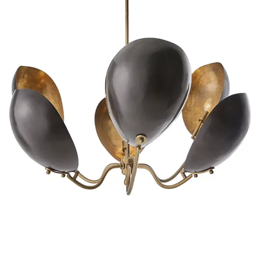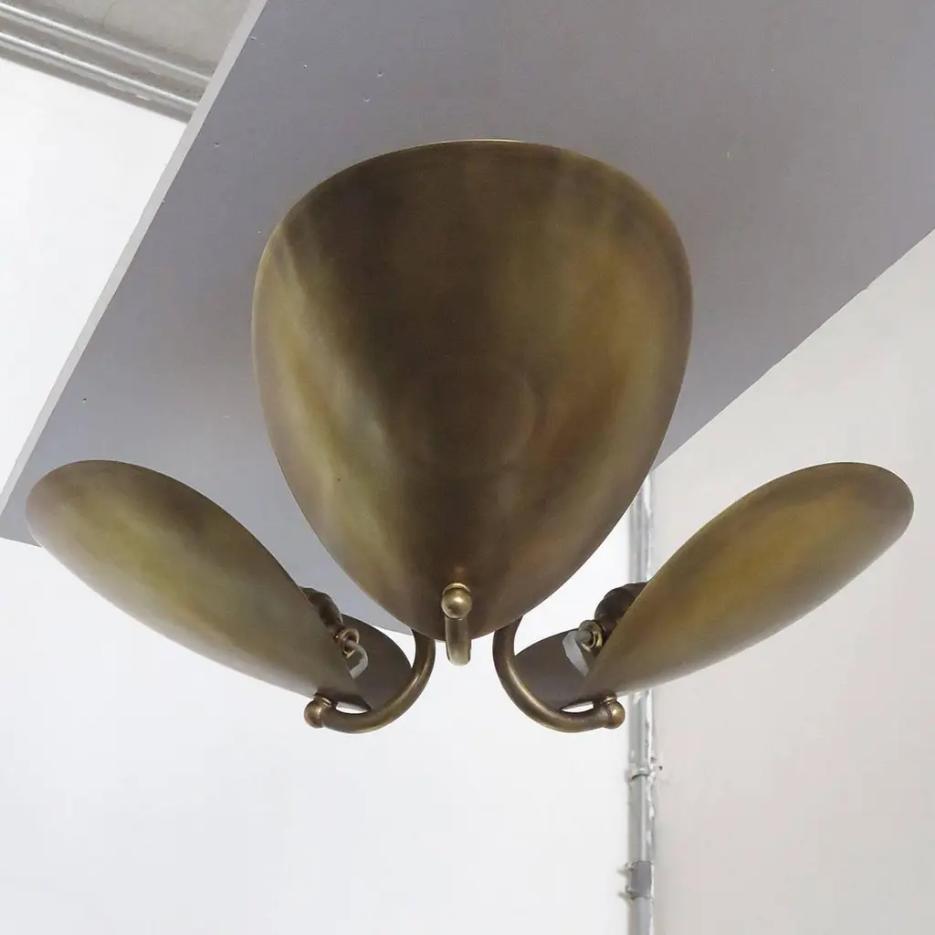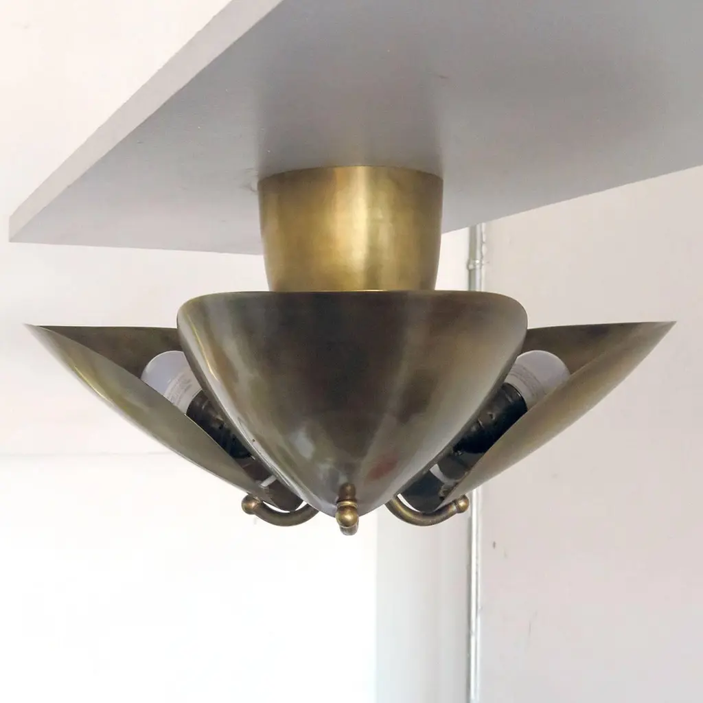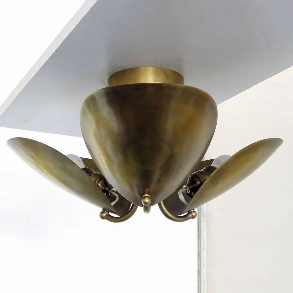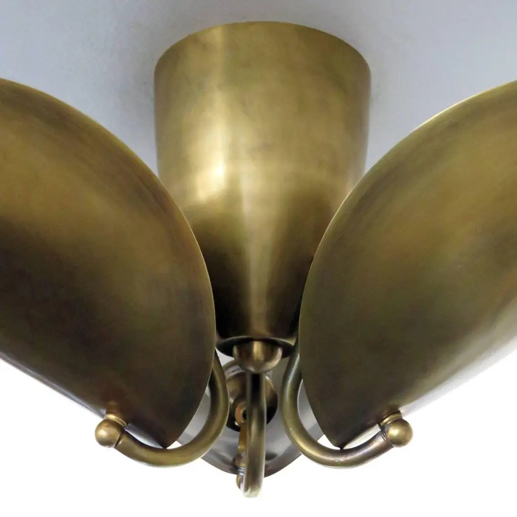 Wonderful, organic three-petal aged brass flush mount by Gallery L7, handcrafted and finished in Los Angeles from American brass. Three E26 sockets per fixture, max. wattage 60w each or 3-7w LED equivalent, wired for US standards or European standards (110v/220v), bulbs provided as a onetime courtesy (US only). UL listing available upon request for an additional charge. Multiples available.