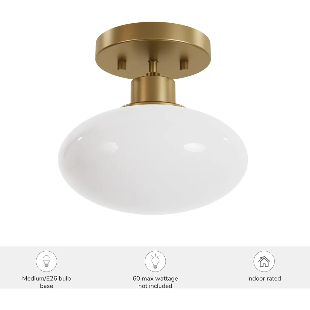Bring a golden touch of modern elegance to your space with the Getty 1 Light Flush Mount from the Jasmine Roth Collection. This stunning fixture features a unique ellipse-shaped milk glass that ensures even distribution of light, beautifully diffused through high-quality cased white glass. Designed for both style and durability, the scratch-resistant glass and Luxe Gold finish make it a perfect choice for any room, offering a sophisticated yet understated glow.