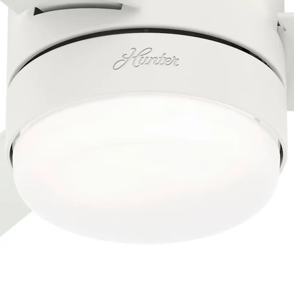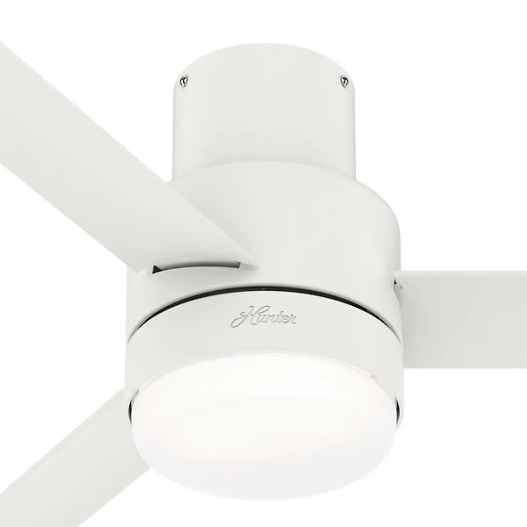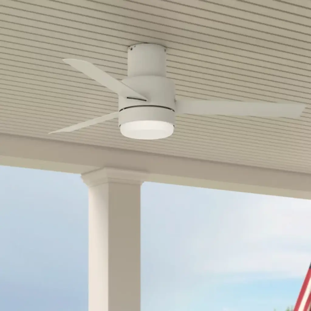 Bring forth a mighty wind with the smooth lines and compelling design of the Gilmour 52-Inch Outdoor Flushmount Fan with LED Light from Hunter Fans. Held in place by a stepped, cylindrical housing and canopy arrangement, it extends three slender blades at even intervals, each pitched at 13 degrees with a wide sweep. The lamping activates with a tap of a handheld control, and the blades spin through four speeds just above it, expressing a bold breeze that effortlessly cools its surroundings.