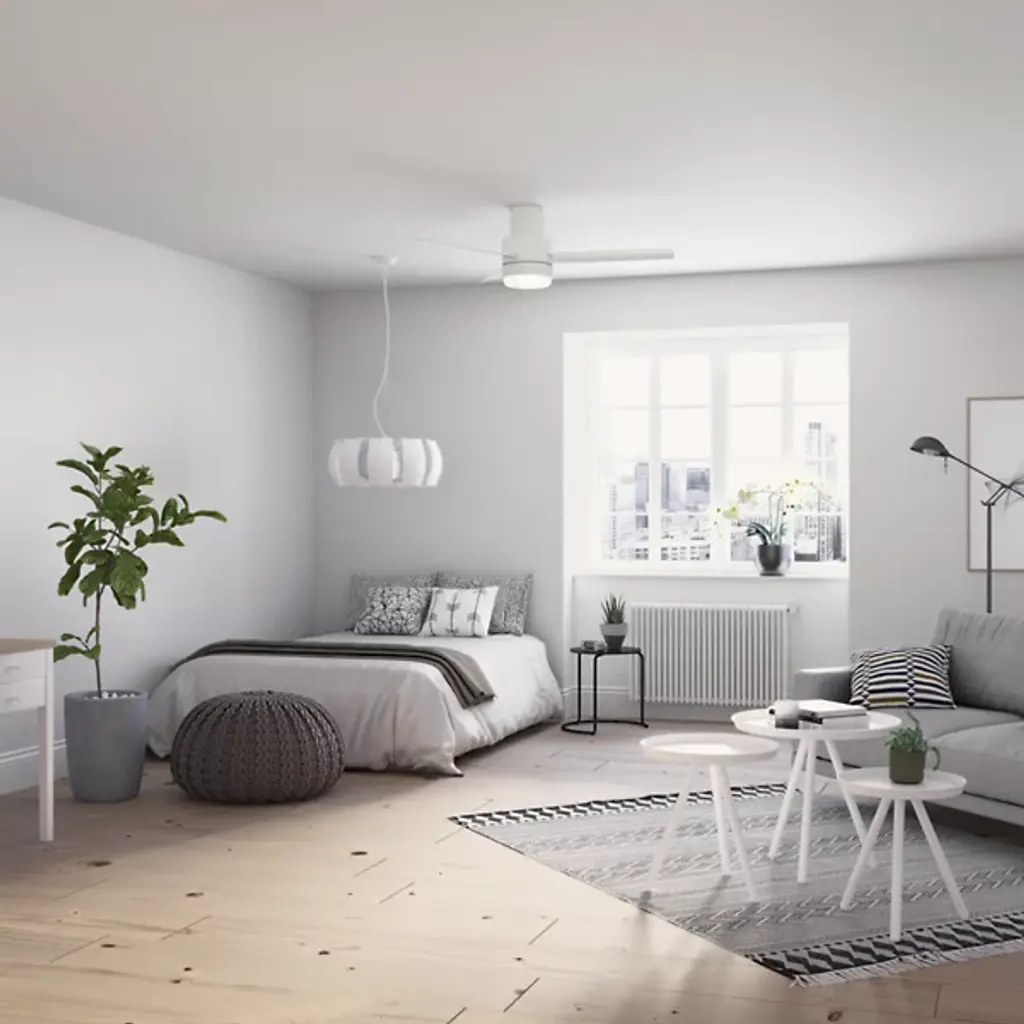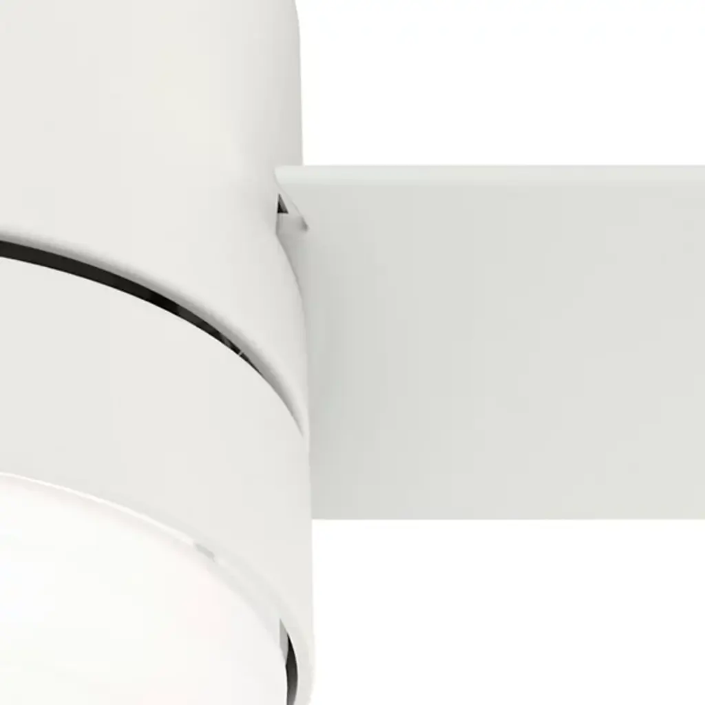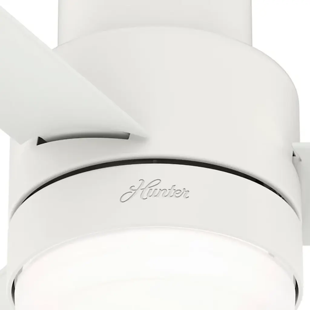 Bring forth a mighty wind with the smooth lines and compelling design of the Gilmour 52-Inch Outdoor Flushmount Fan with LED Light from Hunter Fans. Held in place by a stepped, cylindrical housing and canopy arrangement, it extends three slender blades at even intervals, each pitched at 13 degrees with a wide sweep. The lamping activates with a tap of a handheld control, and the blades spin through four speeds just above it, expressing a bold breeze that effortlessly cools its surroundings.