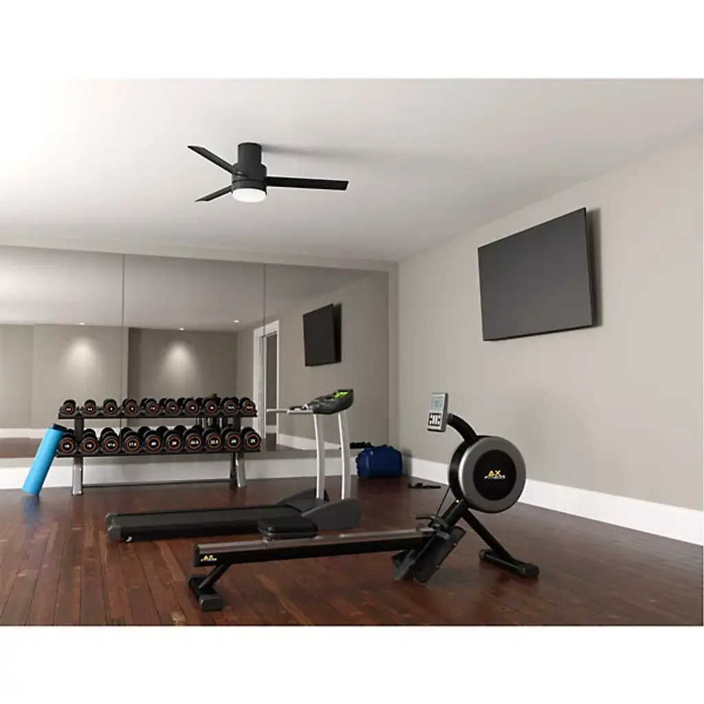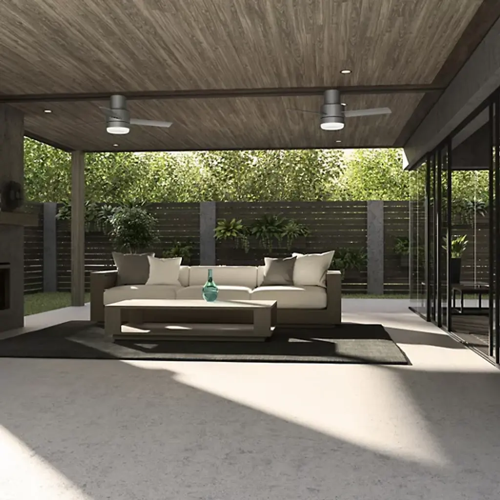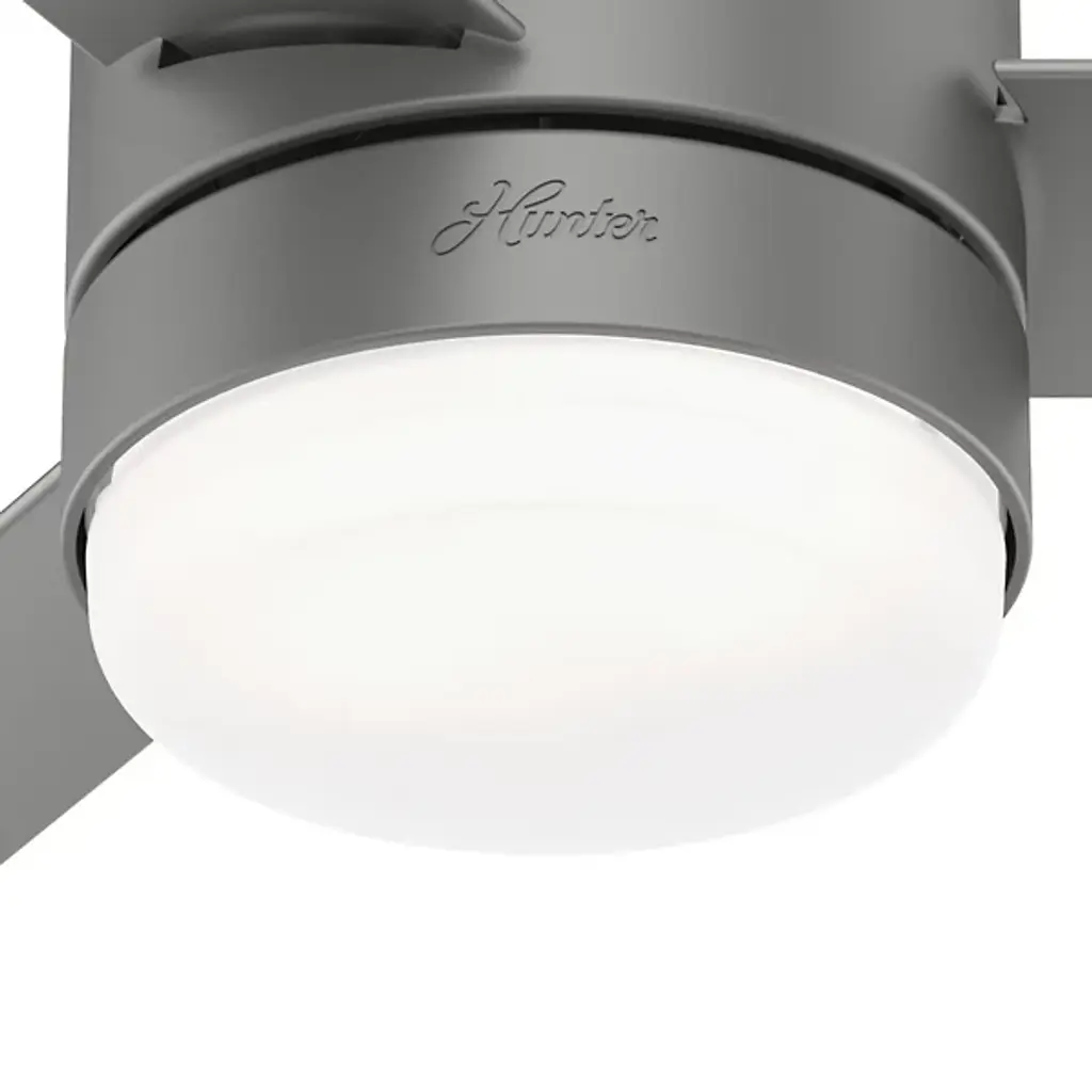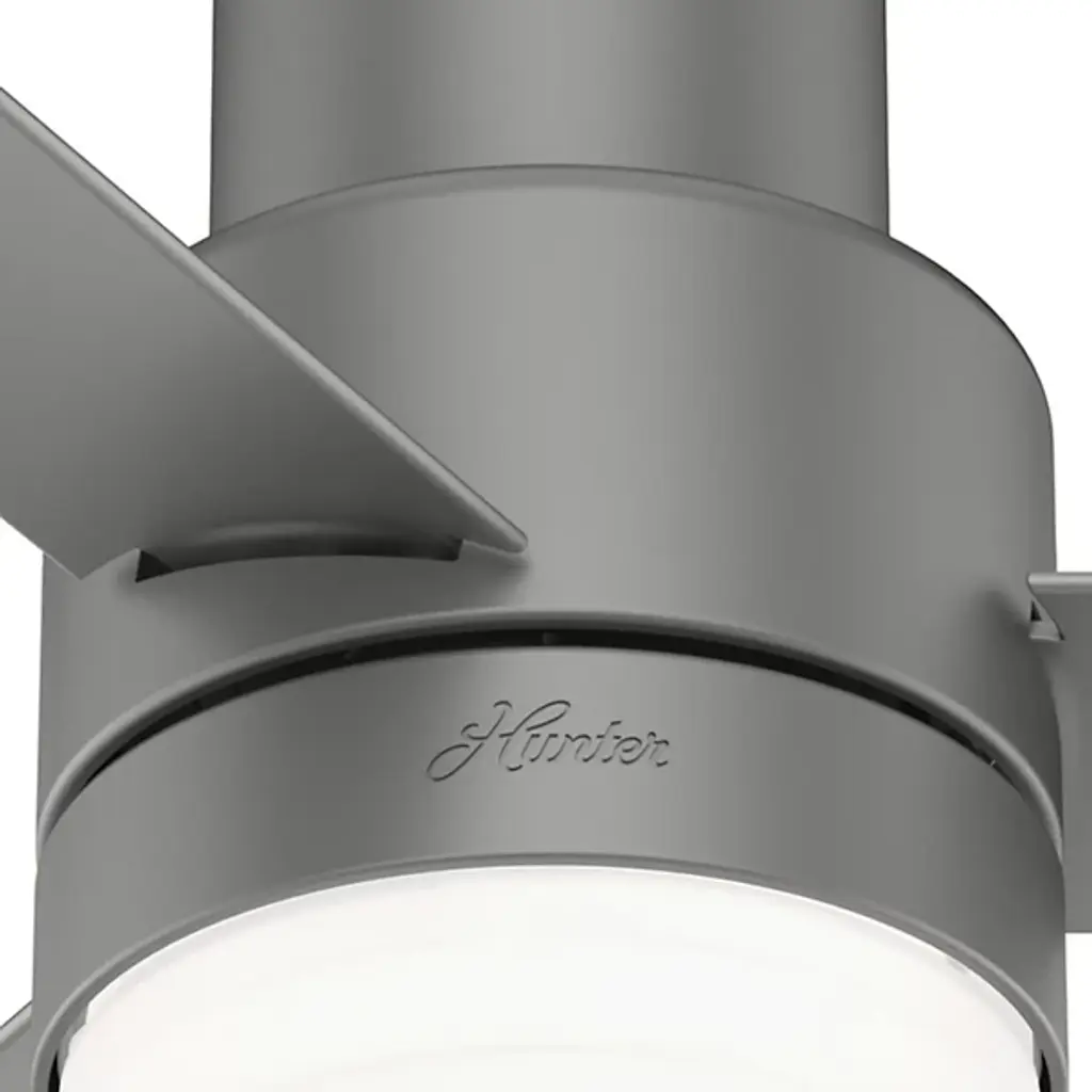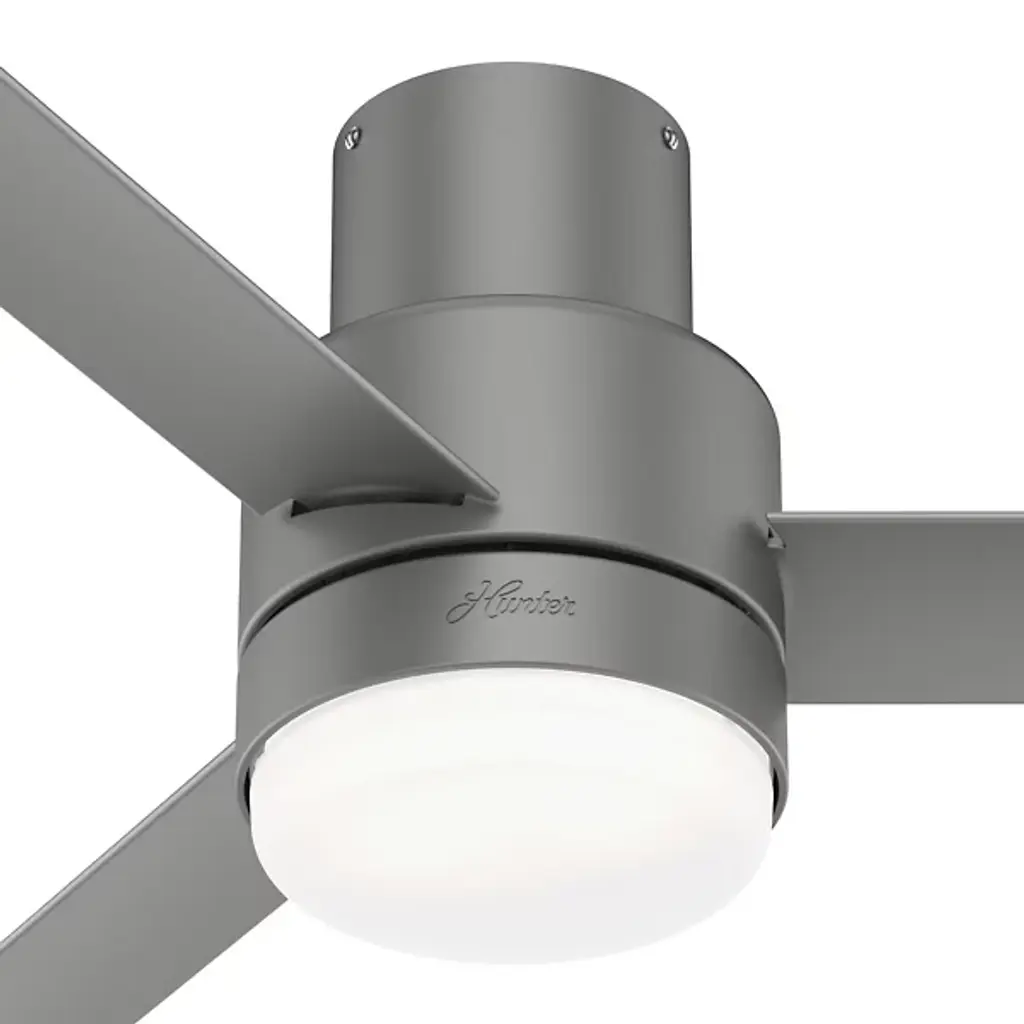Simple and sleek, the Gilmour Outdoor Flushmount Ceiling Fan with Light from Hunter Fans brings a comforting presence to the décor of your modern home. Working well with a range of home styles, this piece features a set of three blades with sharp-angled ends. A round shade rests at the center, housing a pair of crisp bulbs that diffuse cleanly into the room, introducing a welcoming layer of light that elevates the comforting circulation of air.
