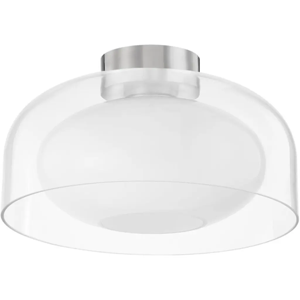 The Giovanna Flush Mount blends shape and material with beautiful simplicity. Available in aged brass, old bronze, and polished nickel canopy, which holds an opal glass shade within a clear glass dome. Dueling shades lend visual intrigue to the otherwise minimal design.