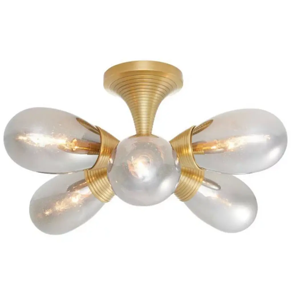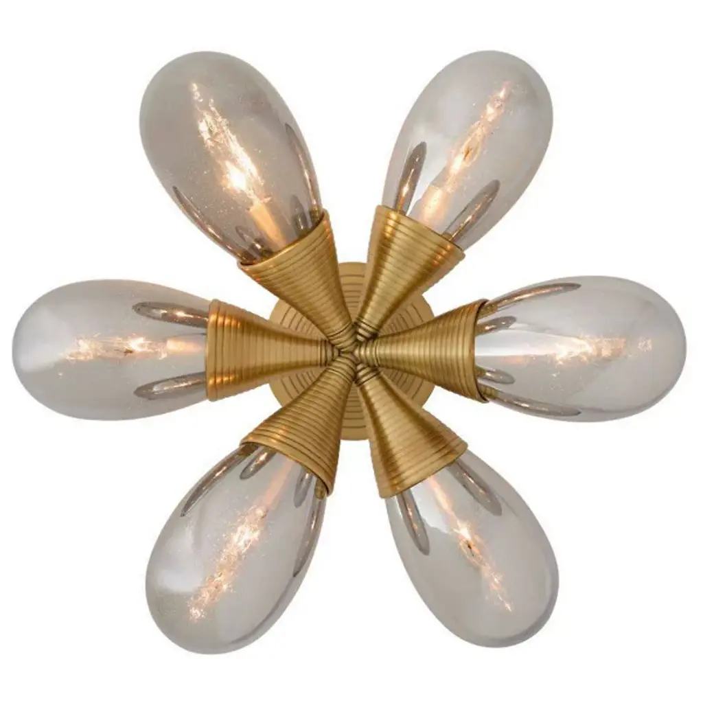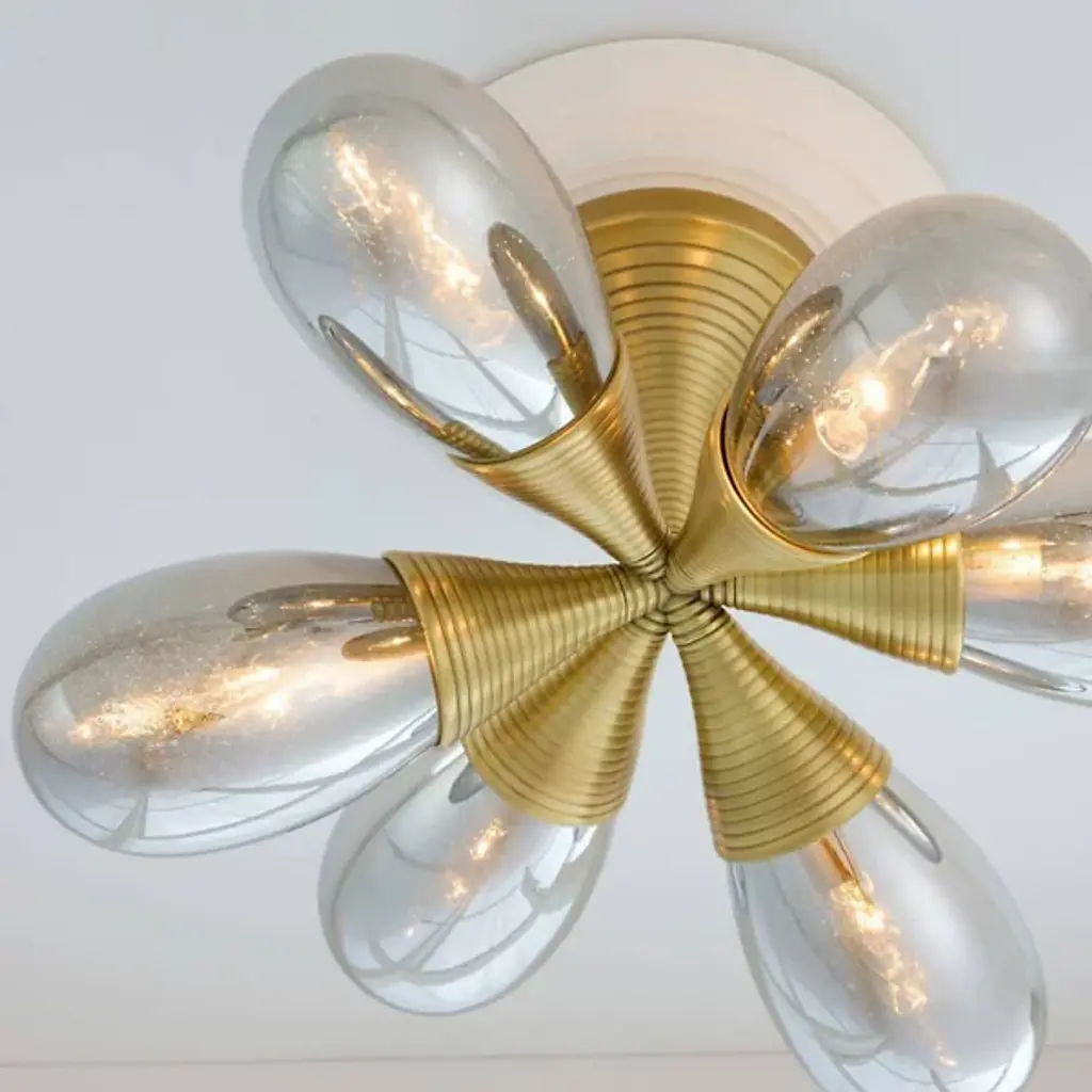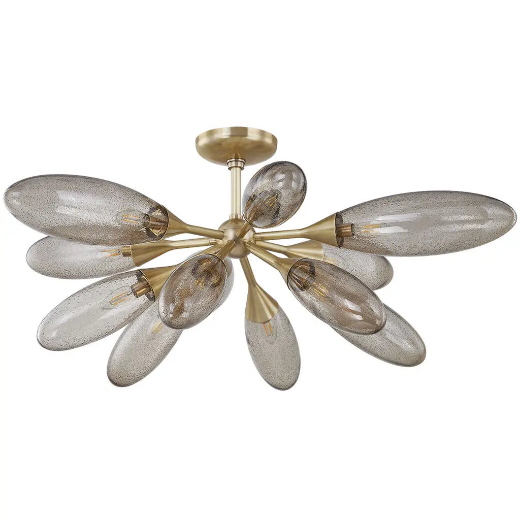 The Giselle Flushmount from Arteriors captures cosmic motion through six handblown glass pendants. Each seedy glass shade appears to drift outward from the ribbed iron canopy, suggesting the path of shooting stars. The trumpet-shaped mount adds architectural interest while housing the dimmable light sources. Light filters through the textured glass, creating atmospheric illumination that works beautifully in kitchens, bathrooms, entryways, and other living spaces. This celestial-inspired fixture brings night sky wonder to indoor and sheltered outdoor settings.