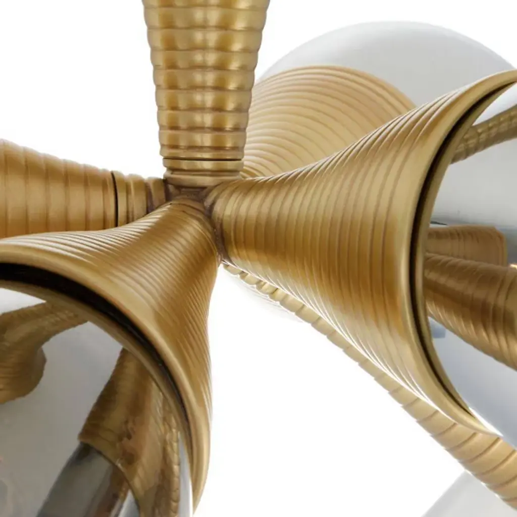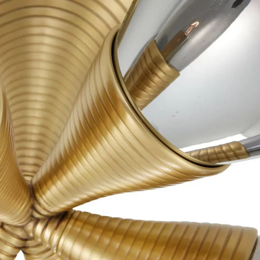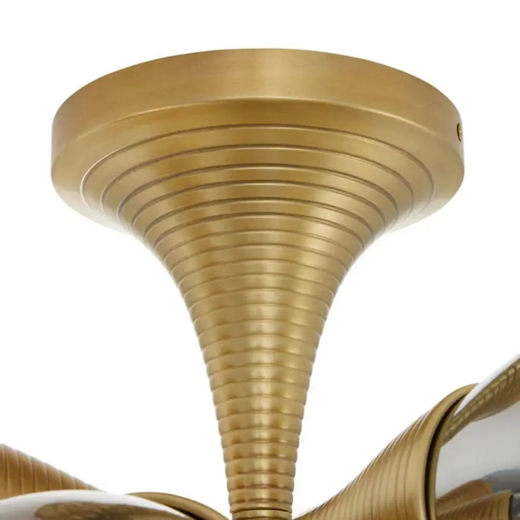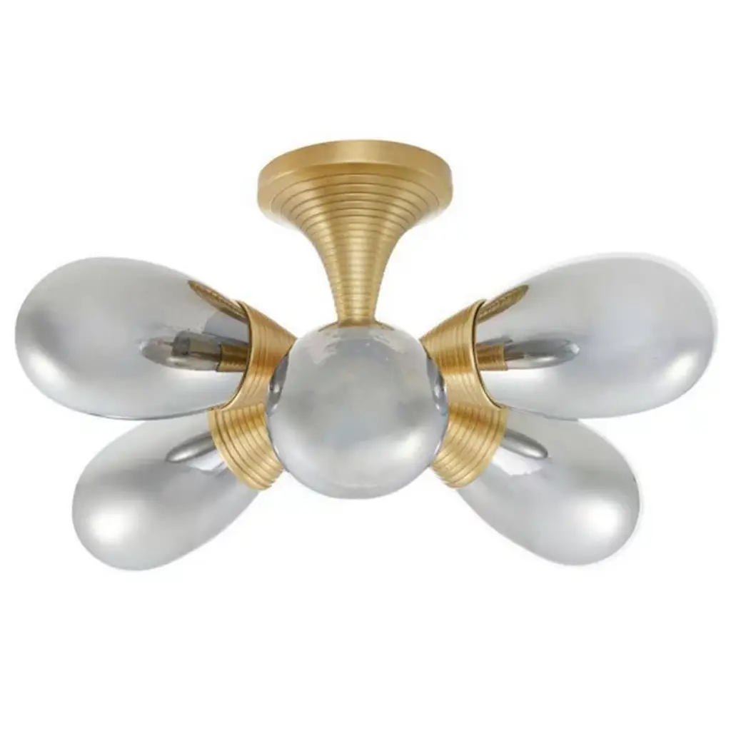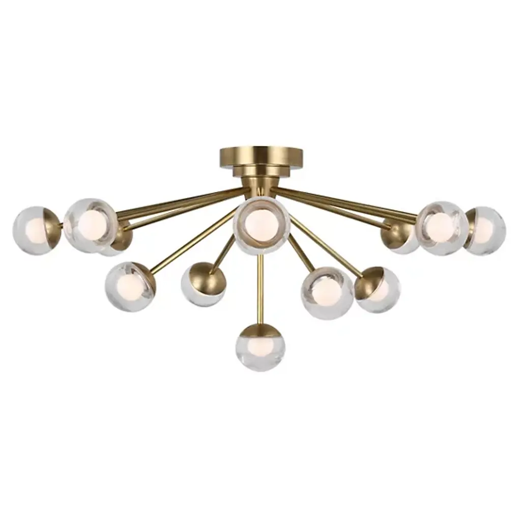 The Giselle Flushmount from Arteriors captures cosmic motion through six handblown glass pendants. Each seedy glass shade appears to drift outward from the ribbed iron canopy, suggesting the path of shooting stars. The trumpet-shaped mount adds architectural interest while housing the dimmable light sources. Light filters through the textured glass, creating atmospheric illumination that works beautifully in kitchens, bathrooms, entryways, and other living spaces. This celestial-inspired fixture brings night sky wonder to indoor and sheltered outdoor settings.