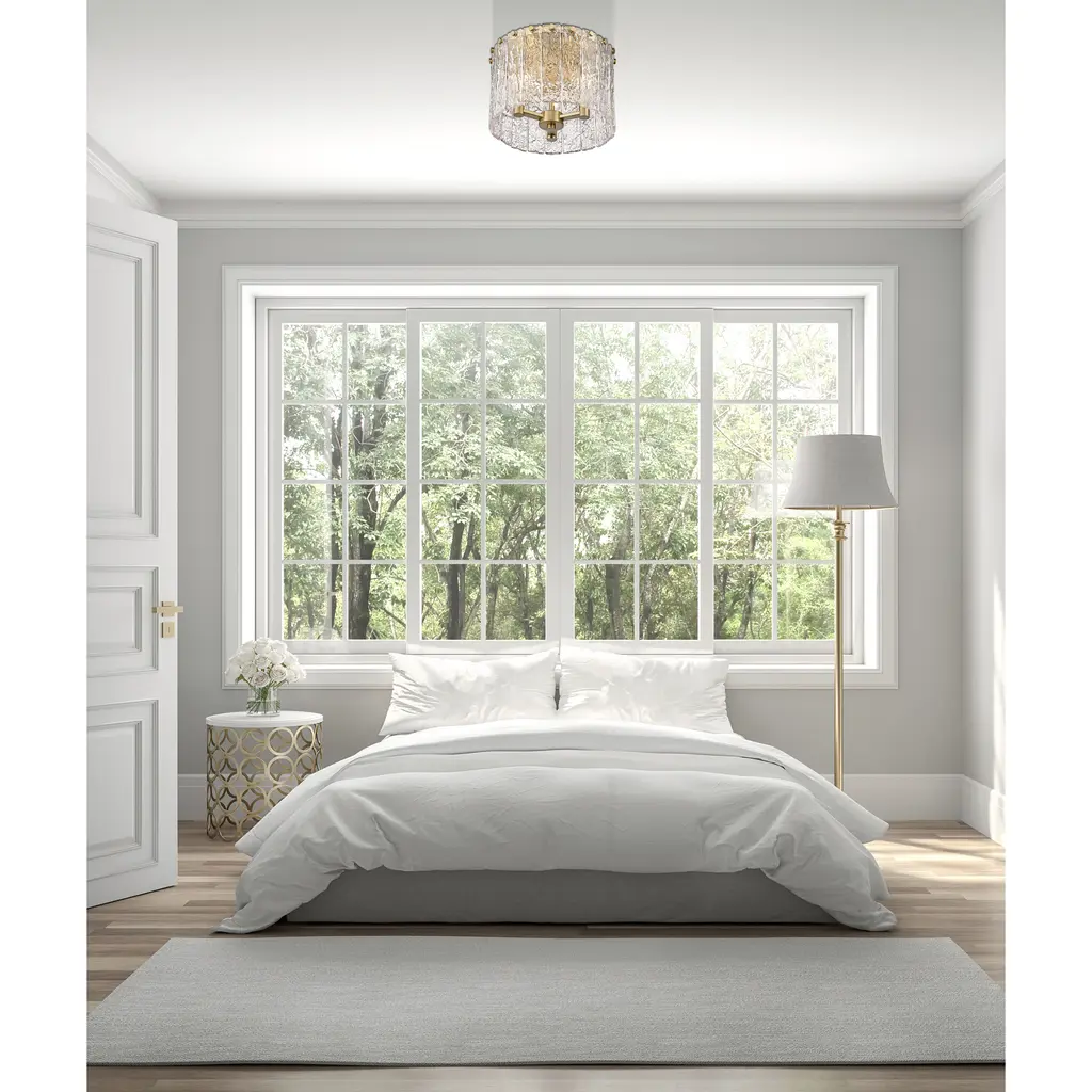 Gleaming metal and glass circle around compelling artistry to create a standout fixture perfect for both modern and transitional settings. The Glacier three-light flush mount ceiling light offers a decadent look of individual textured glass panels that emulate melting ice, an extraordinary effect with dramatic impact in a kitchen or entryway setting. Lush modern gold finish steel creates a chic frame and canopy, adding consistency in both style and finish and embellishing the optical delight accomplished when the fixture is illuminated.