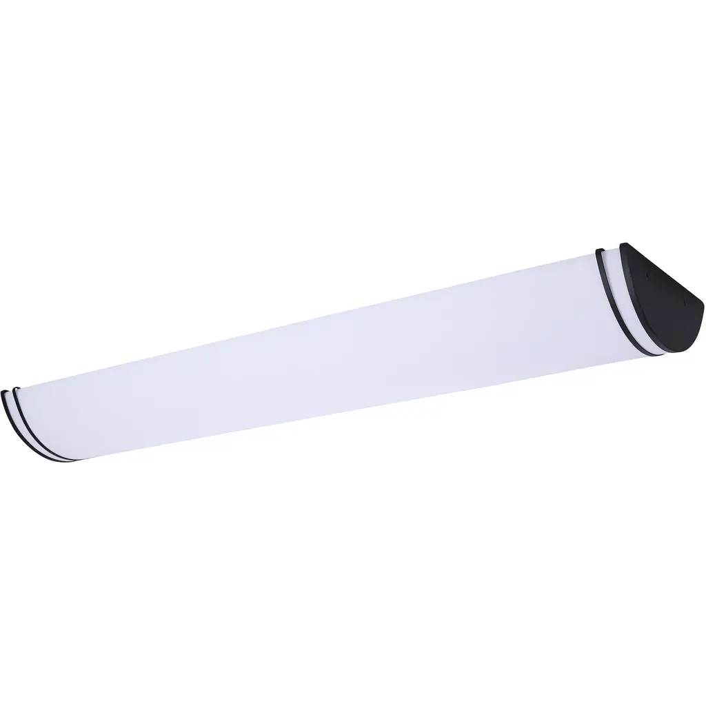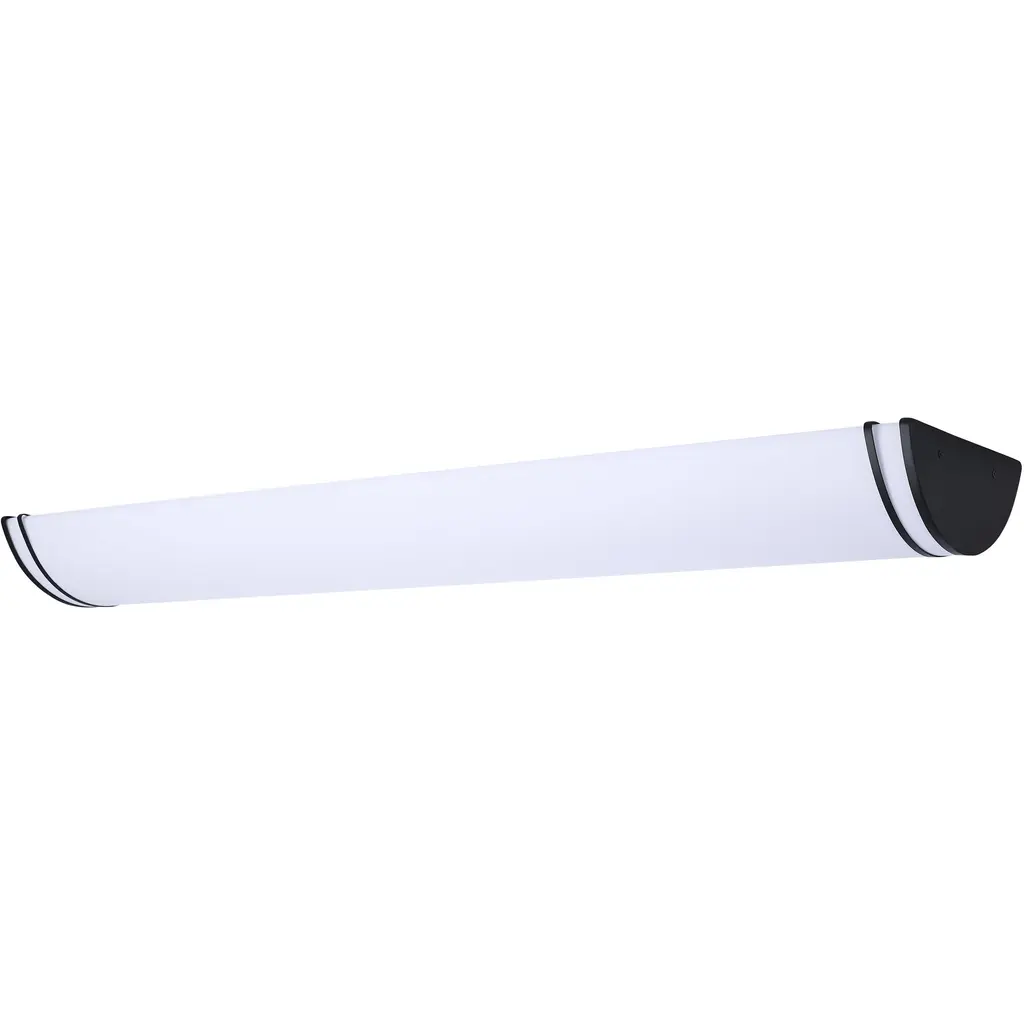 The SATCO NUVO 62-1980 Glamour 50-inch Linear Fixture in white with a black finish combines modern design with 5 CCT selectable technology (2700K5000K) and 90 CRI illumination for enhanced color rendering. This 50-watt fixture replaces 300W incandescent lighting, offering energy-efficient performance. Built with a durable steel frame and an impact-resistant PMMA lens, it is dimmable, damp location rated, and designed for longevity with a 50,000-hour lifespan and a 3-year warranty.