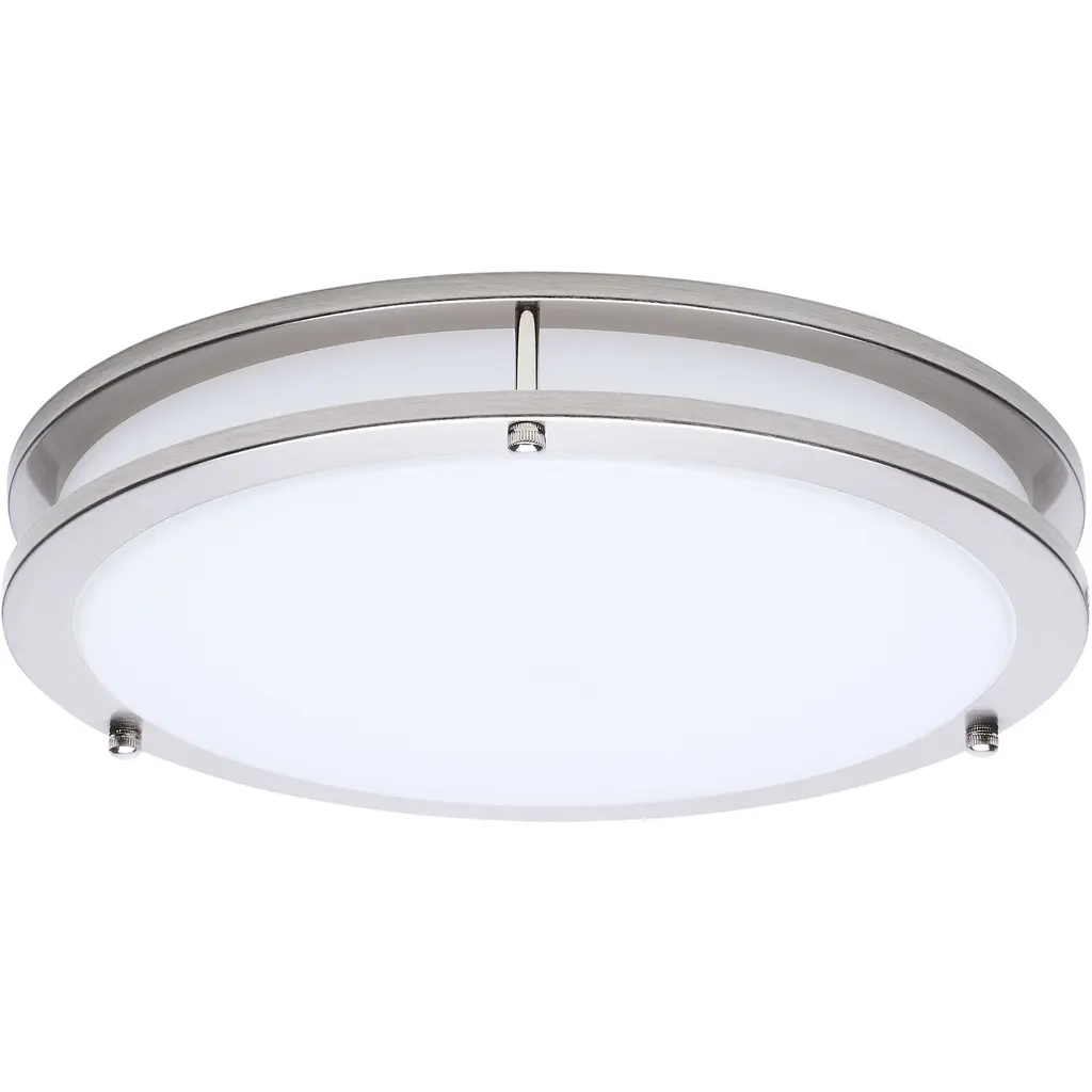 The SATCO NUVO 62-1876 Glamour 13-inch Round Flush Mount in Brushed Nickel delivers sleek, modern lighting with 5 CCT selectable technology (2700K5000K) and 90 CRI illumination for enhanced color rendering. This 25-watt fixture replaces 150W incandescent lighting, offering energy-efficient performance. Built with a durable steel frame and an impact-resistant PMMA lens, it is dimmable, damp location rated, and designed for longevity with a 50,000-hour lifespan and a 3-year warranty.