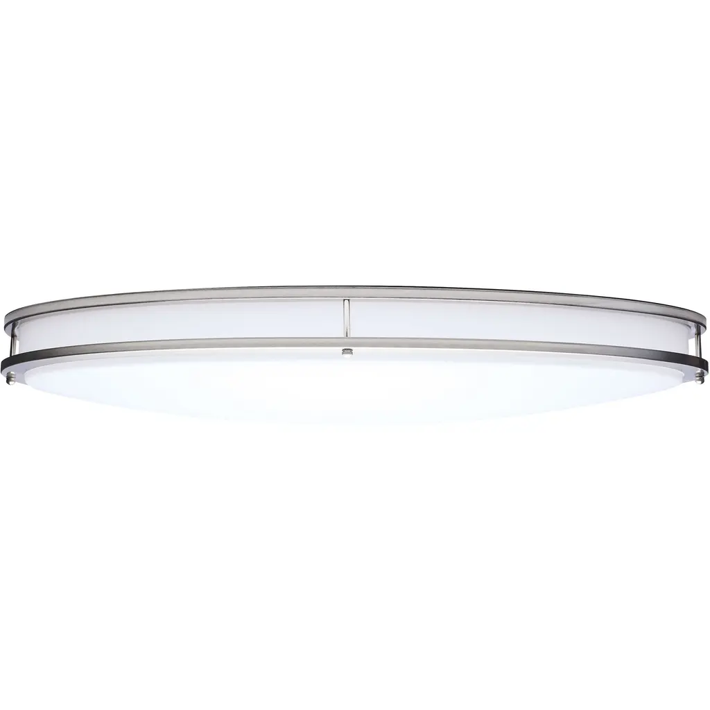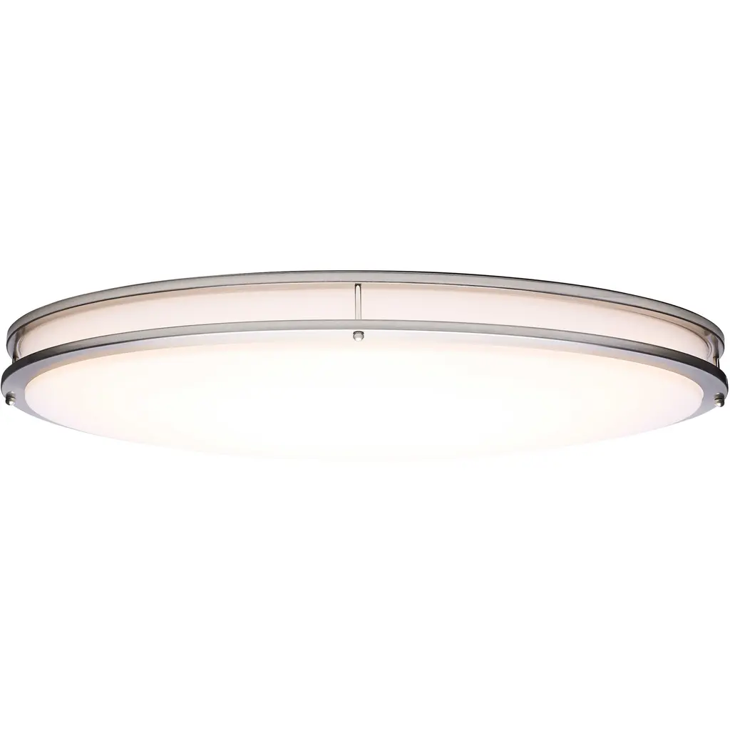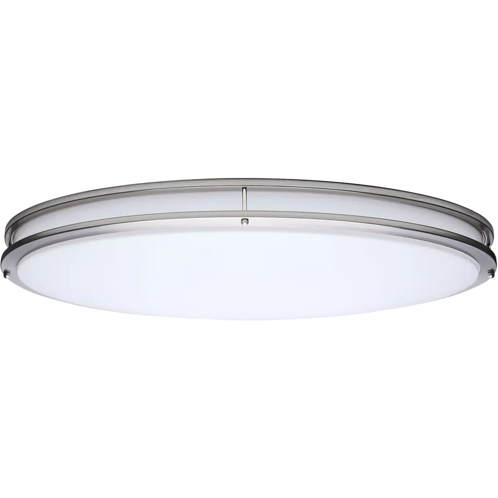 The SATCO NUVO 62-1881 Glamour 32-inch Oval Flush Mount in Brushed Nickel combines modern design with energy-efficient performance, featuring 5 CCT selectable technology (2700K5000K) and 90 CRI illumination for superior color rendering. This 50-watt fixture replaces 300W incandescent lighting, offering significant energy savings. Crafted with a durable steel frame and an impact-resistant PMMA lens, it is dimmable, damp location rated, and built to last with a 50,000-hour lifespan and a 3-year warranty.