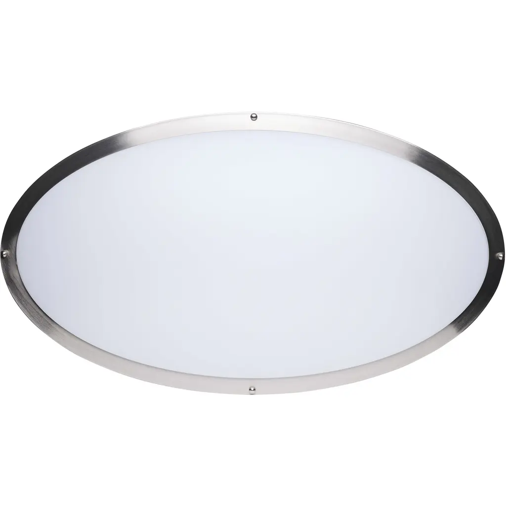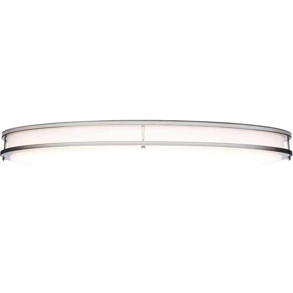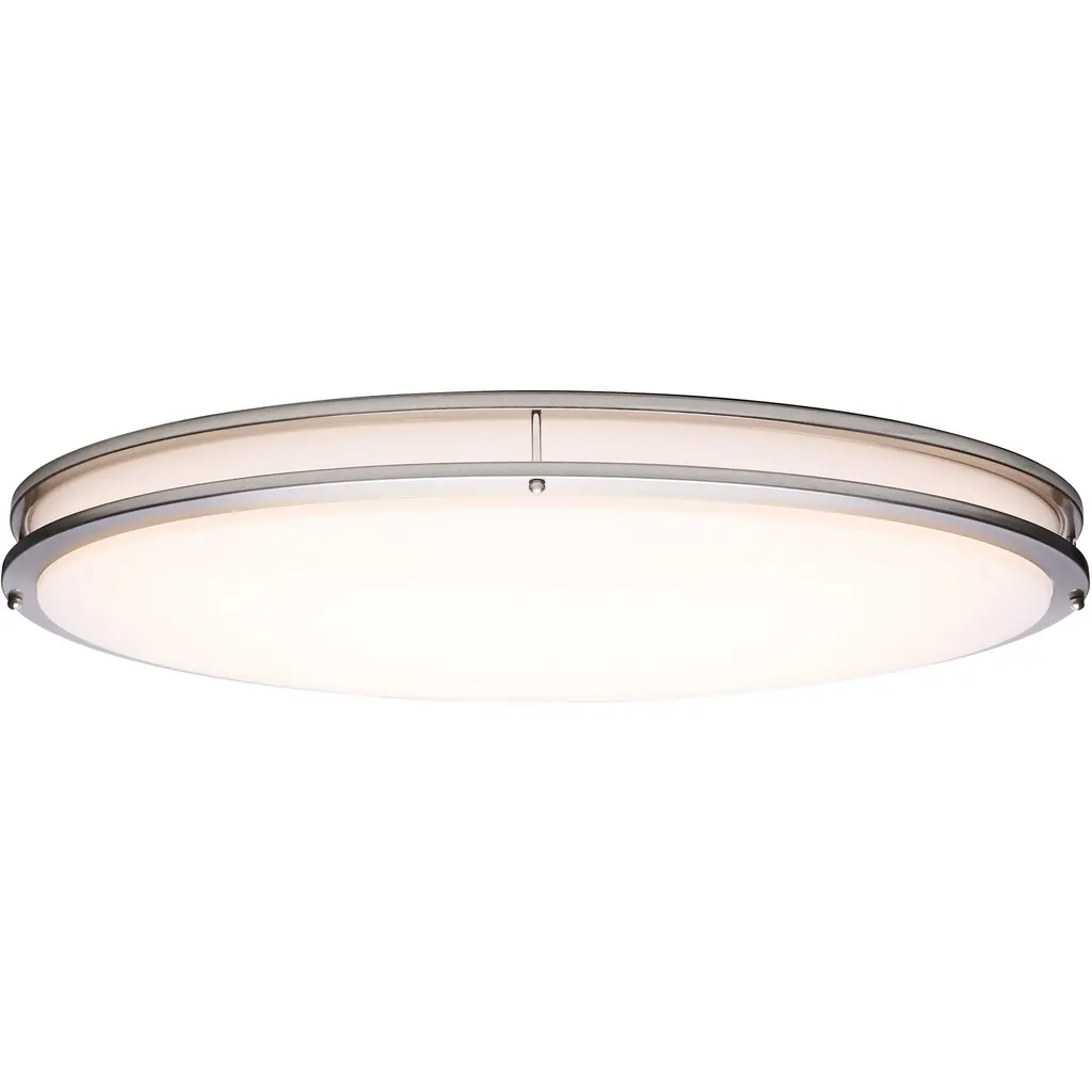 The SATCO NUVO 62-1881 Glamour 32-inch Oval Flush Mount in Brushed Nickel combines modern design with energy-efficient performance, featuring 5 CCT selectable technology (2700K5000K) and 90 CRI illumination for superior color rendering. This 50-watt fixture replaces 300W incandescent lighting, offering significant energy savings. Crafted with a durable steel frame and an impact-resistant PMMA lens, it is dimmable, damp location rated, and built to last with a 50,000-hour lifespan and a 3-year warranty.
