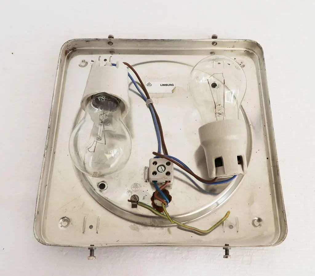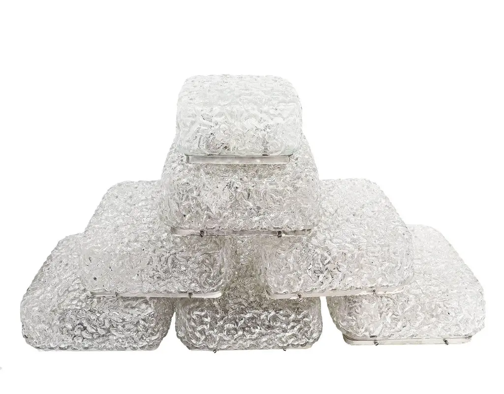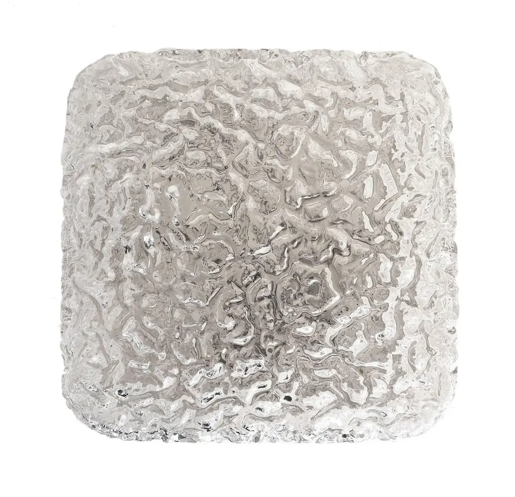 Elegant flush mount ceiling light with thick, heavy textured glass fixed on a metal frame. Manufactured by Glashutte Limburg, Germany in the 1960s. Design: Helena Tynell attr. Style: mid century, modernist. Lighting: takes two large Edison E27 base screw bulbs. Wattage: we recommend up to 40w per bulb. Works on 220v as well as 110v. Condition: very good vintage condition. Glass without damage. Price is per piece. Five single pieces in stock. We have more of these Limburg lights in various designs in stock: LU234038471293, LU234038471423 and LU234038471033 Wiring: The lamp has been tested with US American light bulbs under 120v and works flawlessly, no tools or rewiring required. All our goods are originally wired for 220v. Delivery without bulbs. Shipping: In order to ensure safe transport, the lamp will be dismantled and carefully packed.