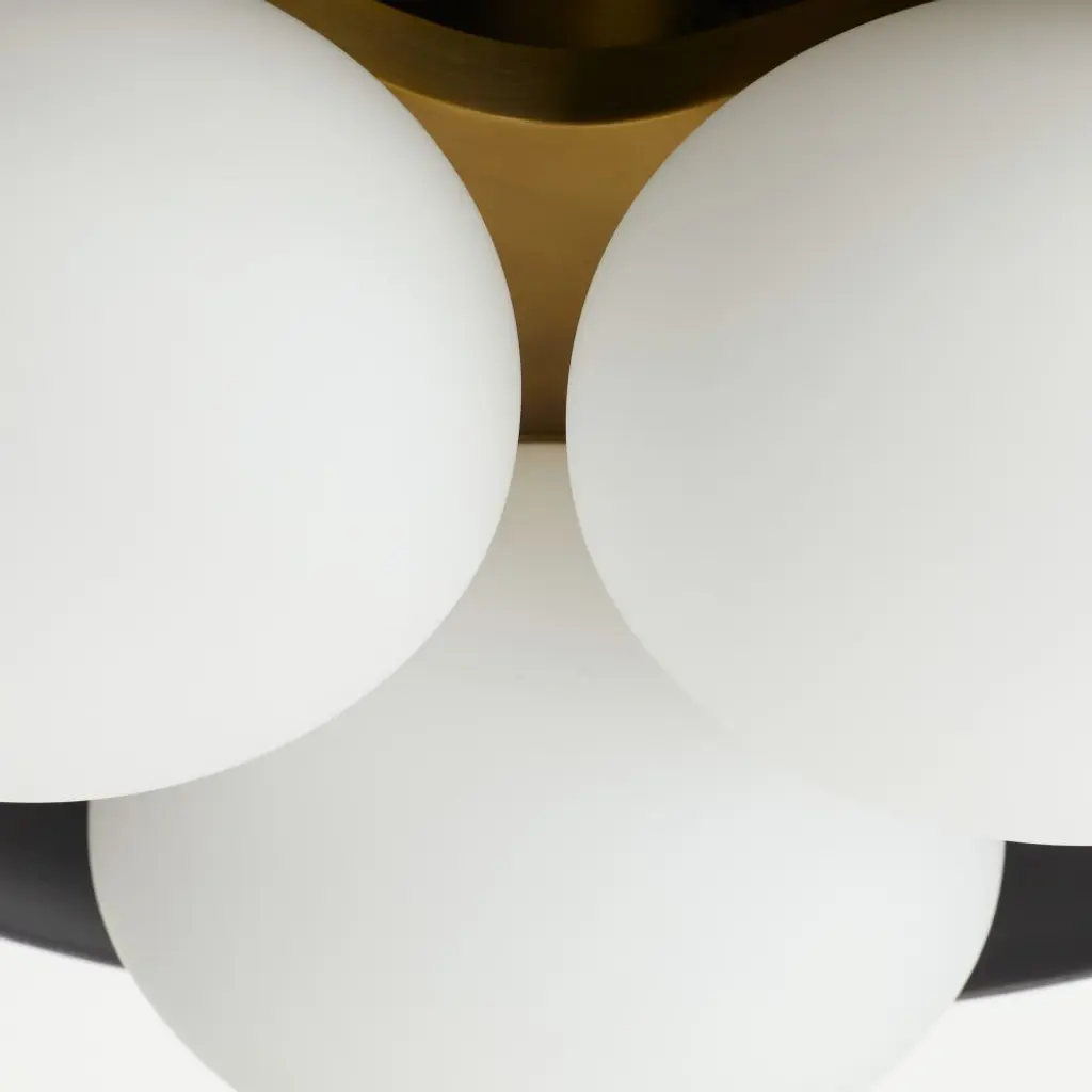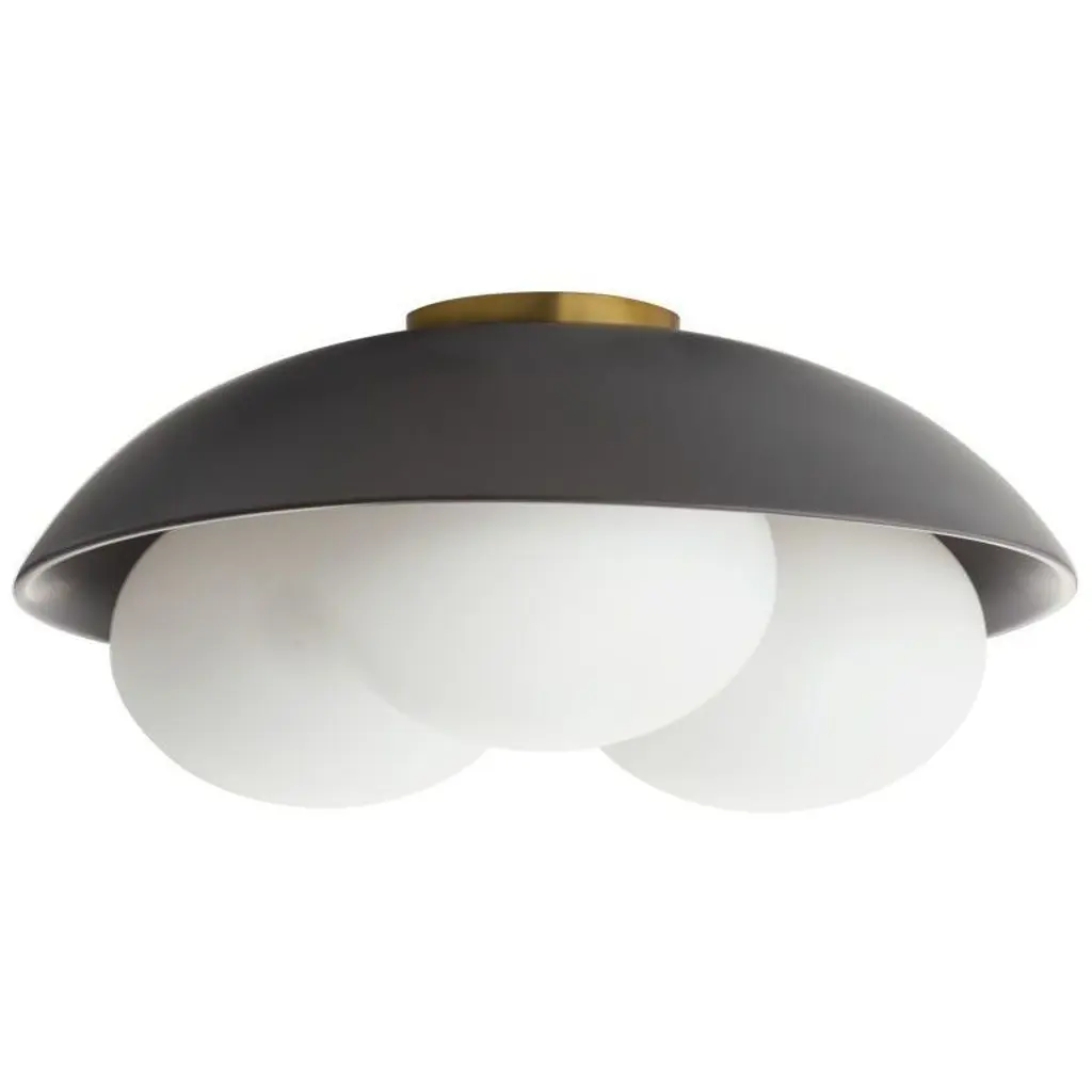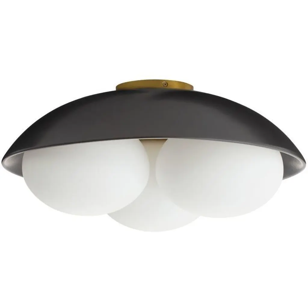 The Glaze large flushmount light fixture features a trio of Frosted Opal glass globes cocooned within a large Matte Black ceramic bowl and held by Antique Brass-Plated steel. The pairing of Soft Frosted lights and Matte Black ceramic shade casts a subtle, flattering glow and creates dramatic tension between traditional and modern materials and techniques. Damp-rated, although limited covered outdoor areas may affect finish.