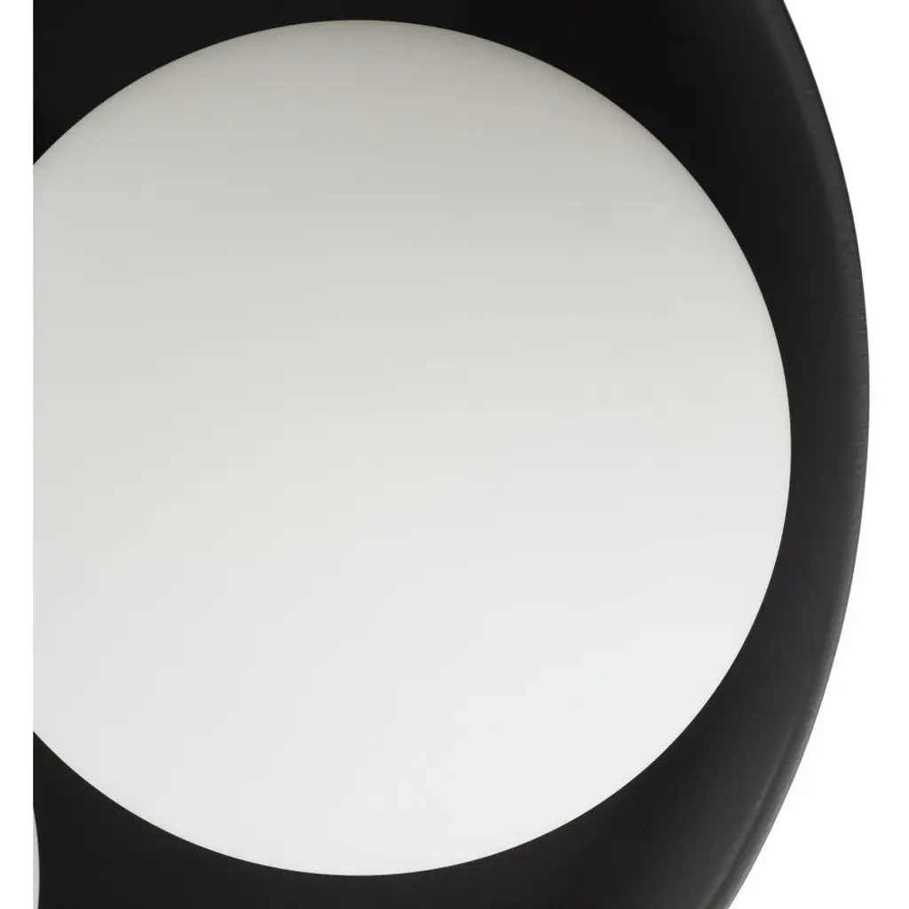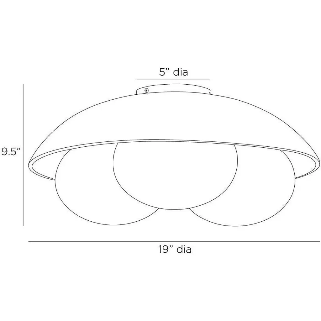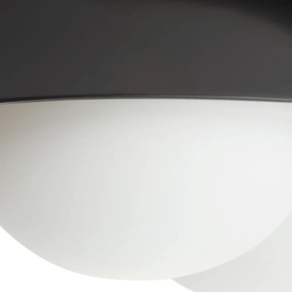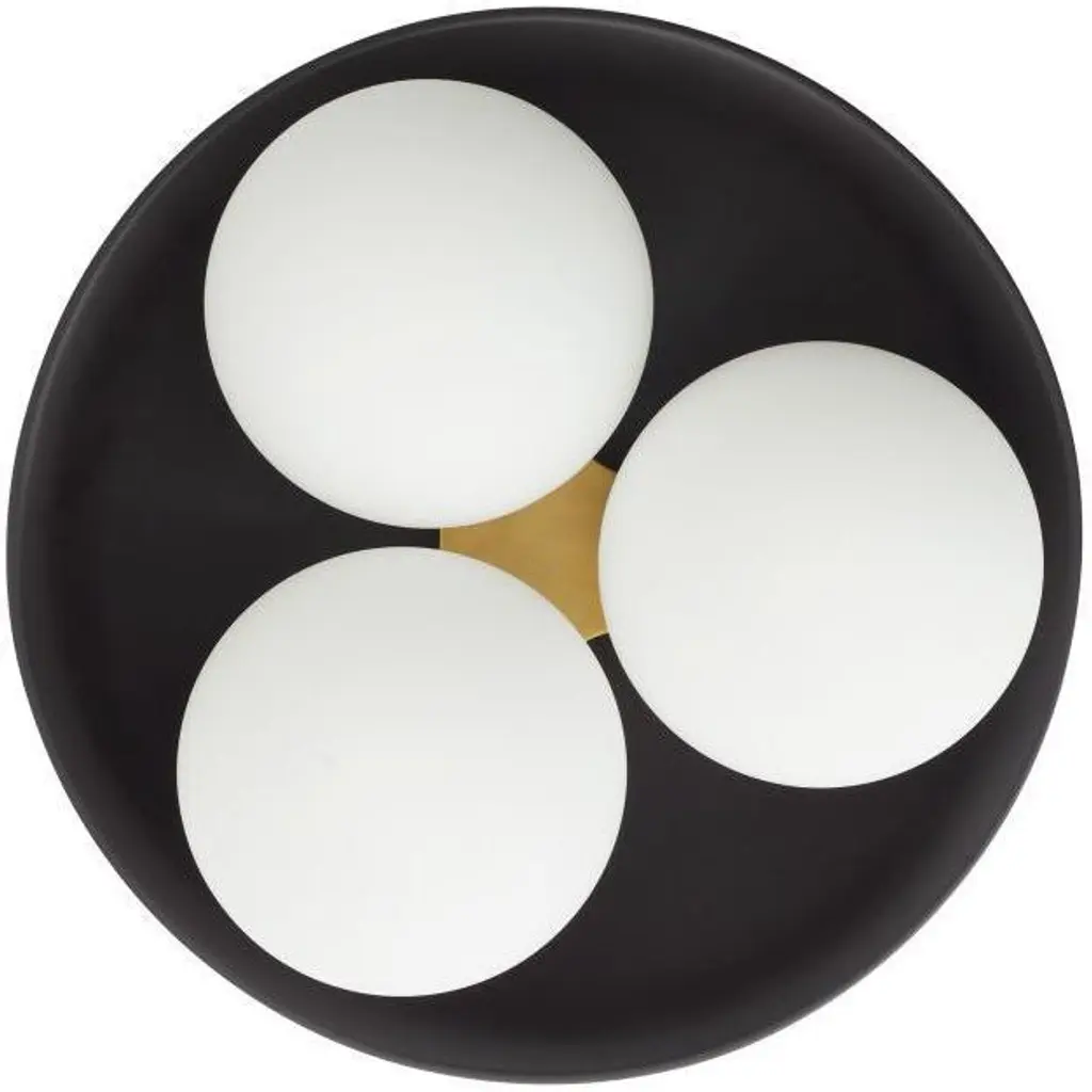 The Glaze large flushmount light fixture features a trio of Frosted Opal glass globes cocooned within a large Matte Black ceramic bowl and held by Antique Brass-Plated steel. The pairing of Soft Frosted lights and Matte Black ceramic shade casts a subtle, flattering glow and creates dramatic tension between traditional and modern materials and techniques. Damp-rated, although limited covered outdoor areas may affect finish.