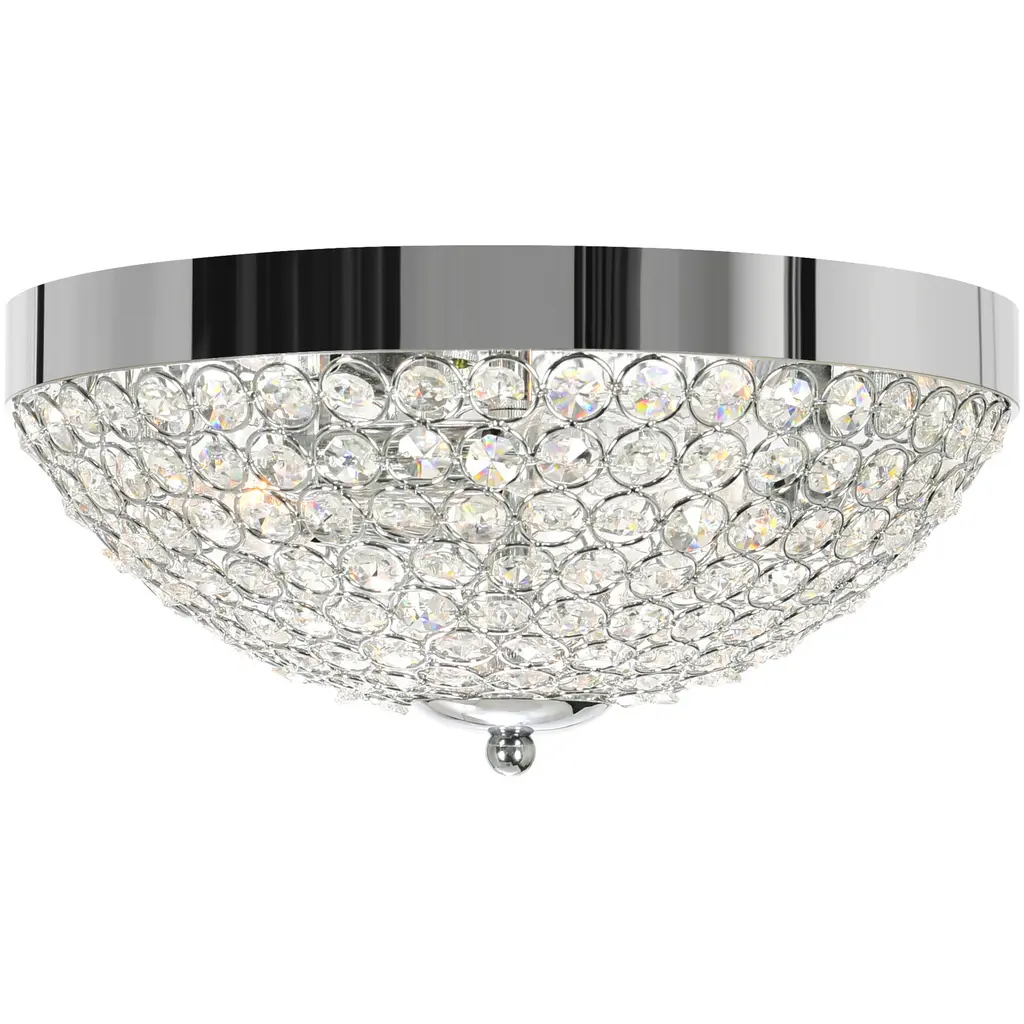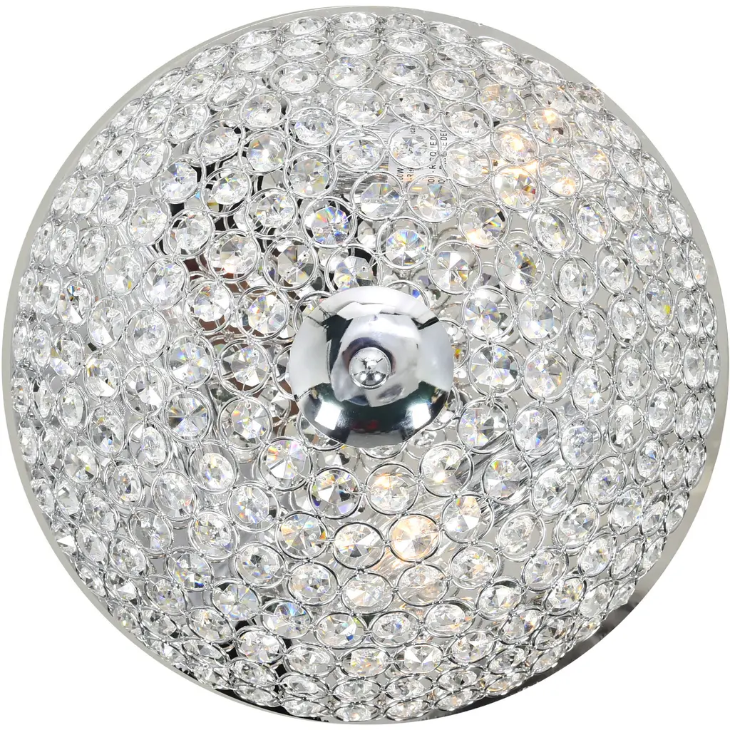 Add a pop of glamour to your interiors with the CWI Lighting 12'' Chrome Bowl Flush Mount from the Globe Collection. Designed with a bowl-shaped shade densely covered in shimmering crystals, this fixture instantly elevates the ambiance of any room. The polished chrome finish enhances the sparkle while maintaining a contemporary edge. Whether placed in a hallway, bedroom, or foyer, this 3-light flush mount brings luxury to your ceiling with a radiant twist. Finish: Chrome Light Count: 3 Light Source: E12 Bulbs (not included) Adjustable Hanging Height: N/A Flush Mount Material: Metal & Crystal Style: Glam / Modern