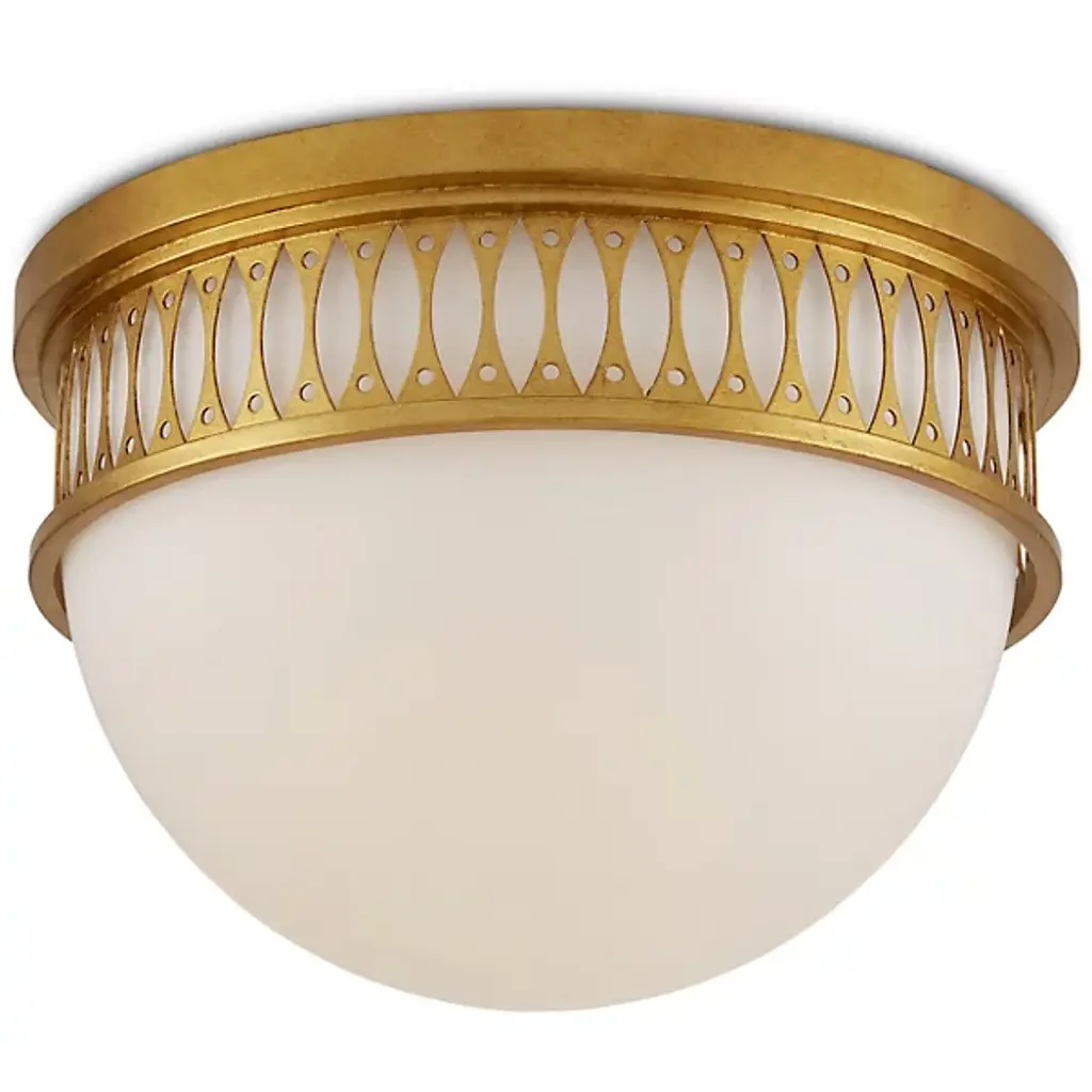 A white acrylic shade is slotted between two sheets of wrought iron with circular cutouts, which are offset to create half-moon shapes. The opaque finish of the shade and the bottom diffuser provides a soft, flattering glow when the fixture is on, one that complements the warm brass finish of the iron. Hardwired.