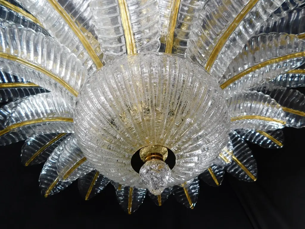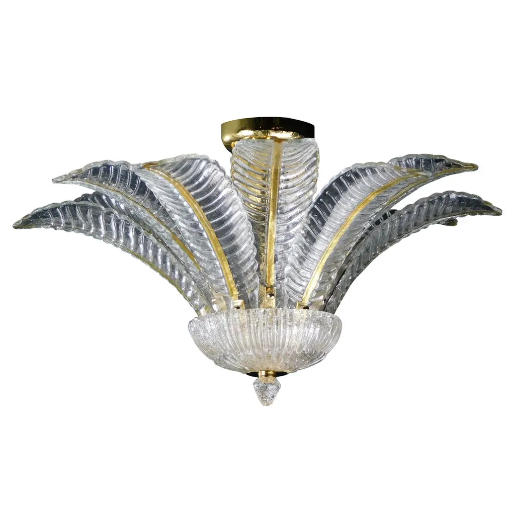 Italian flush mount with clear hand blown Murano Felci fern glass leaves infused with gold, mounted on 24 k gold finish metal frame by Fabio Ltd / Made in Italy9 lights / E26 or E27 type / max 60W eachMeasures: Diameter 39.5 inches, height 18 inchesOrder only / this item ships from ItalyOrder reference #: FABIOLTD C913