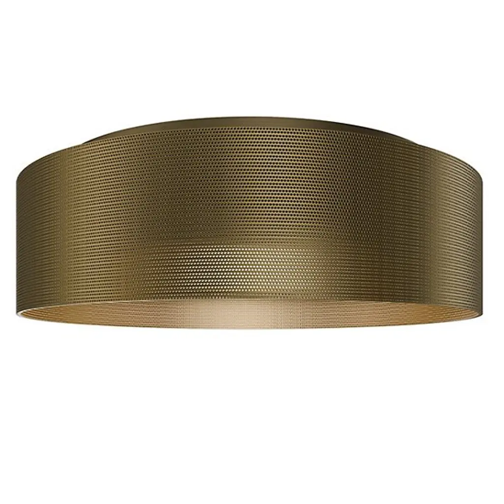 The Grille LED Flushmount from dweLED features a perforated cylindrical drum that creates visual texture through a pattern of small punctures across the metal surface. Light escapes through these tiny holes while a frosted glass layer underneath diffuses broader illumination, producing layered lighting effects. The drum sits close to the ceiling in a flushmount configuration, with the perforations adding dimensional interest to an otherwise simple geometric form. The fixture’s metal construction provides structure, while integrated LEDs offer adjustable color temperature.