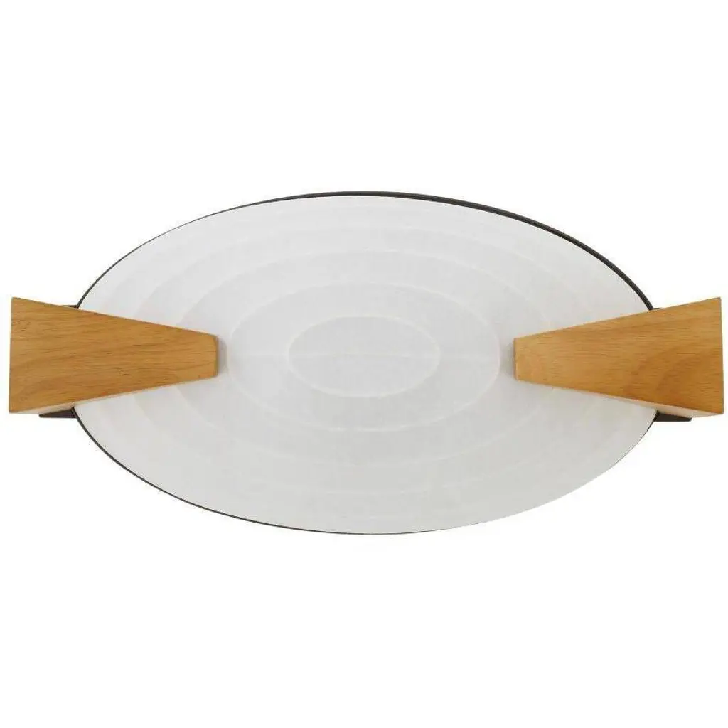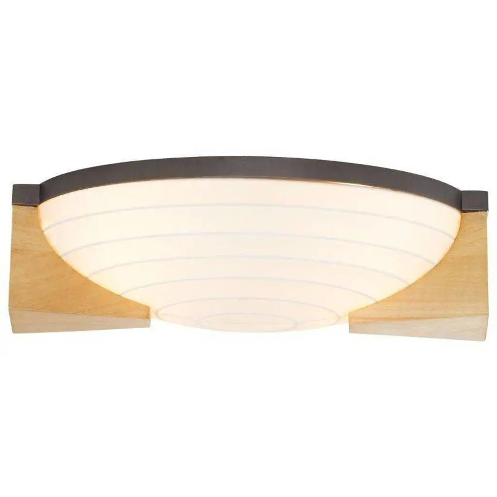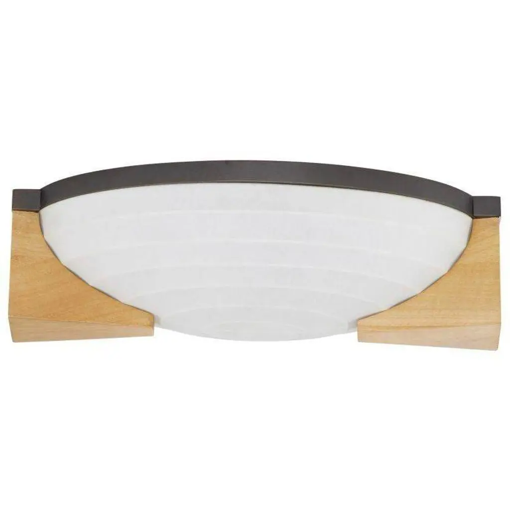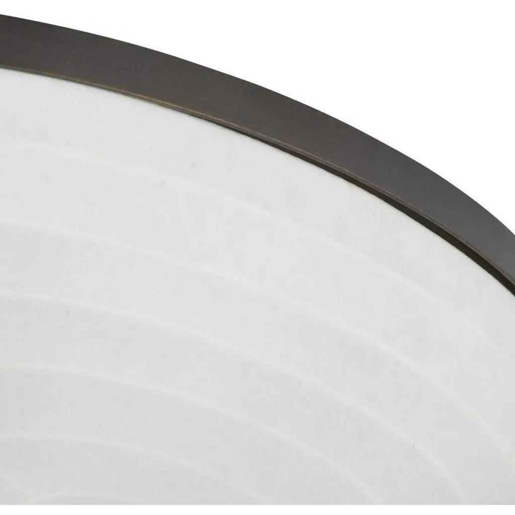 The stepped form of modern architecture informs this stylish flush mount. An extroverted piece molded from our new ivory faux vellum is bracketed by accents of oyster-hued wood. Suspended from an English bronze-plated steel canopy. Finish will vary.Damp-rated, although limited covered outdoor areas may affect finish.