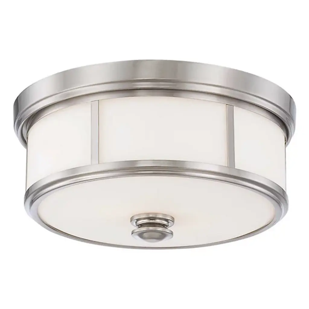 Geometric glass shade with tiered metal frame. The Harbour Point Flushmount by Minka-Lavery is a versatile and practical addition to your home. It has a dome-shaped etched opal glass diffuser encasing halogen bulbs (sold separately) to offer warm, ambient illumination. Sleek metal accents like the bottom ring and thin crossbars add a decorative touch and provide structural support. Round finial at the bottom completes the design on a traditional note. Install this luminaire in the living room, hallway, or bedroom to bring practical lighting and instill minimal charm.