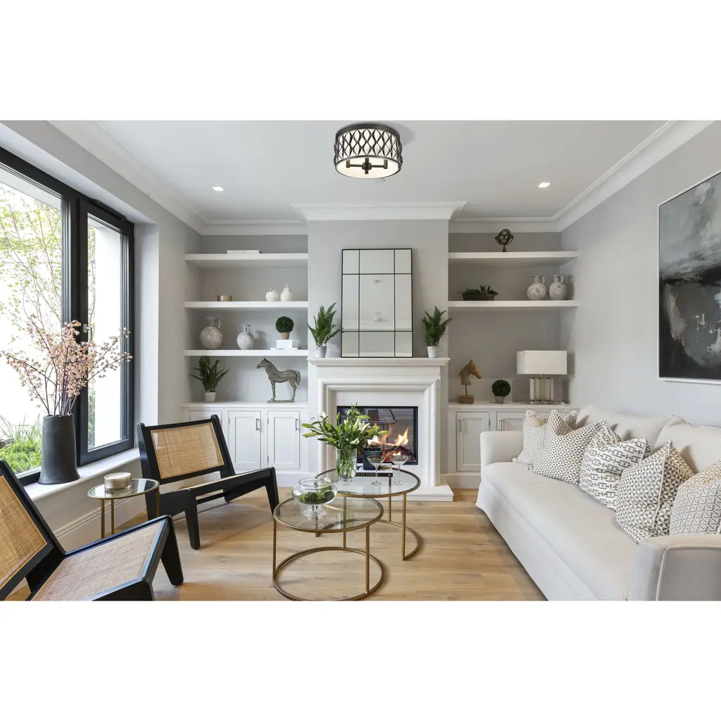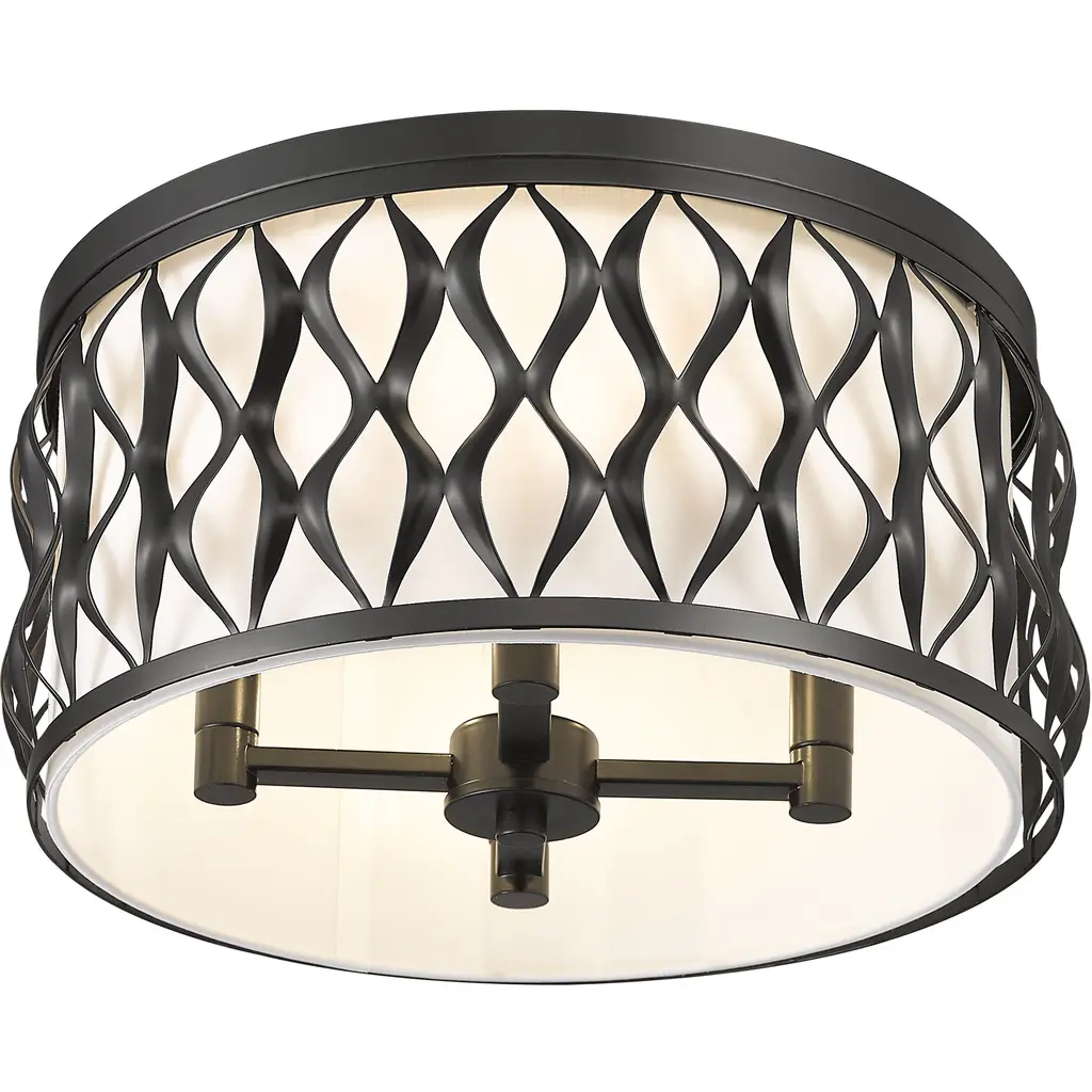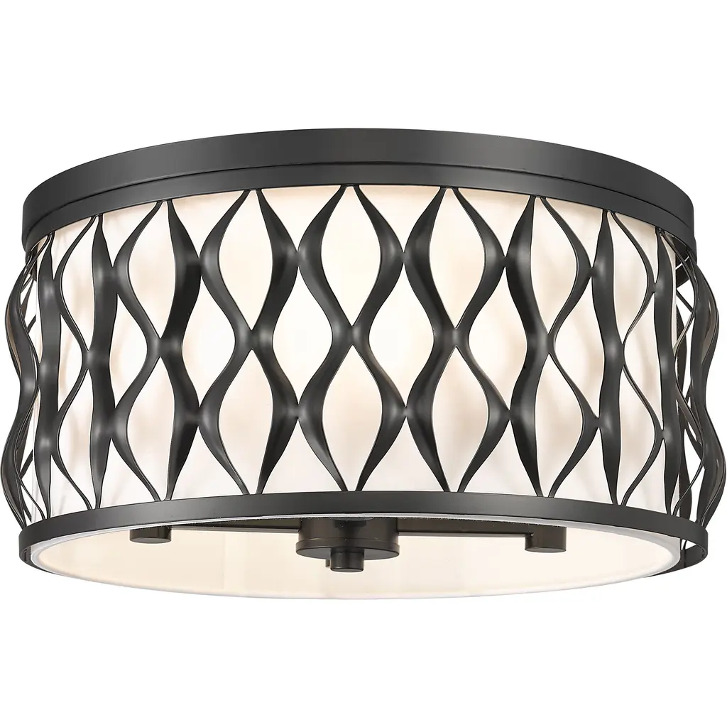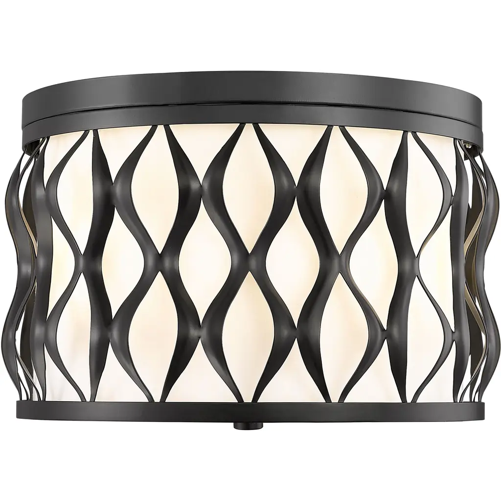 Sculptural transitional artisan flavor is perfect for any setting as this matte black finish steel four-light flush mount ceiling light captures deserved attention. Living rooms, dining spaces, and foyers receive a timeless style motif with a drum-shaped fixture featuring symmetrical ribbon waves cascading vertically, banded on both edges. A white diffuser filters glowing light, creating superb optical ergonomics.