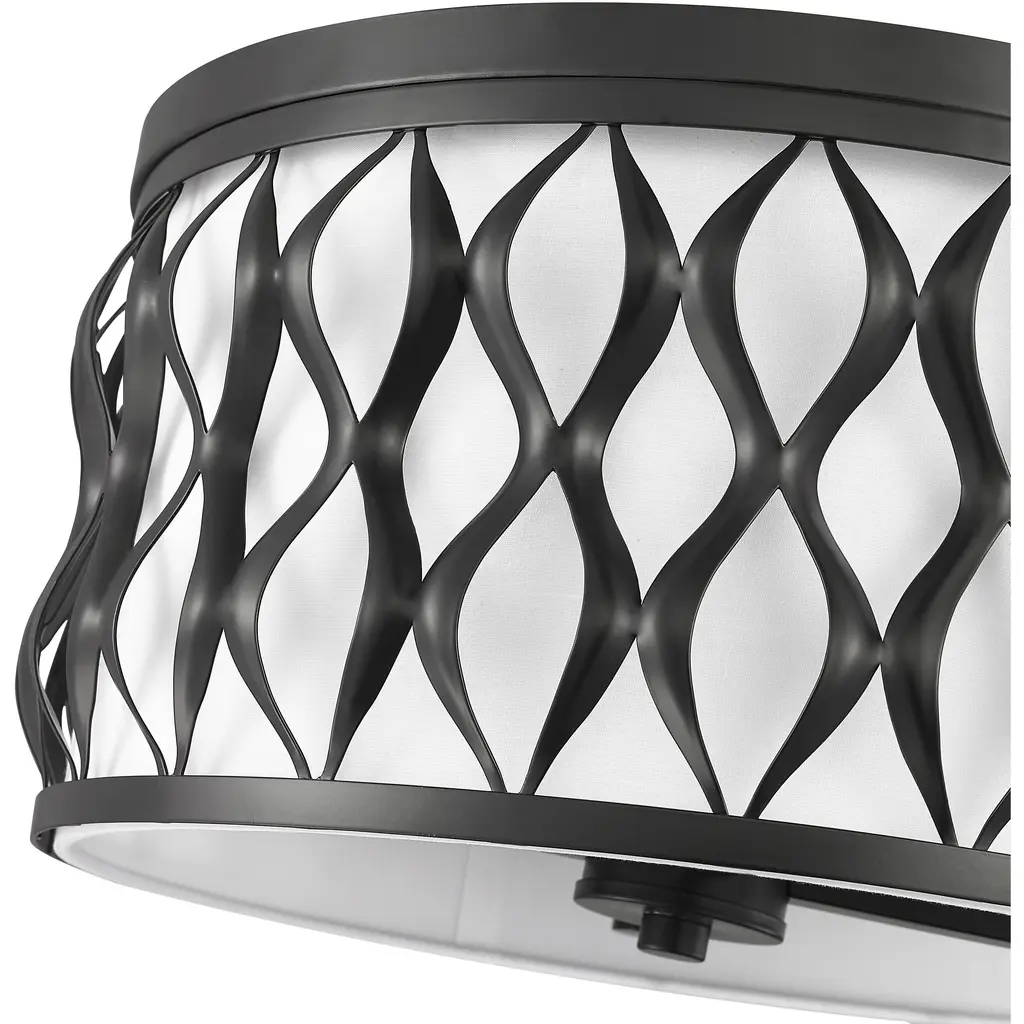 Sculptural transitional artisan flavor is perfect for any setting as this matte black finish steel four-light flush mount ceiling light captures deserved attention. Living rooms, dining spaces, and foyers receive a timeless style motif with a drum-shaped fixture featuring symmetrical ribbon waves cascading vertically, banded on both edges. A white diffuser filters glowing light, creating superb optical ergonomics.
