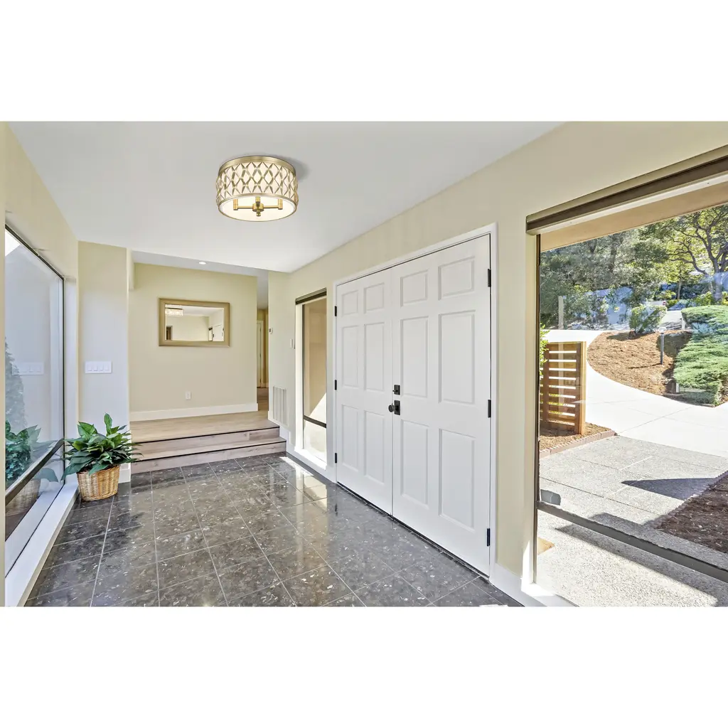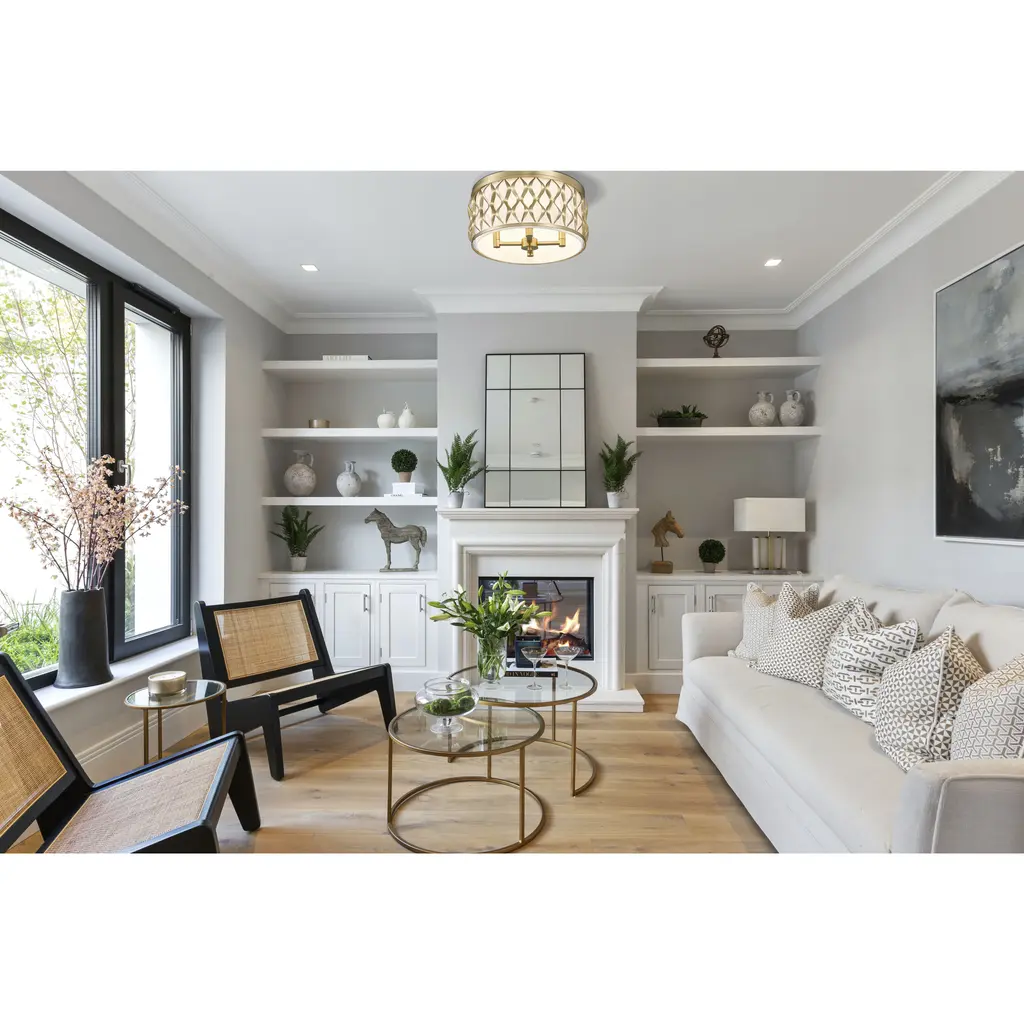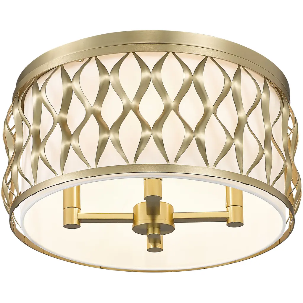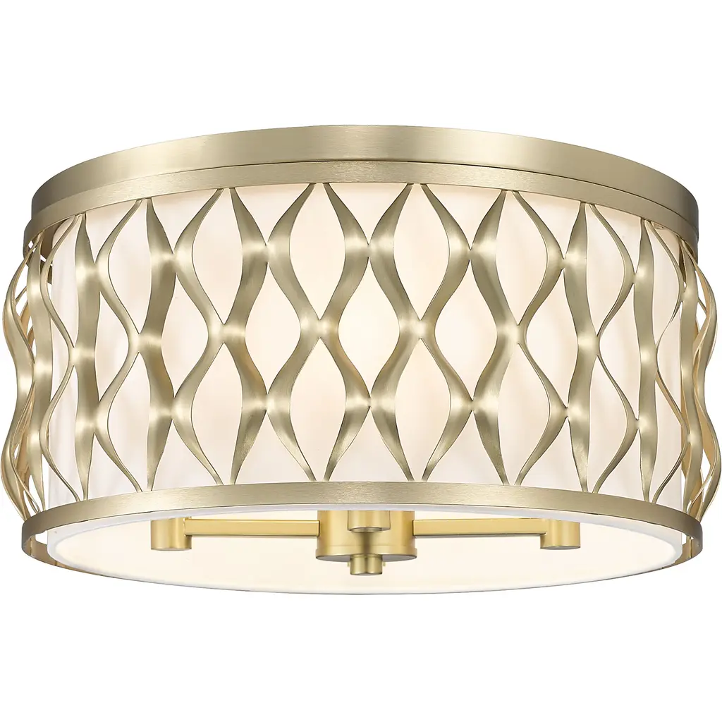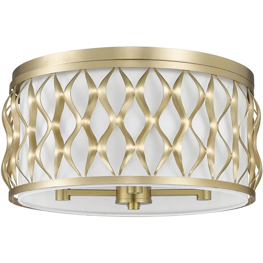 Sculptural transitional artisan flavor is perfect for any setting as this modern gold finish steel four-light flush mount ceiling light captures deserved attention. Living rooms, dining spaces, and foyers receive a timeless style motif with a drum-shaped fixture featuring symmetrical ribbon waves cascading vertically, banded on both edges. A white diffuser filters glowing light, creating superb optical ergonomics.