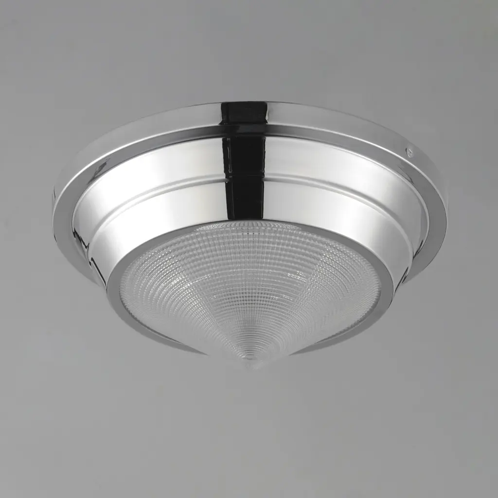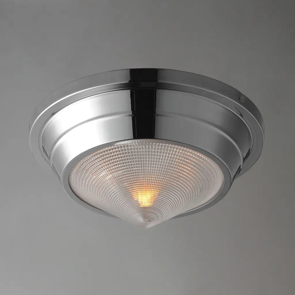 A prismatic diffusion of light is housed within pressed cone glass shades. Choose from pendants with tapered metal halves that conceal the light source or glass shades that are supported by a metal ring. Coordinating bath vanity lights complete the collection.