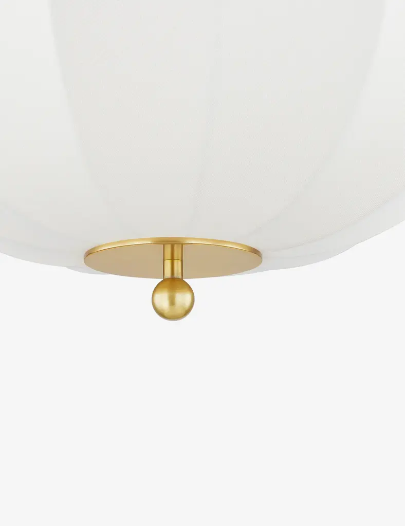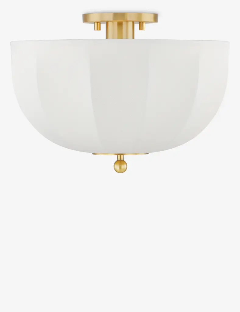 Light pours from an umbrella shade to evoke Danish mid-century style in the Harker flush mount. This chic ceiling light's antique brass finish offers warmth and polish with a petite finial and minimalist ceiling plate, adding the perfect touch of vintage charm. The compact profile is perfect for statement lighting in a smaller space design.