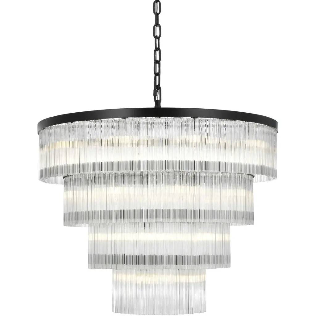 Turn your space into a glowing masterpiece with this striking pendant light, crafted from durable iron and shimmering clear ribbed glass. The cascading layers create a stunning interplay of light and shadow, refracting illumination into a radiant display that transforms your space into an illuminated work of art. Available in chrome for a sleek, contemporary aesthetic, black for bold contrast, and satin gold for an inviting warmth, this pendant light is as versatile as it is beautiful. Whether you choose a single tier for minimalist charm, two tiers for balanced depth, three tiers for bold presence, or four tiers for show-stopping grandeur, theres an option for every setting. Featuring both round and rectangular frame designs, this fixture adapts to any space with ease. Complete with a matching canopy and chain, and fully dimmable for customized lighting, this pendant pairs perfectly with the coordinating single-tier flush mount and wall sconce collection, ensuring a cohesive, radiant design throughout your home or office. Please note: light bulbs are sold separately.