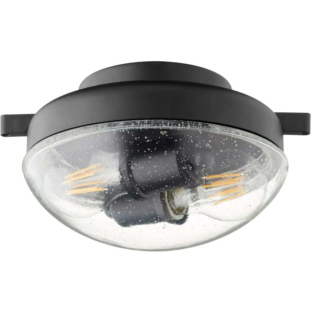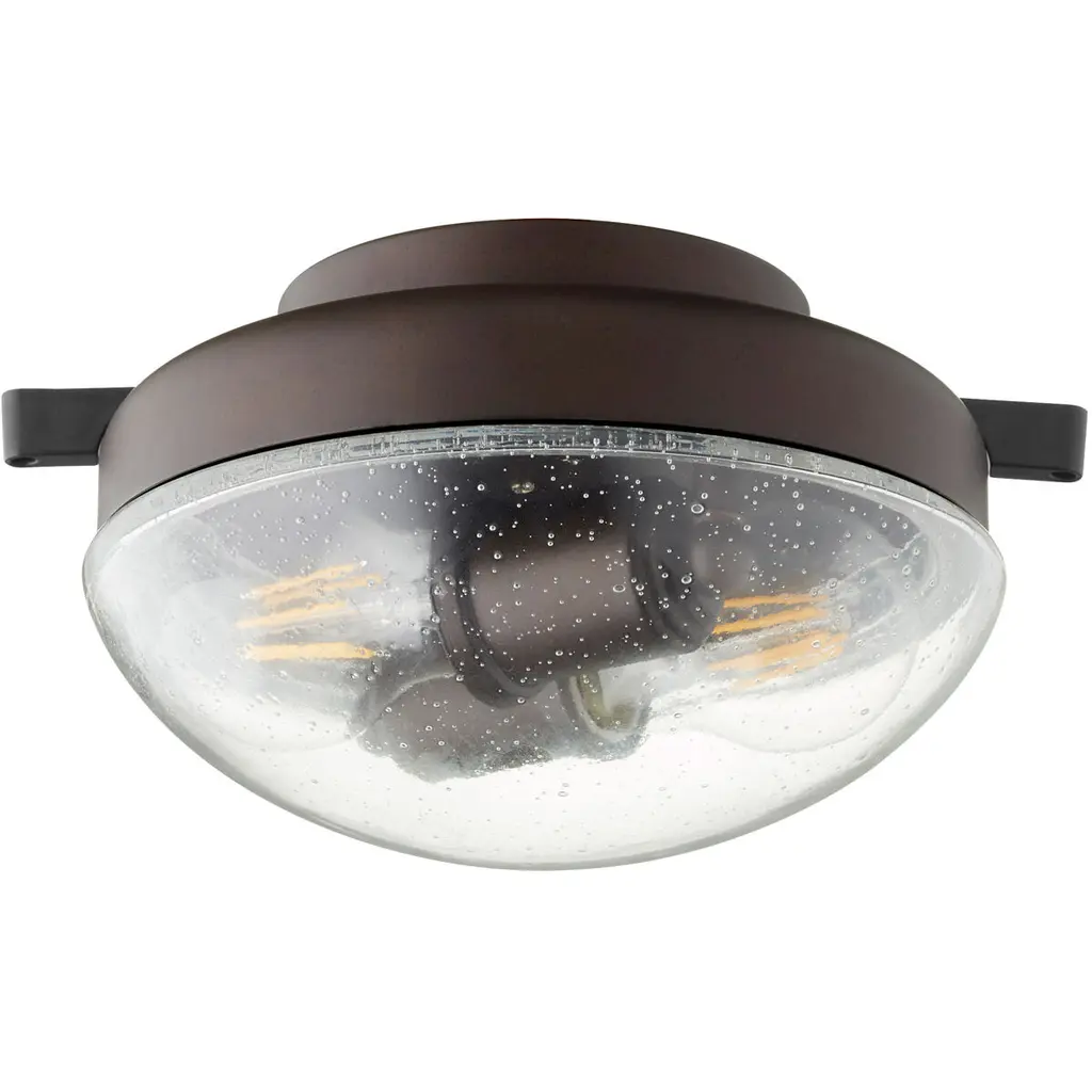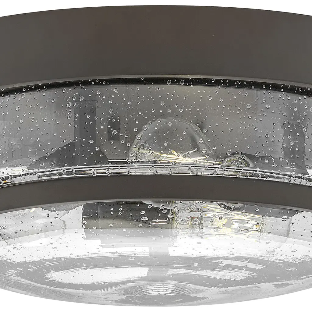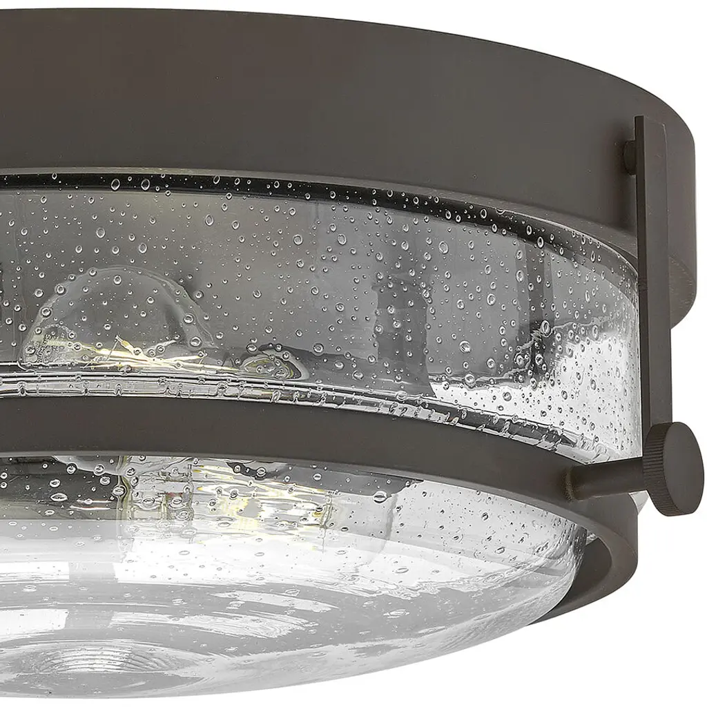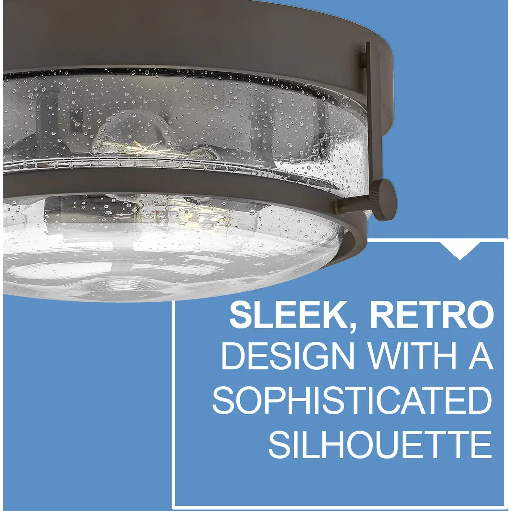 Harper's sleek, retro design elevates the traditional flush mount with a unique clear seedy glass bound by a prominent metal ring and decorative knobs available in five classic finishes.