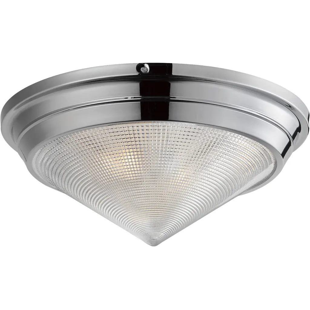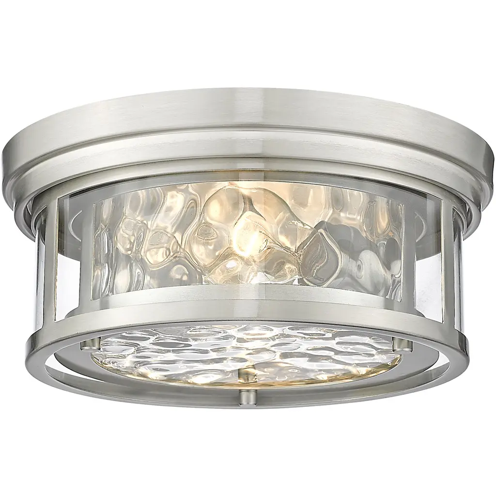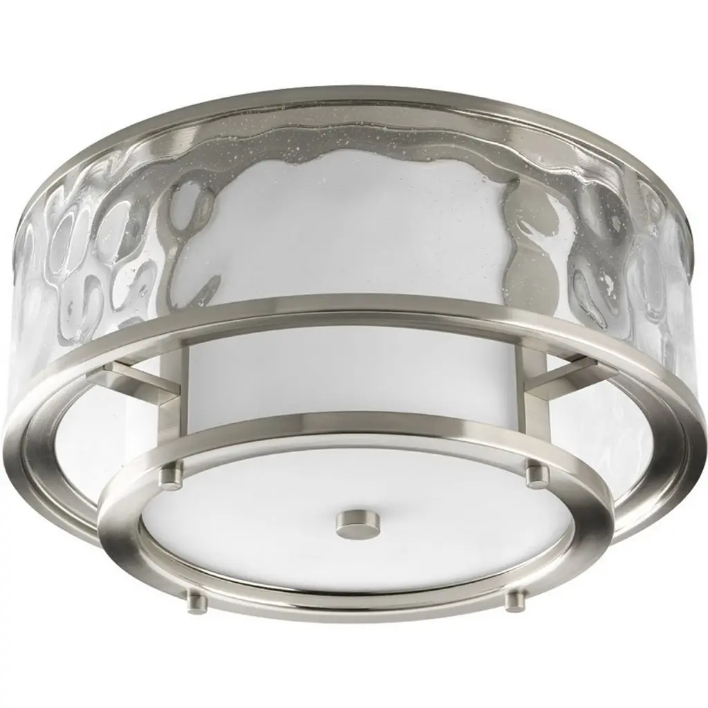 Maximize the space overhead with the low-profile yet bold design of the Harper Flush Mount from Hinkley Lighting. The flushmount takes its design cues from industrial luminaires. It displays its enduringness with a pair of steel ring frames. The bottom frame pops with protruding industrial accents. Nestled inside is a clear seedy glass shade that visually moves with sweeping curves. The rich texture of the shade softly conceals the image of the bulbs inside. This seedy texture catches energizing highlights with the lamping sending through a radiant glow.