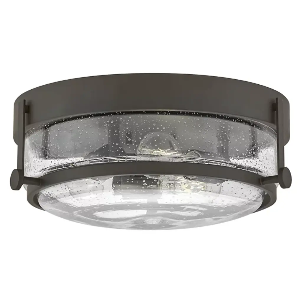 Maximize the space overhead with the low-profile yet bold design of the Harper Flush Mount from Hinkley Lighting. The flushmount takes its design cues from industrial luminaires. It displays its enduringness with a pair of steel ring frames. The bottom frame pops with protruding industrial accents. Nestled inside is a clear seedy glass shade that visually moves with sweeping curves. The rich texture of the shade softly conceals the image of the bulbs inside. This seedy texture catches energizing highlights with the lamping sending through a radiant glow.