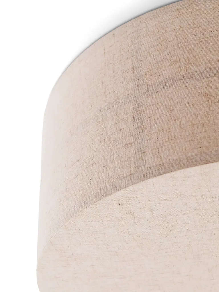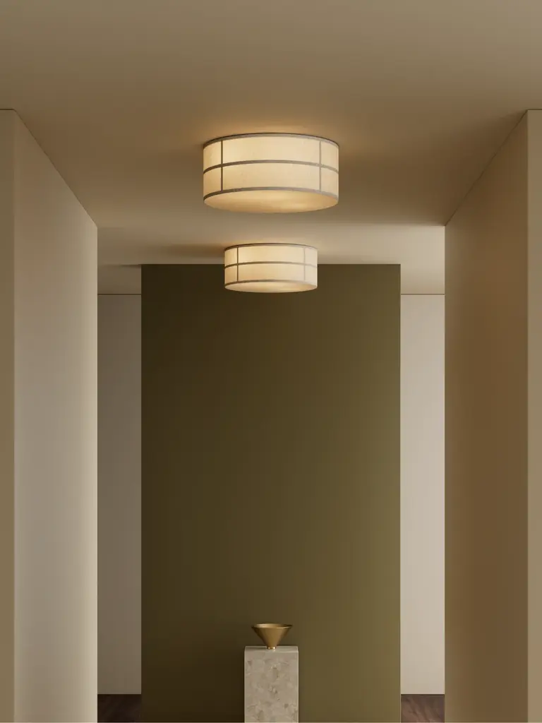 Sitting flush against a ceiling, the Hashira Ceiling Lamp reduces the characteristic elements of the lighting collection to their purest forms, creating a design that is as subtle as it is sophisticated. It emits ambient light into rooms, diffused through its textured linen shade. Bulb not included.