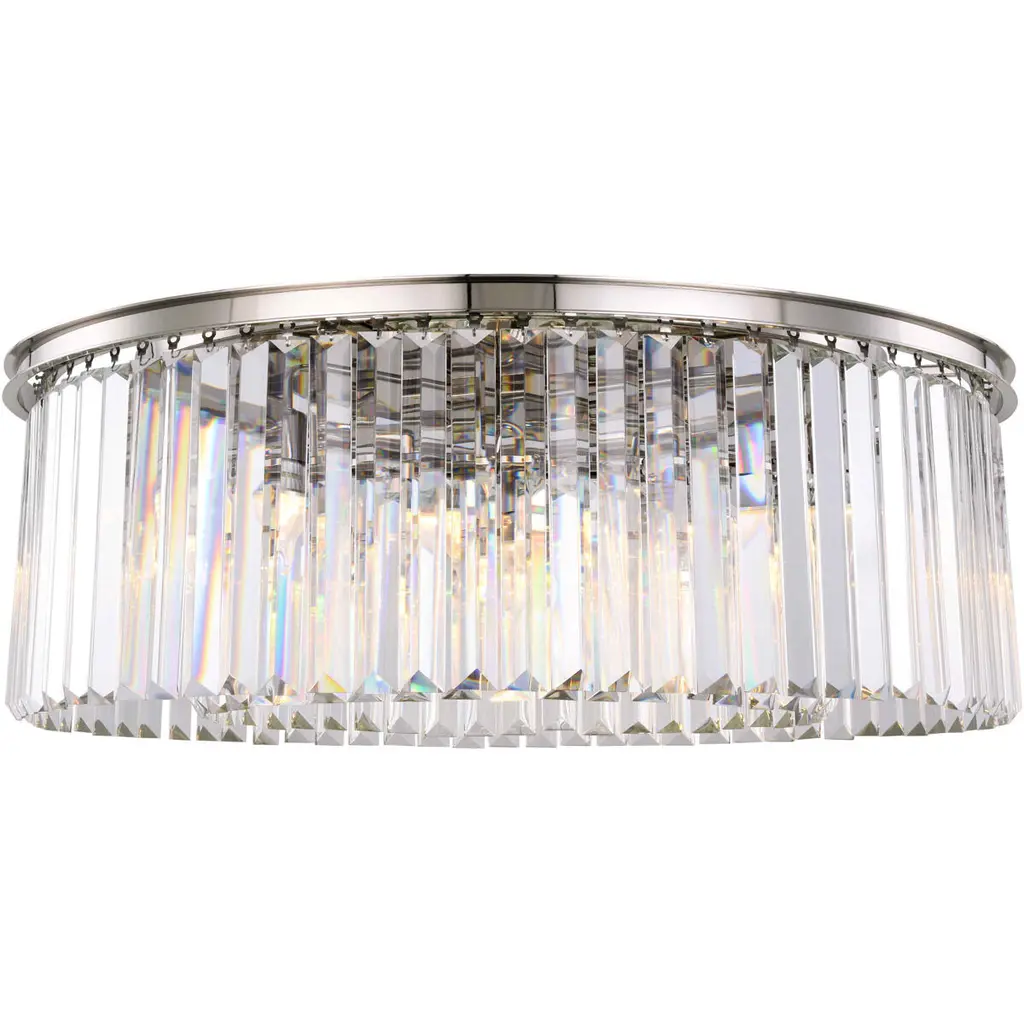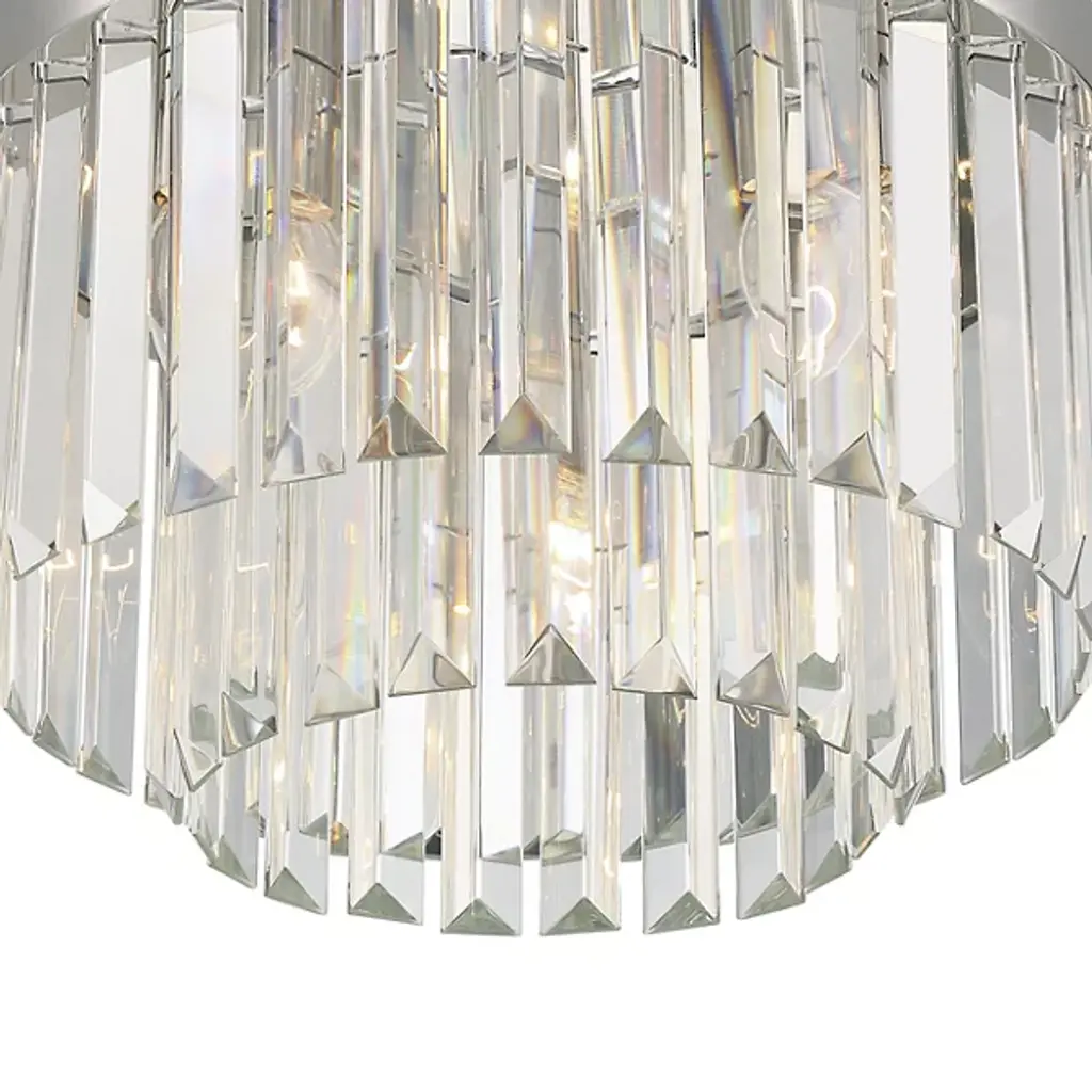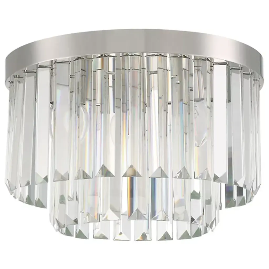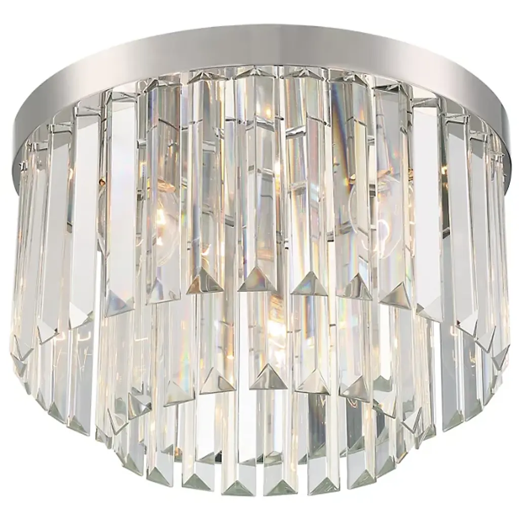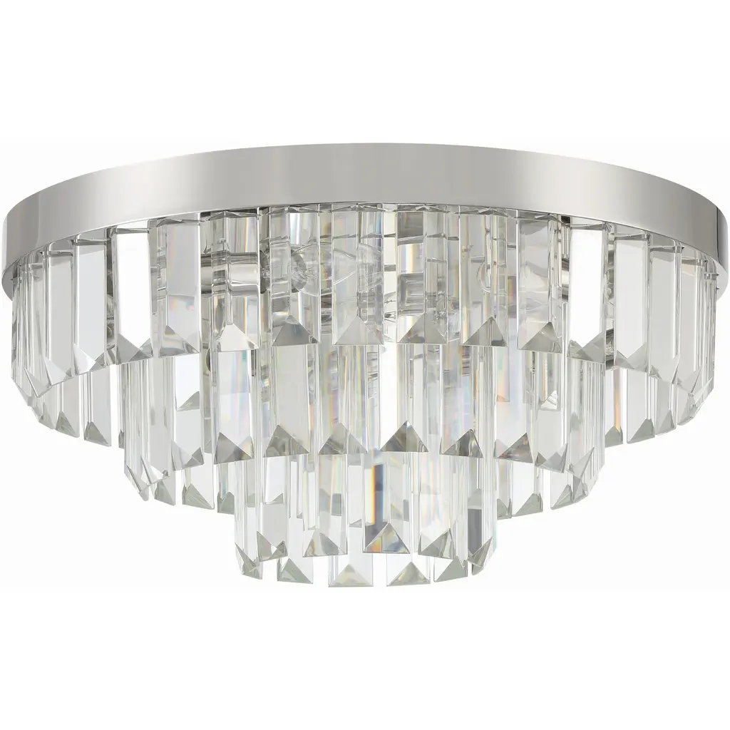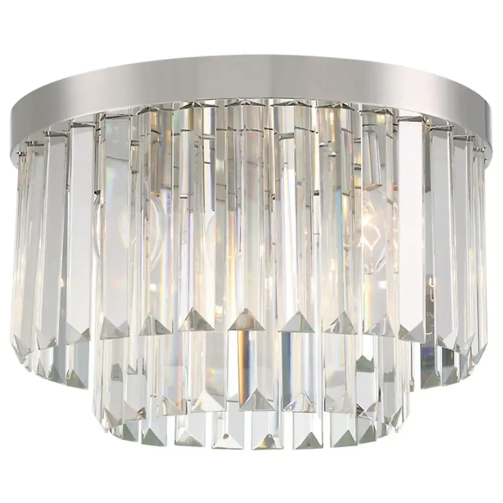 Experience the captivating allure of the Hayes Flushmount from Crystorama, designed to make a lasting impression. Every detail of this fixture has been meticulously crafted, showcasing tiered multi-faceted crystals delicately secured by a sturdy Polished Nickel steel frame. The sleek and polished finish adds a modern touch, infusing your surroundings with contemporary sophistication. More than just a lighting fixture, it is a work of art that captivates and commands attention, becoming the focal point of any room.